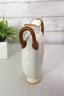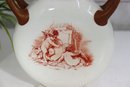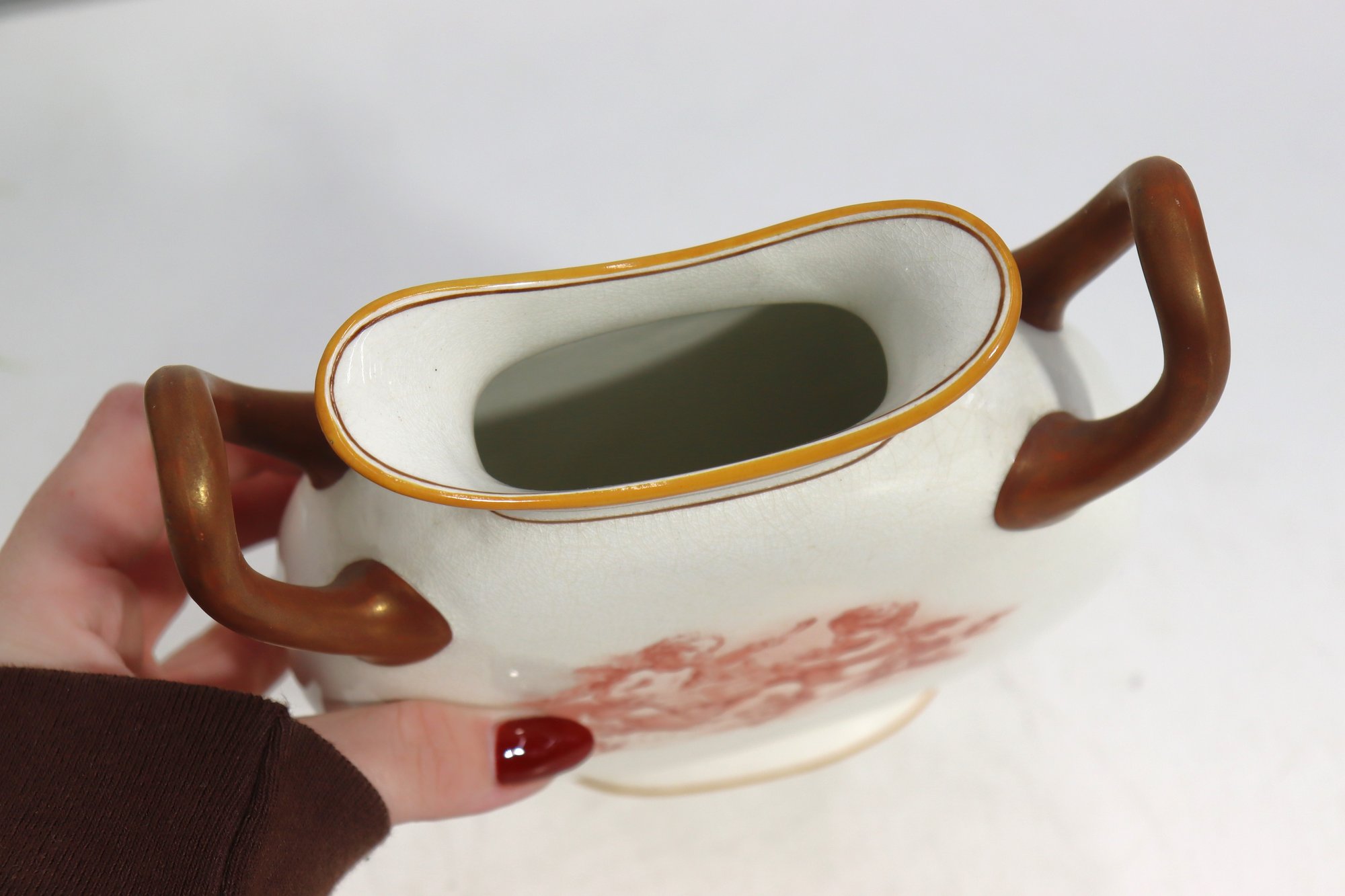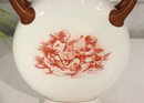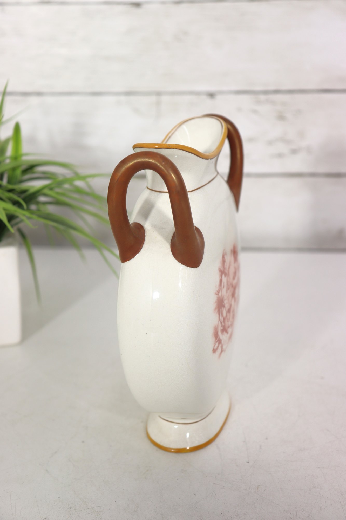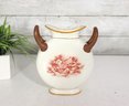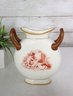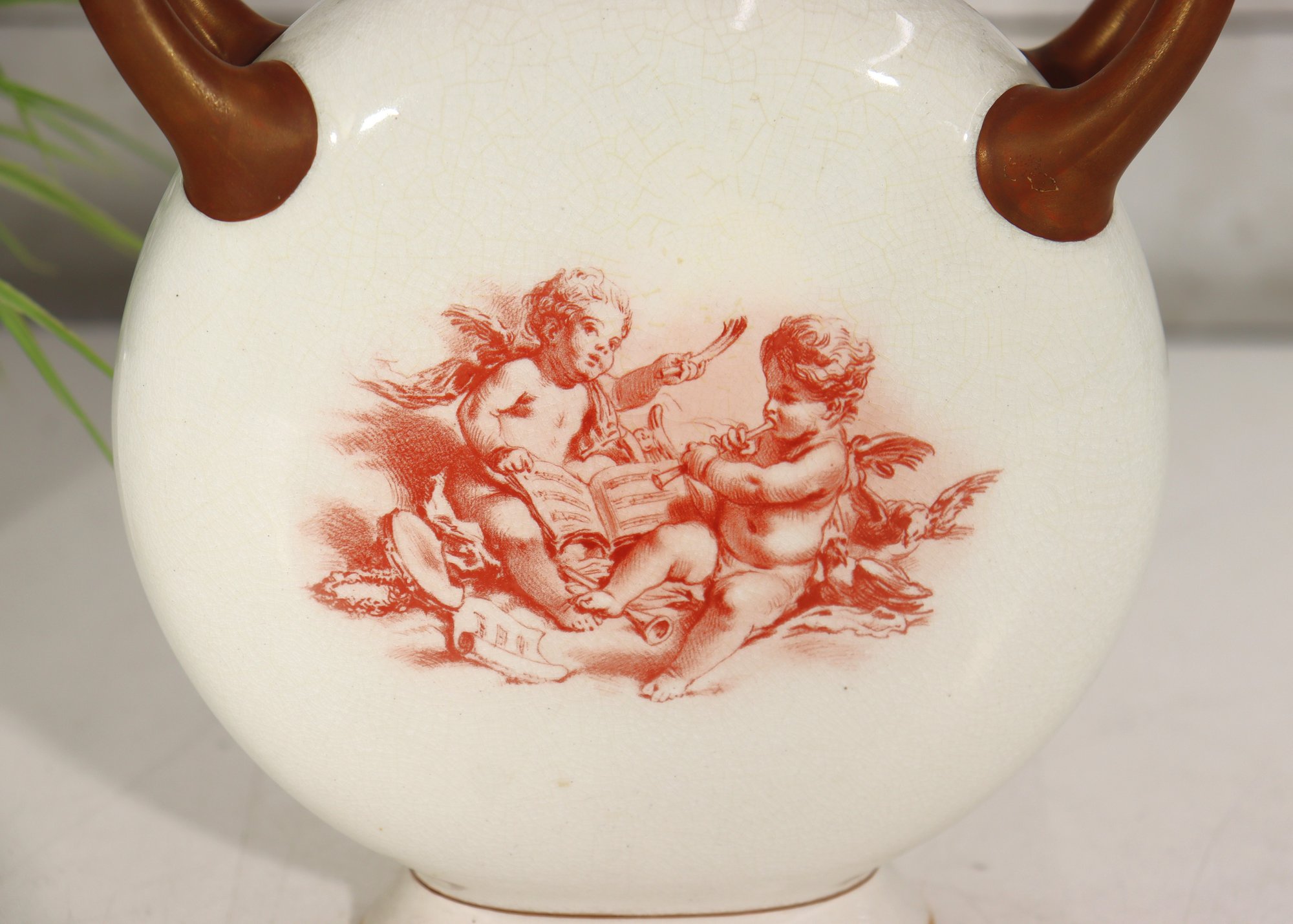 porcelain vase featuring a charming cherub (putti) transfer scene in warm rust/red tones. This beautifully balanced piece stands approximately 8 inches tall and showcases a classic urn-form silhouette with double applied handles in a contrasting brown glaze and gold trim accents along the rim and base.