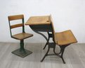 The desk chair features a swivel seat and an attached tabletop complete with a groove for pens and a circular hole that once held an inkwell. Its wood components display a warm patina that only comes from years of use and the loving touch of countless students. The dark green and black ironwork frame, marked by the graceful curves typical of early 20th-century design