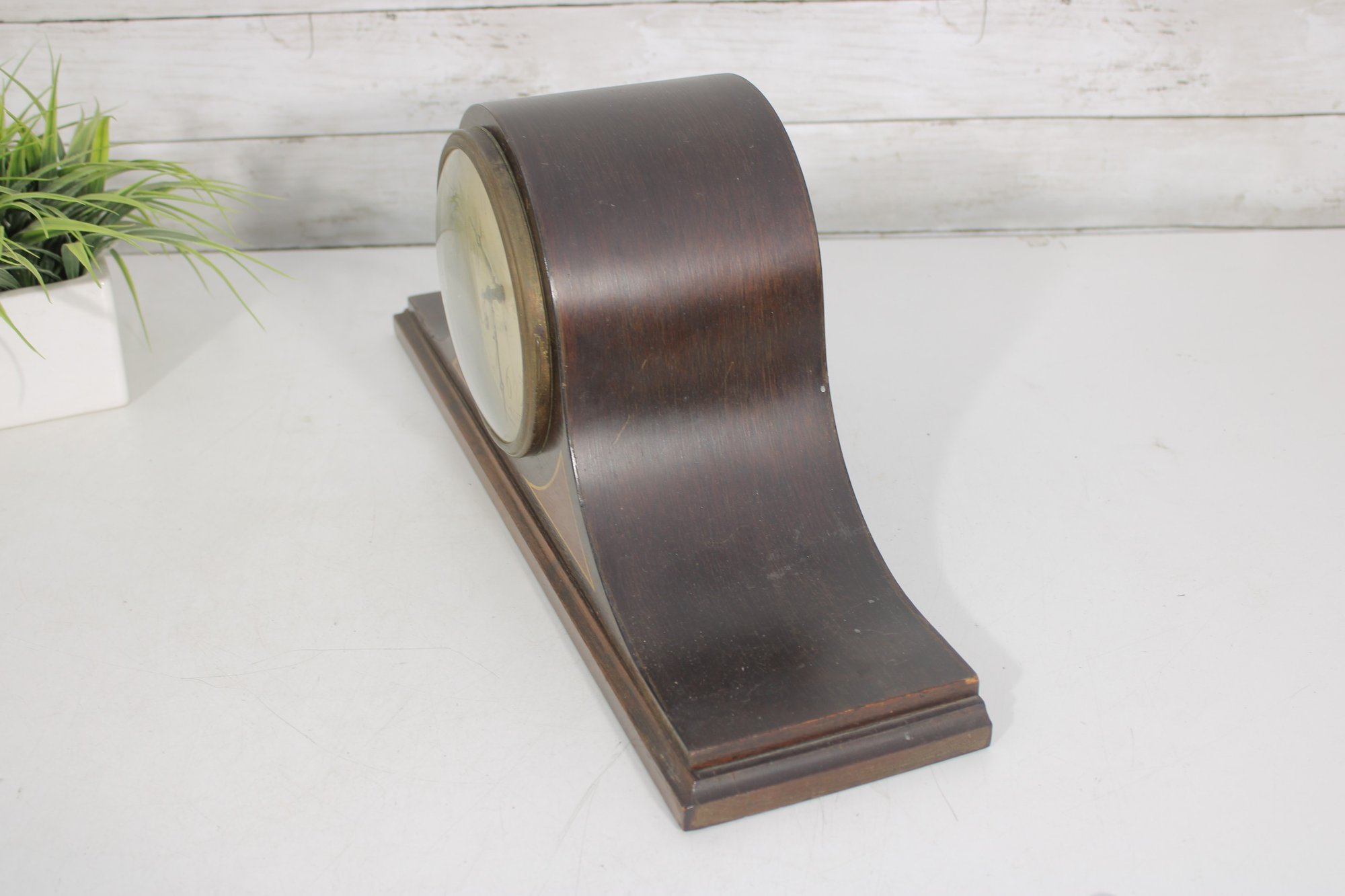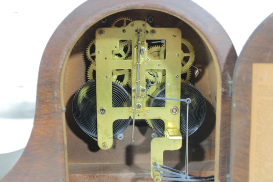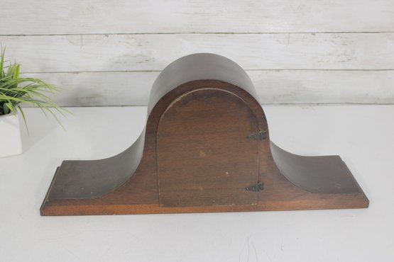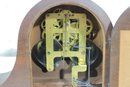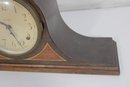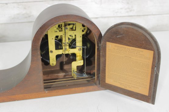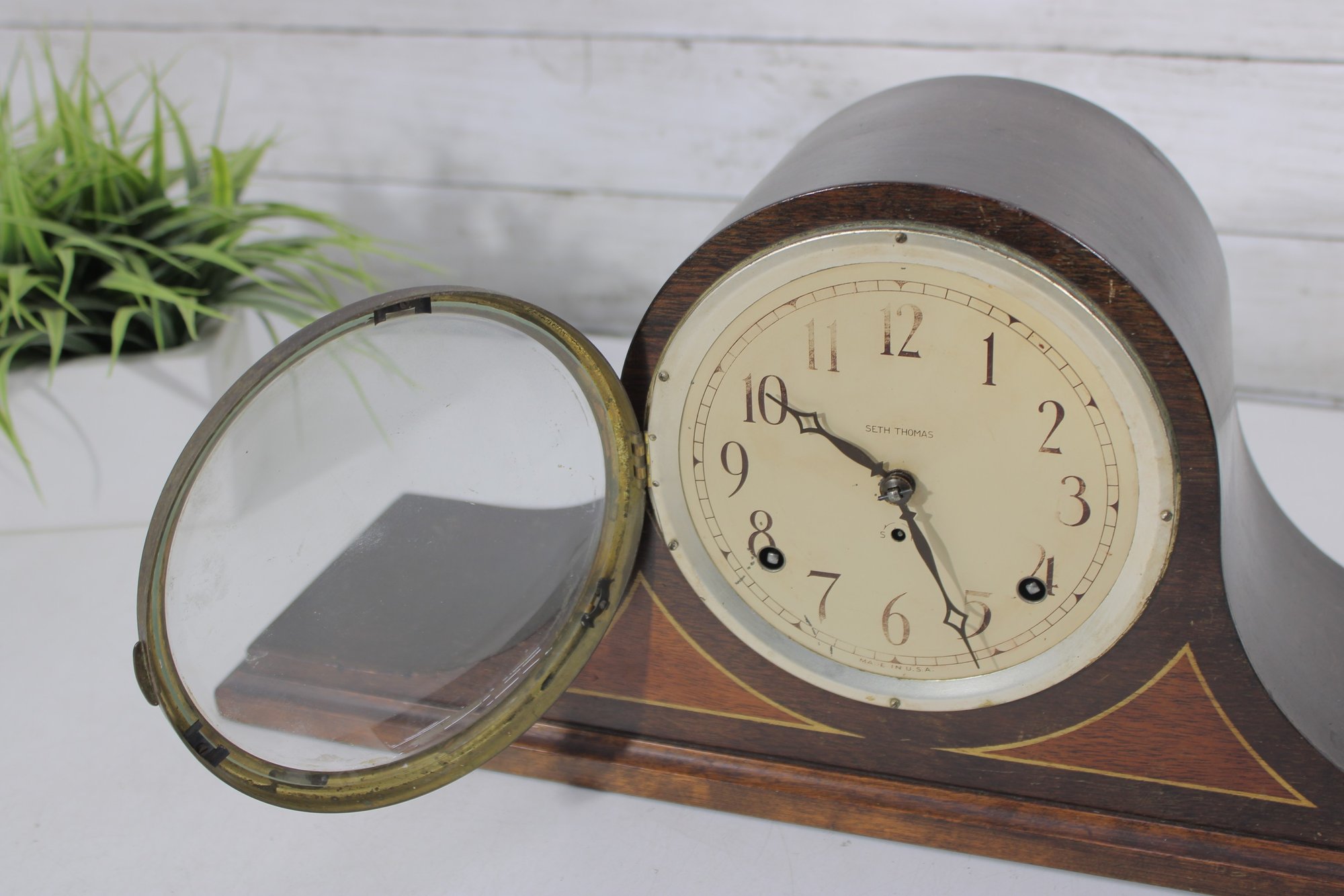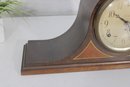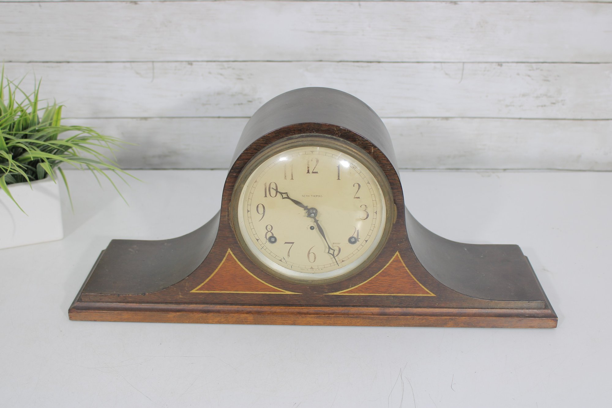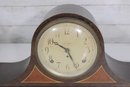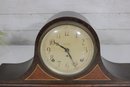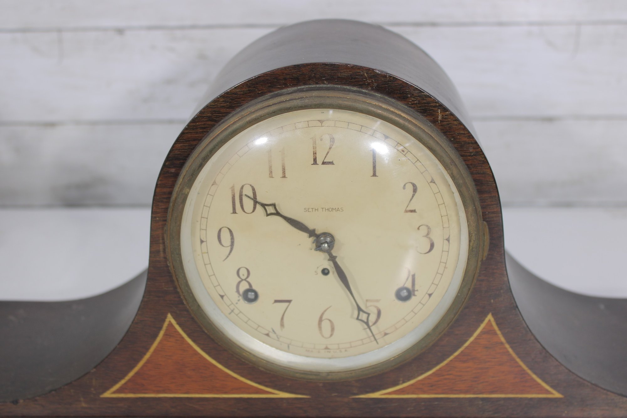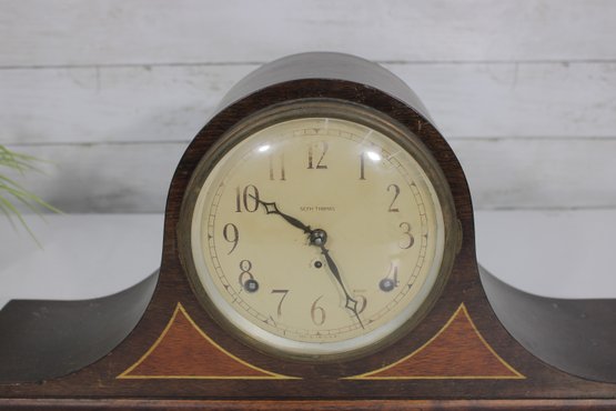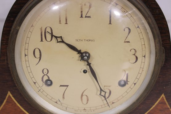 Classic antique Seth Thomas tambour-style mantel clock featuring a beautifully curved wood case and traditional Roman numeral dial. A timeless piece that adds warmth and character to any mantel, shelf, or office.