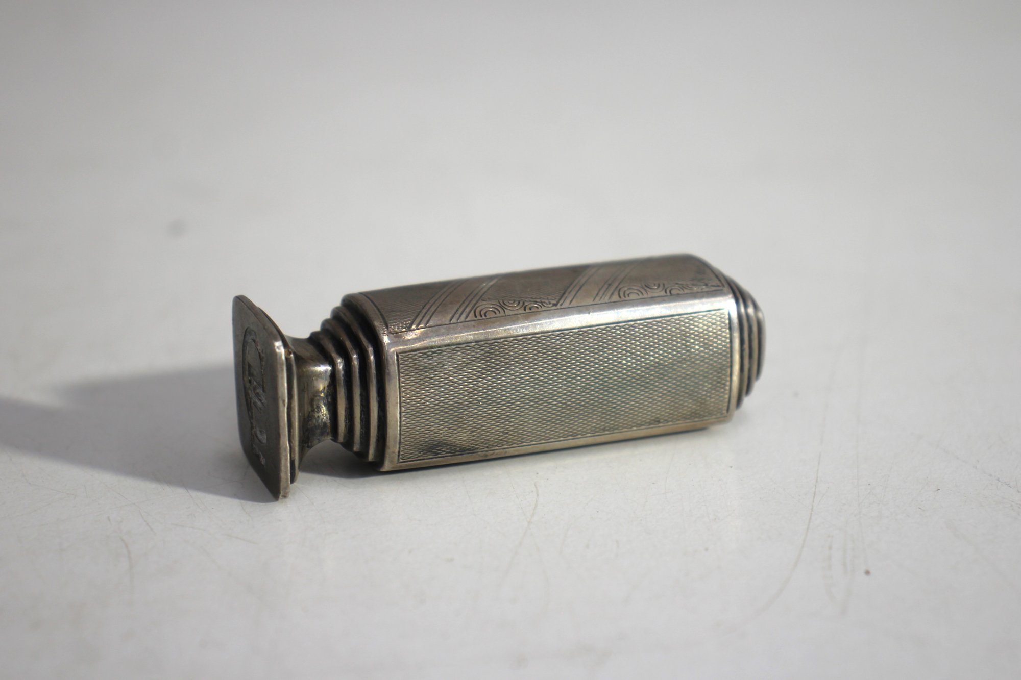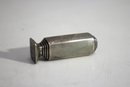 This auction features a charming antique silver plated stamp measuring 2.5 inches in height. The stamp boasts intricate geometric engravings and a unique cylindrical design. The base is adorned with an engraved monogram, adding a personalized touch to this exquisite piece.