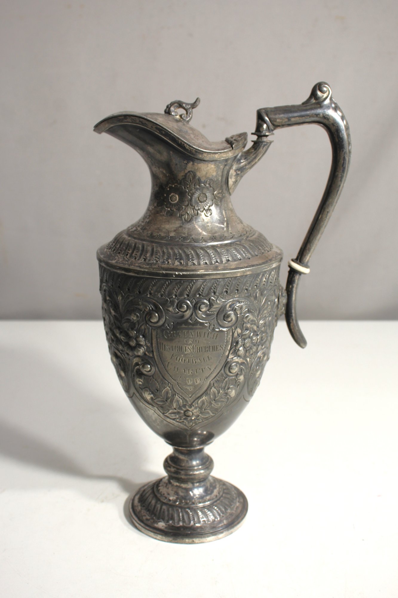 This stunning antique silver-plated ewer features an intricately engraved floral and scrollwork design, showcasing masterful craftsmanship. The detailed crest on the front commemorates a special event, adding a layer of historical significance. The hallmark inside the base provides authenticity, making this a collector's piece.