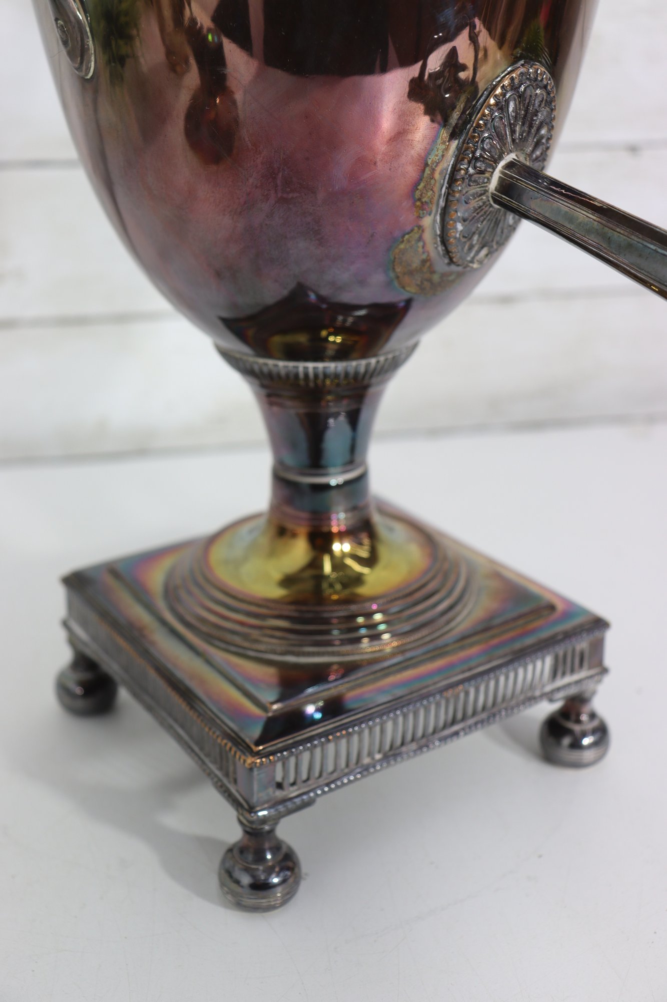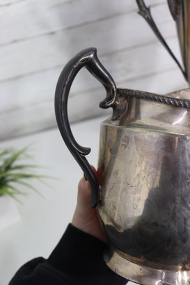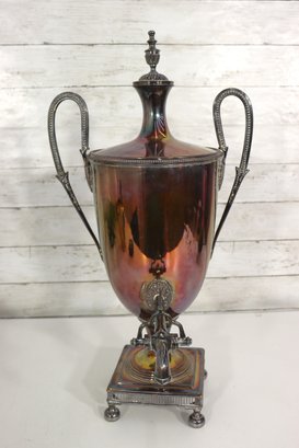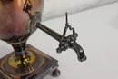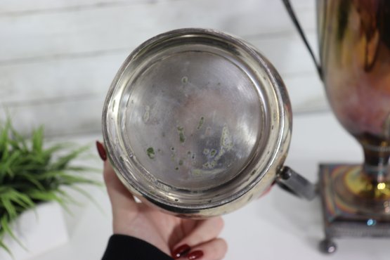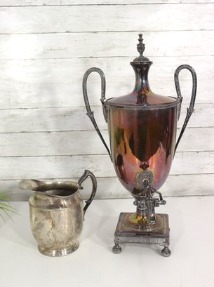 antique silverplate samovar and creamer set, featuring classic design details and rich vintage patina. This impressive two-piece collection showcases fine craftsmanship and timeless character—perfect for collectors or period décor displays.