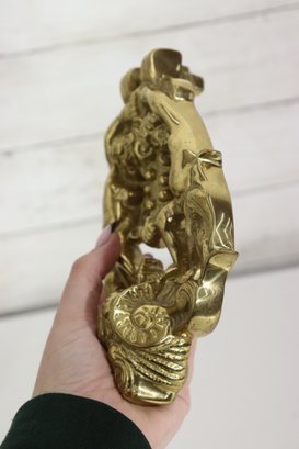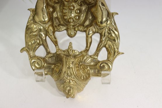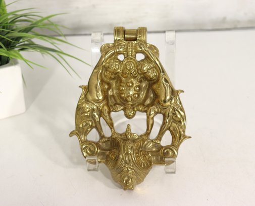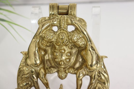 Beautiful antique solid brass door knocker featuring an ornate figural mythical style design. Measures approx. 9” tall x 6” wide. Very detailed casting with classical / Victorian era styling — featuring two figures and decorative scroll elements with heavy, bold brass presence.