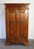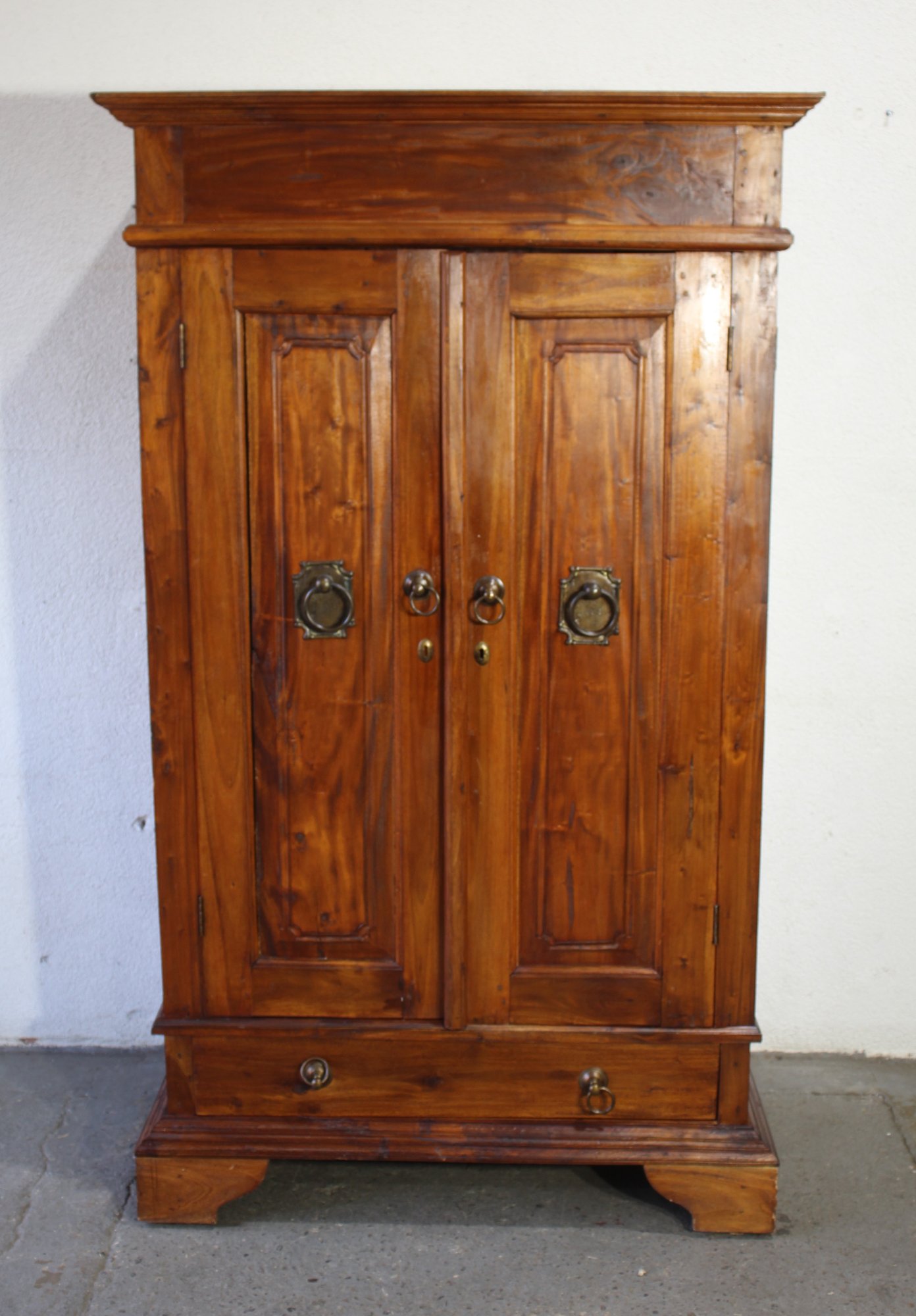We are pleased to present a meticulously crafted solid wood armoire, perfect for enthusiasts of timeless furniture. This piece features robust double doors, enriched with decorative brass handles and escutcheons, adding a touch of vintage elegance. Inside, the armoire offers ample storage space, including two spacious shelves and a large bottom drawer, ideal for organizing various items.