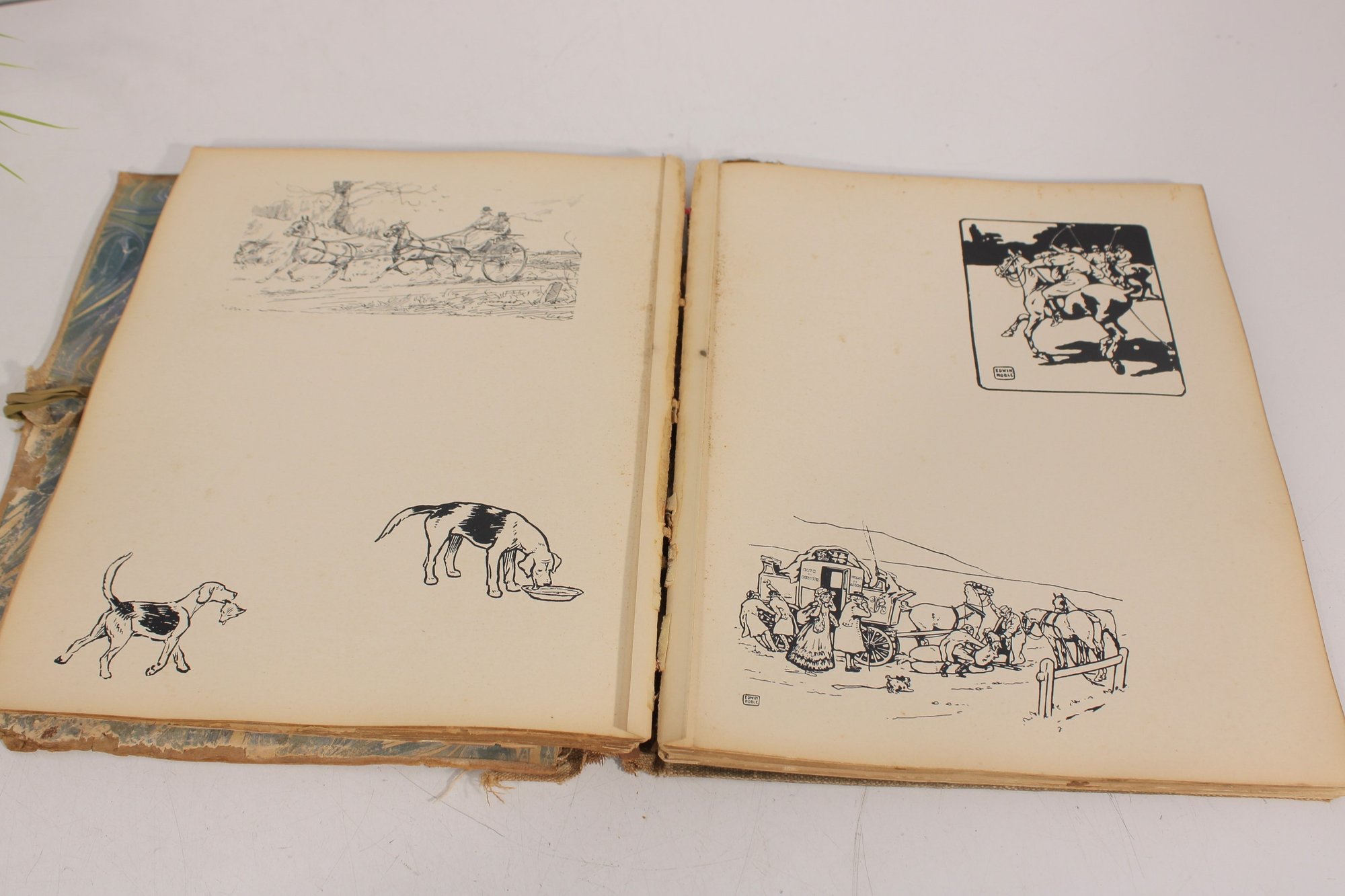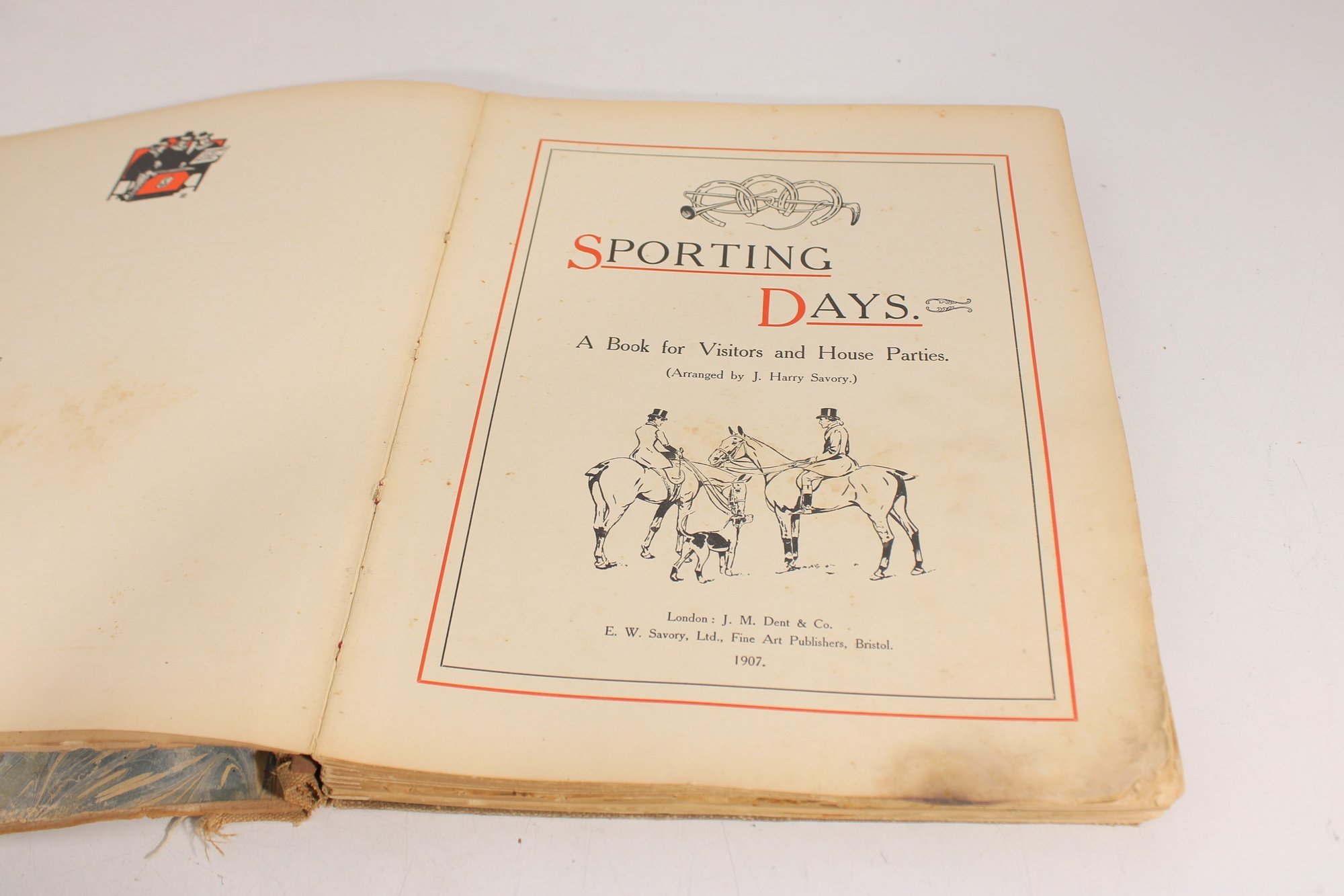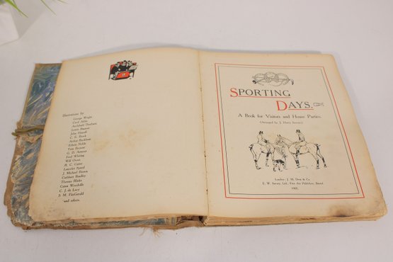 antique illustrated book titled Sporting Days – A Book for Visitors and Horse Lovers. This charming vintage volume features humorous and detailed black-and-white illustrations depicting horses, hunting scenes, riders, dogs, and sporting life, making it a wonderful collectible for equestrian and sporting enthusiasts.