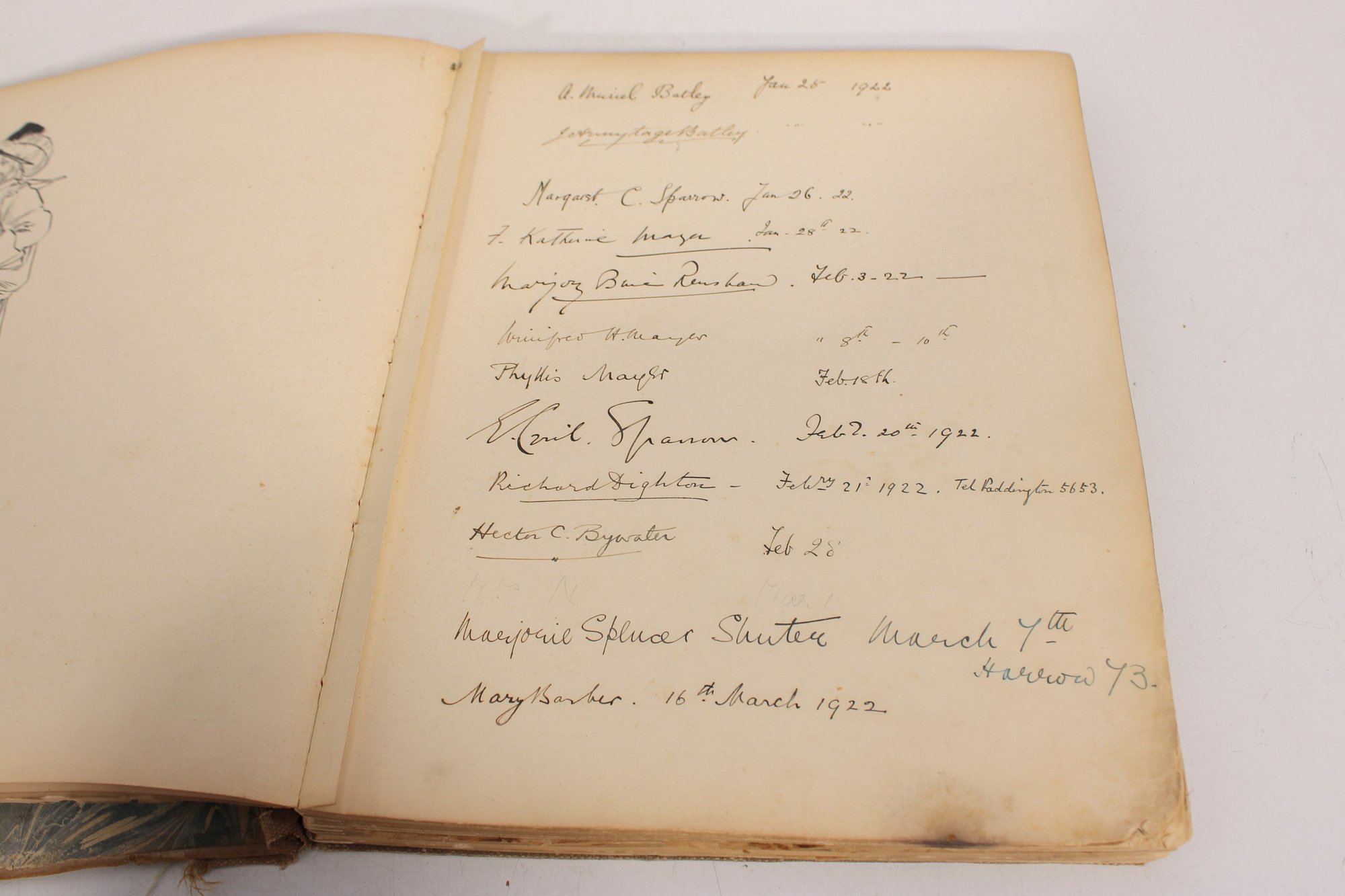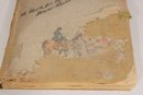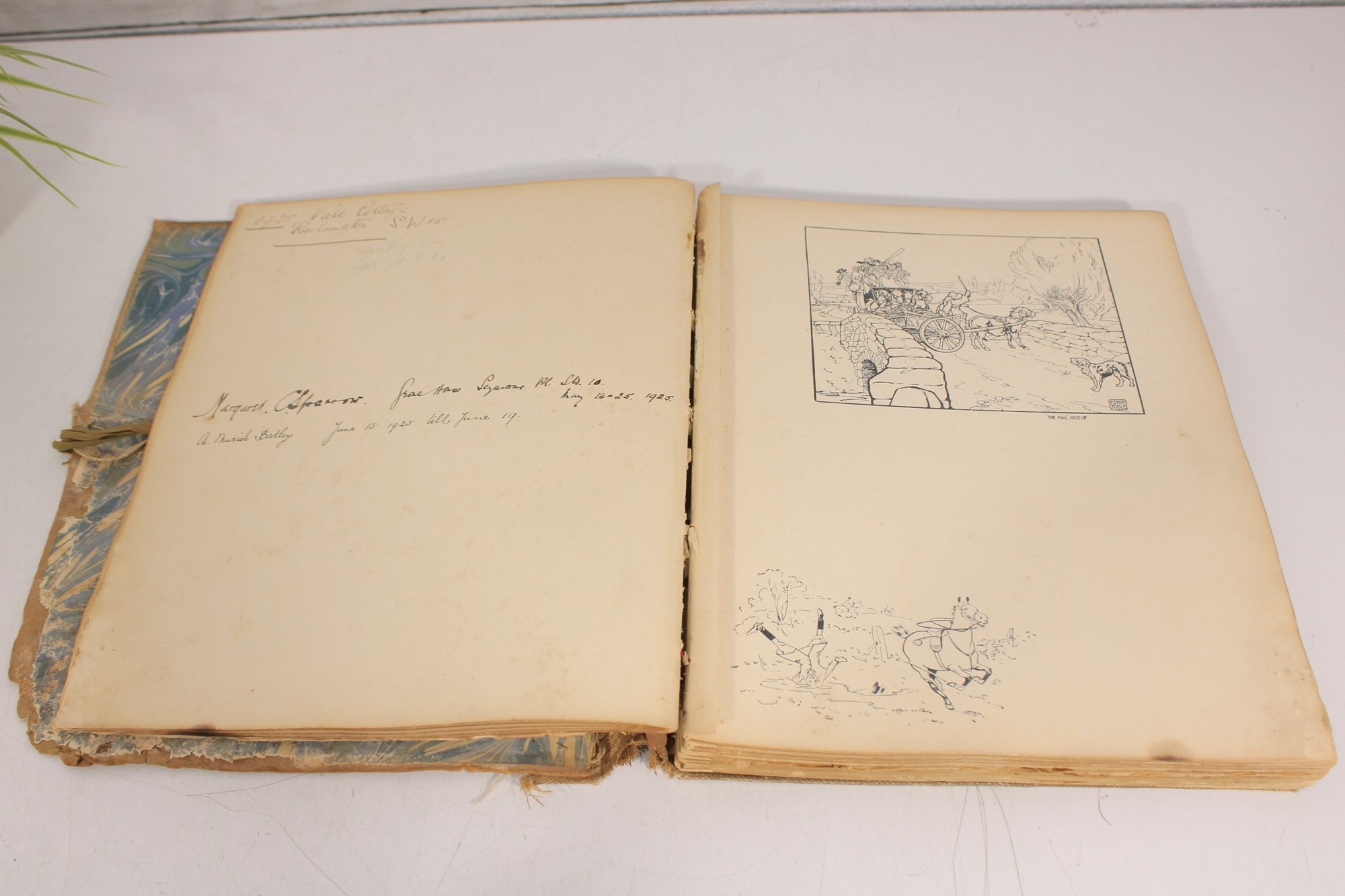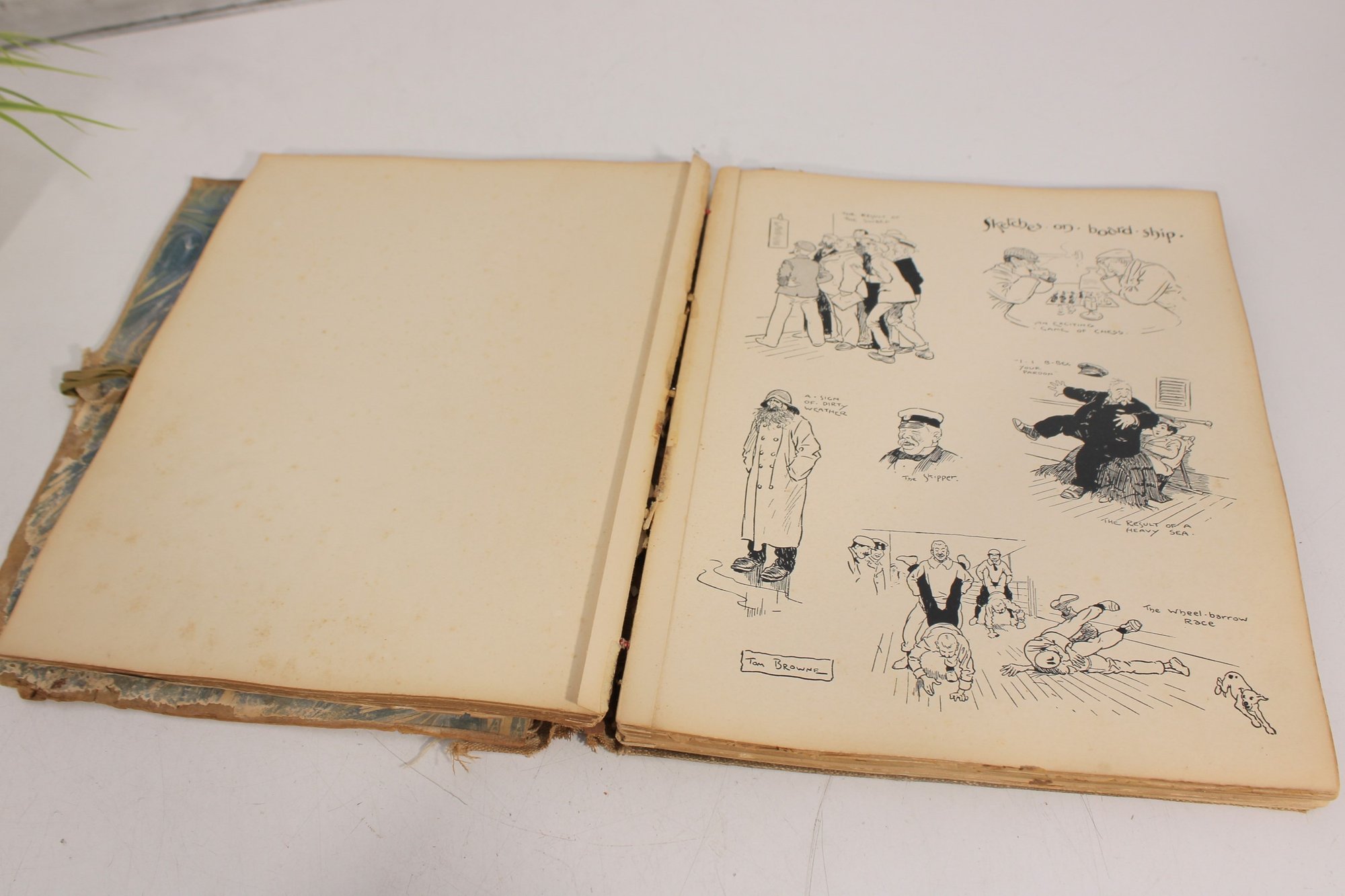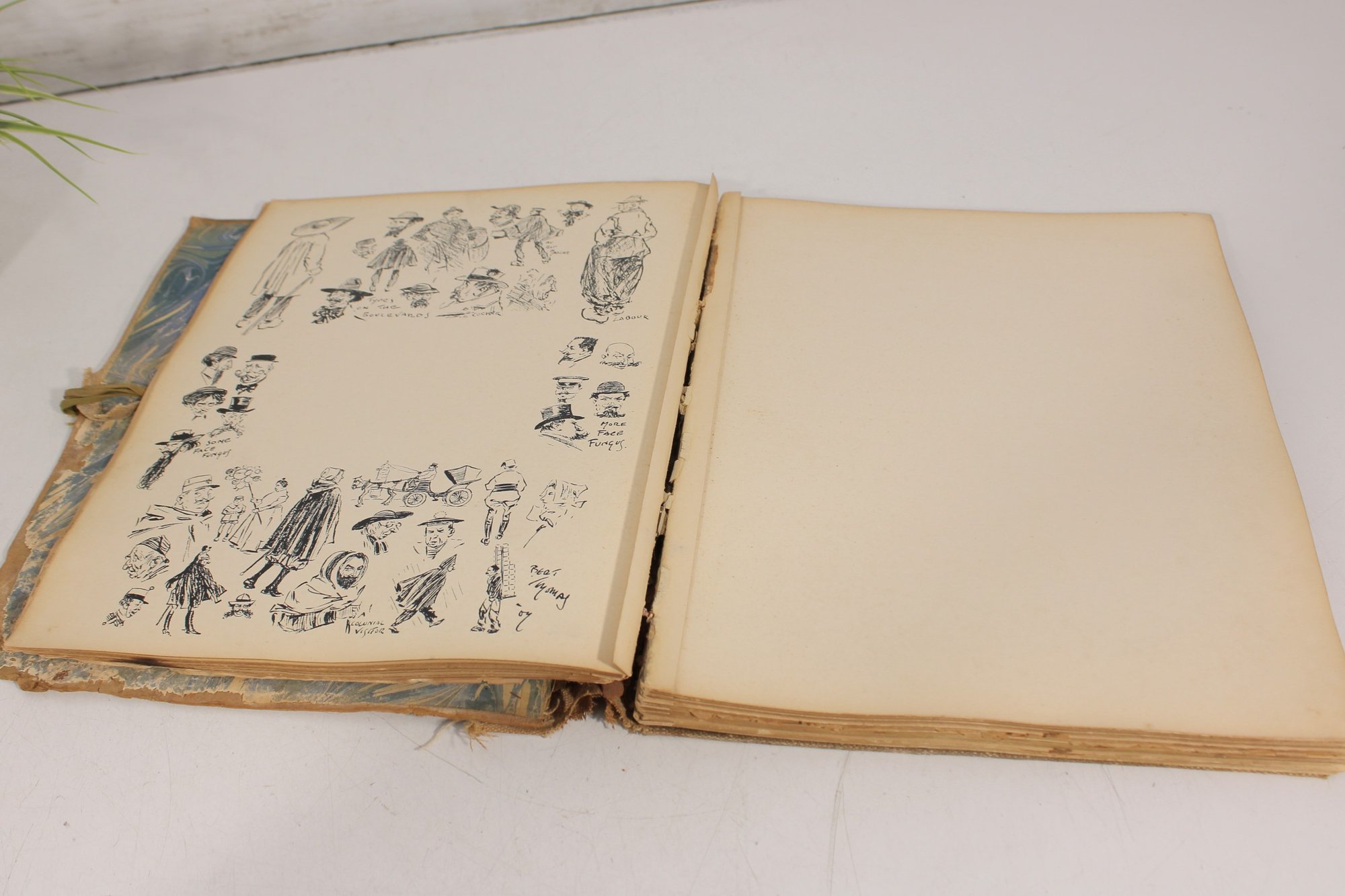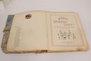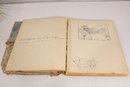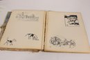 The book appears to date from the early 20th century and includes a variety of whimsical drawings and captions throughout. There is also handwritten writing on one of the early pages, adding a bit of personal history to the piece.