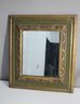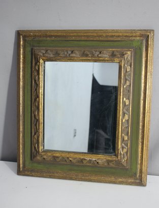 This antique square wall mirror is set in a striking frame featuring a combination of distressed gold detailing and an olive green accent border. The carved floral motif on the inner frame adds a touch of elegance and artistry to this unique piece.