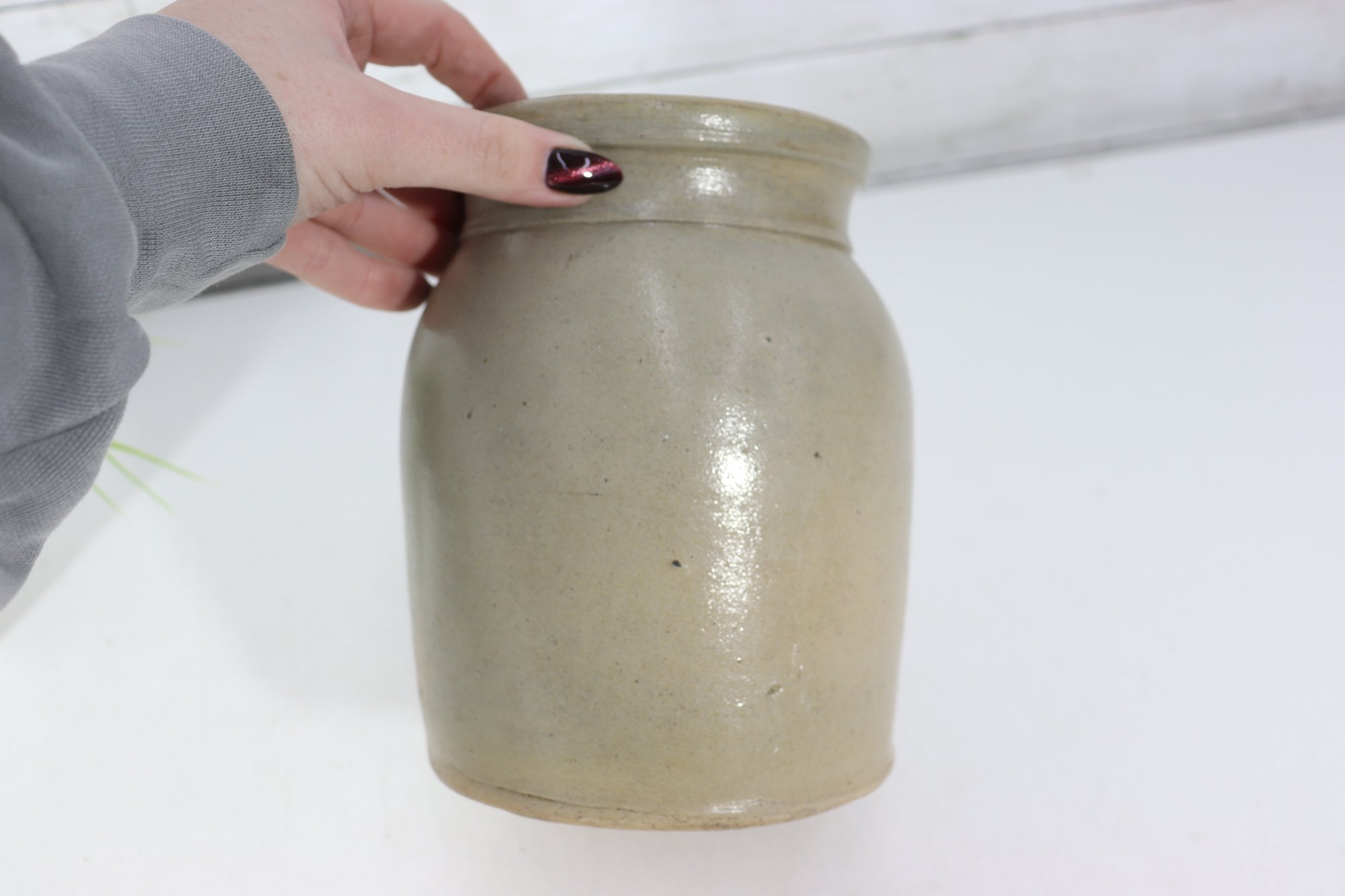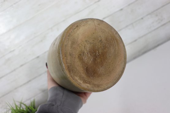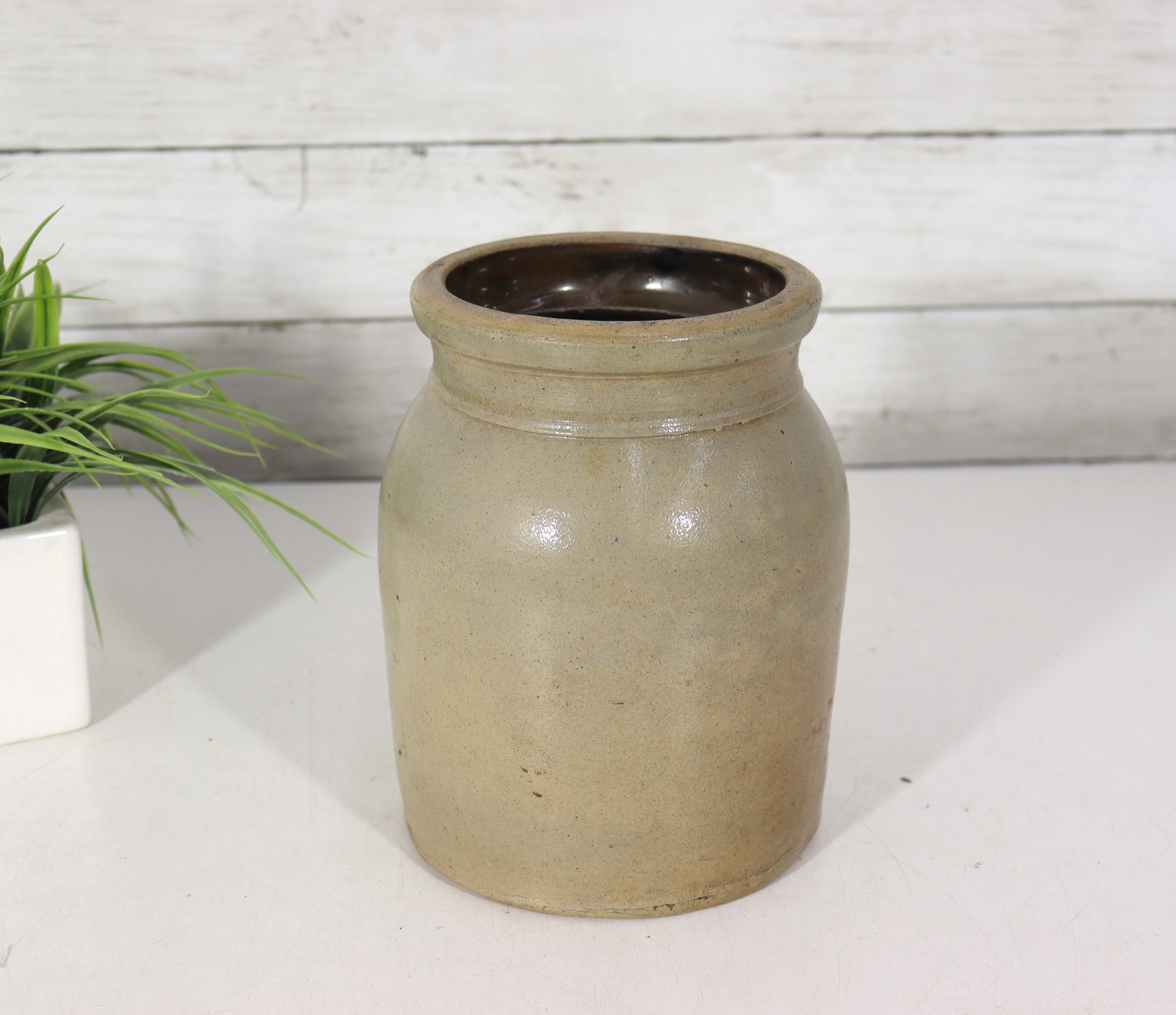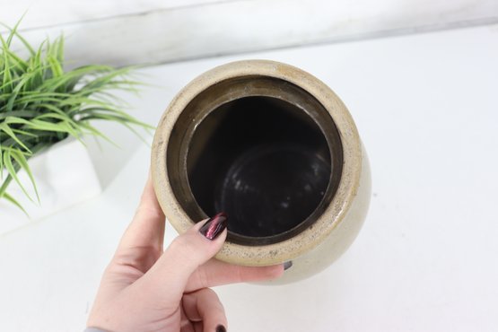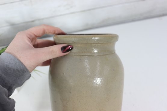 Classic antique stoneware crock featuring a simple, timeless form with a natural salt-glazed finish. This utilitarian jar has a warm, earthy tone with subtle surface texture and a dark interior glaze, making it perfect for farmhouse décor, primitive displays, or functional storage.