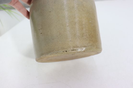 The thick pottery walls and traditional shape reflect early American or European stoneware craftsmanship.