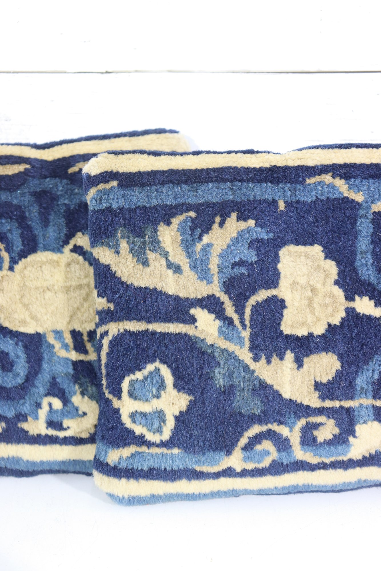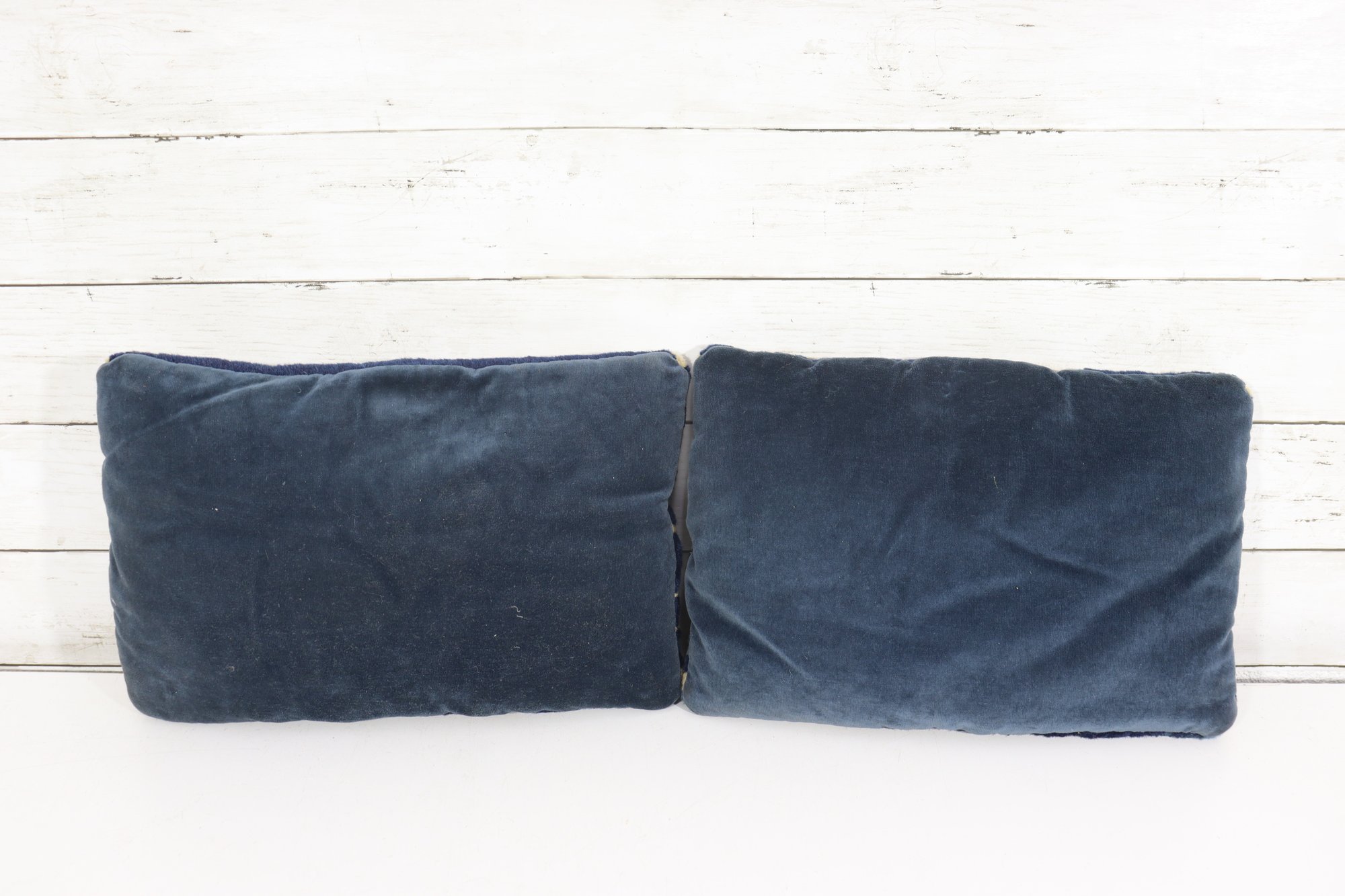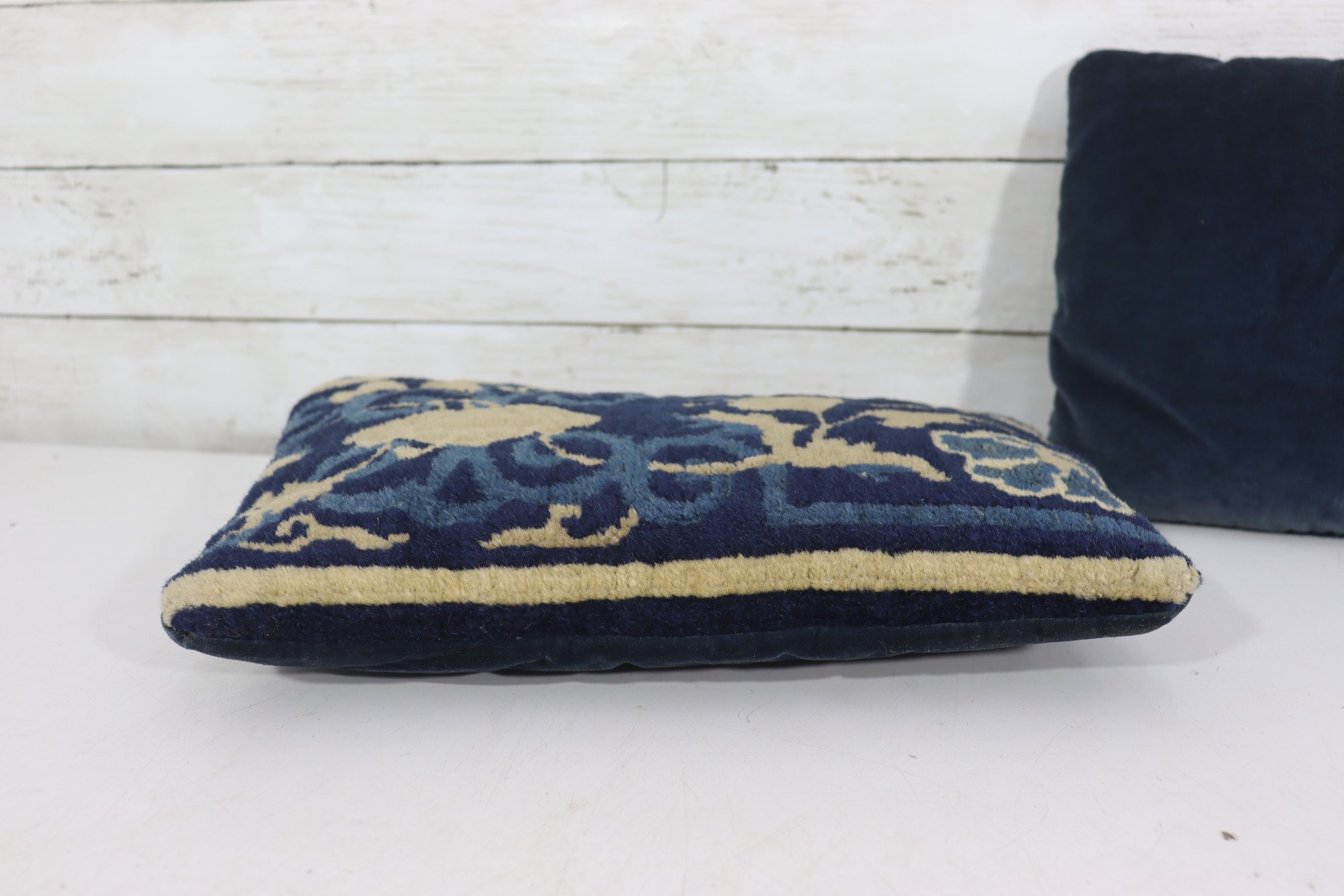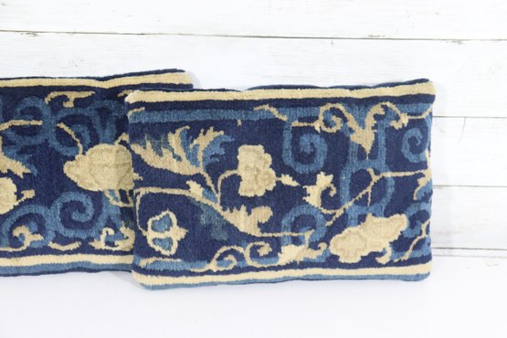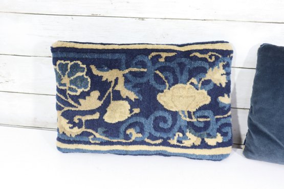 a beautiful blue and gold floral needlepoint pillow, measuring approximately 9 inches x 13 inches. The front features an elegant scrolling floral motif rendered in rich navy blue with warm golden accents, while the back is finished in a solid coordinating blue fabric.