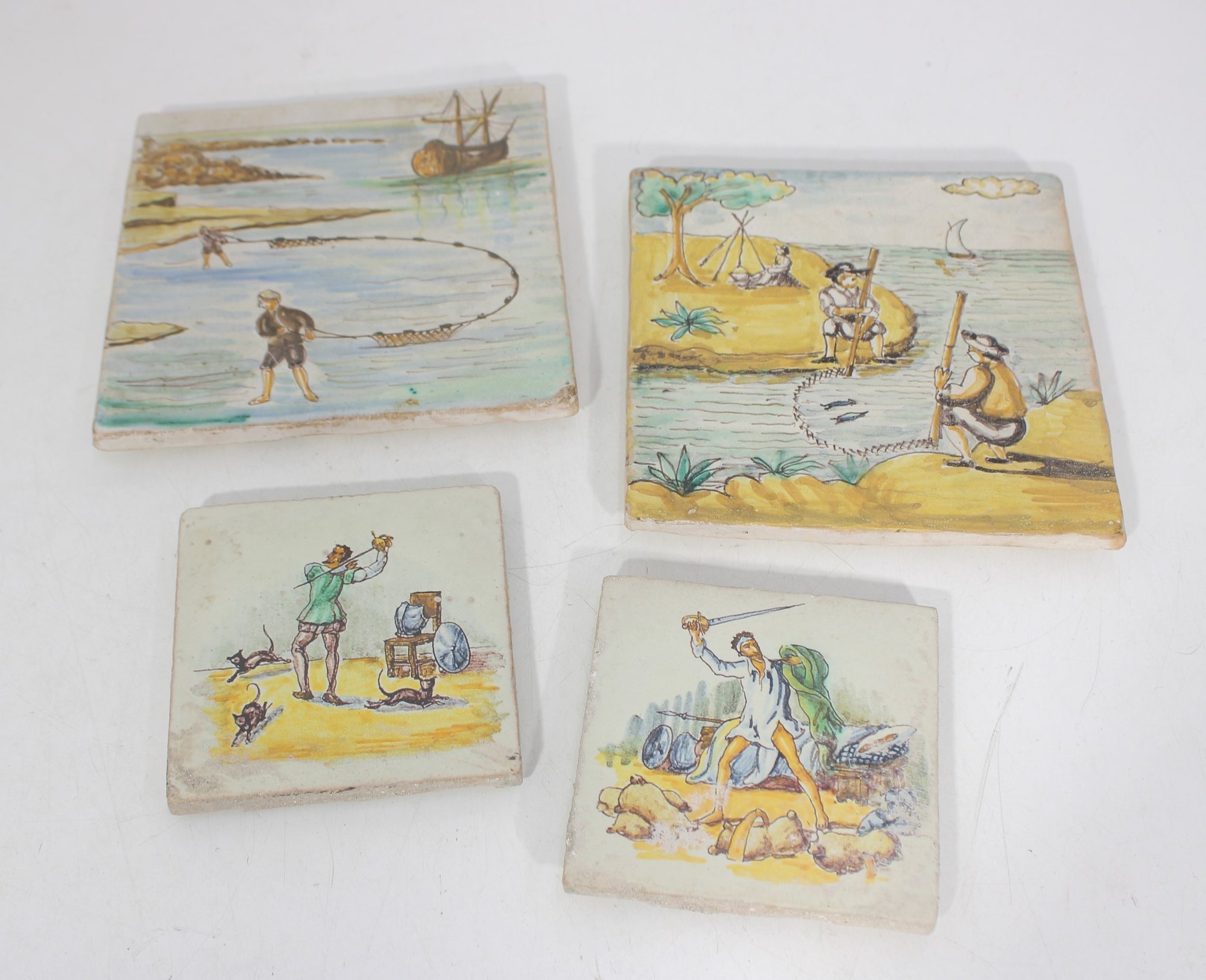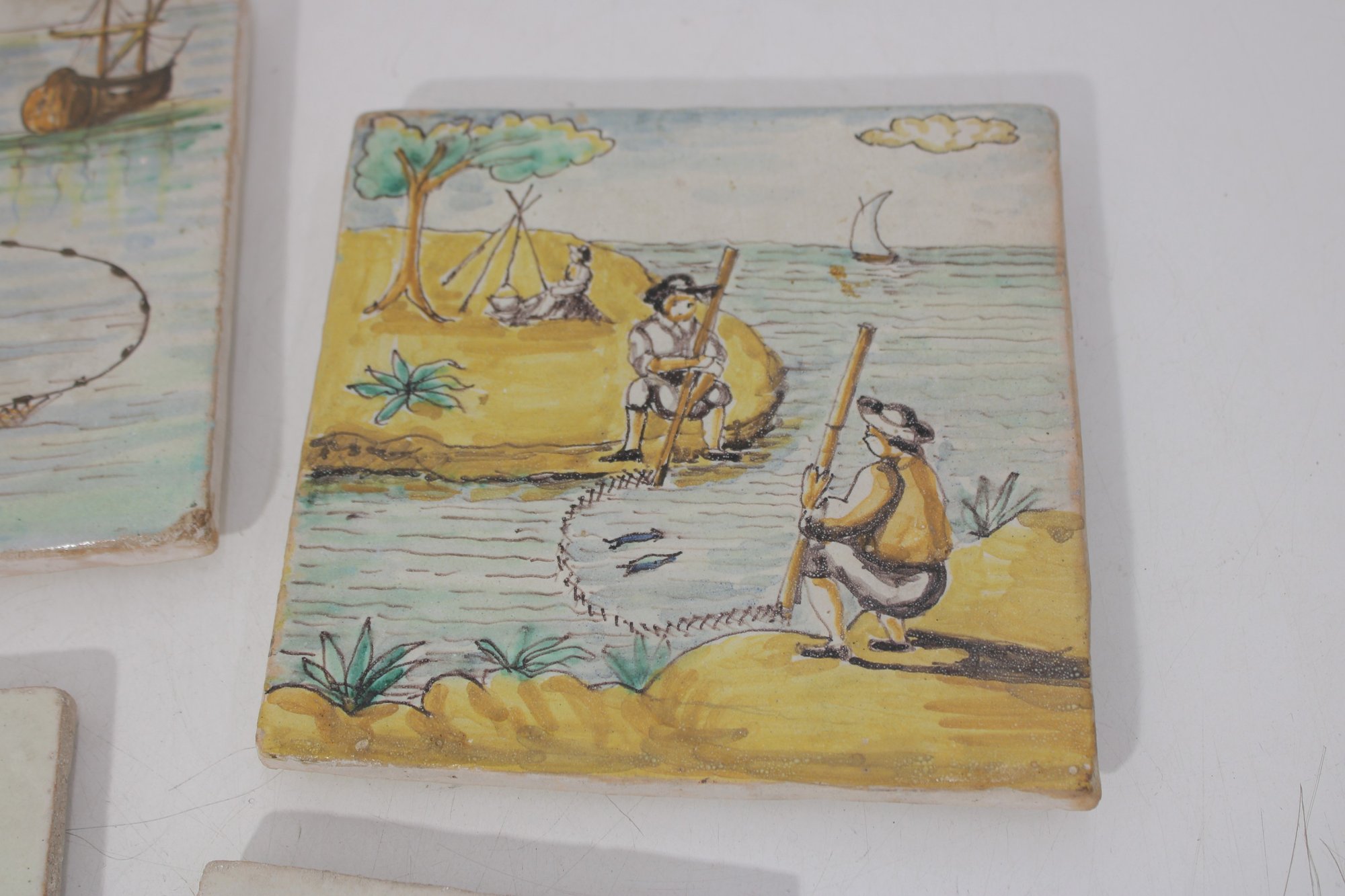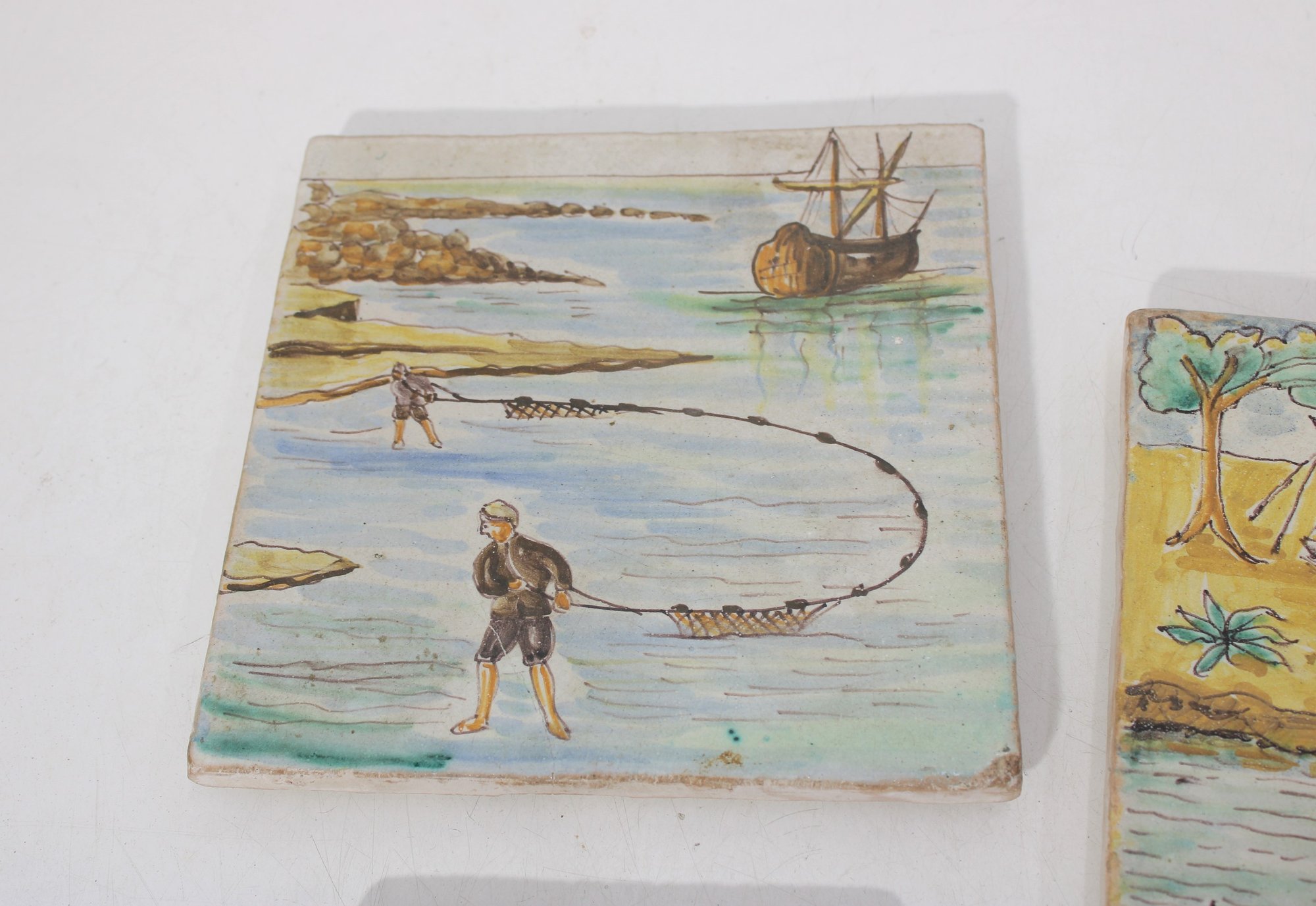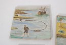 These tiles showcase pastoral and coastal imagery including fishermen, travelers, ships, and countryside scenes rendered in soft blues, greens, yellows, and earthy tones. The artwork reflects classic European storytelling style with delicate brushwork and subtle glazing.