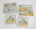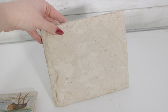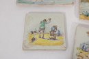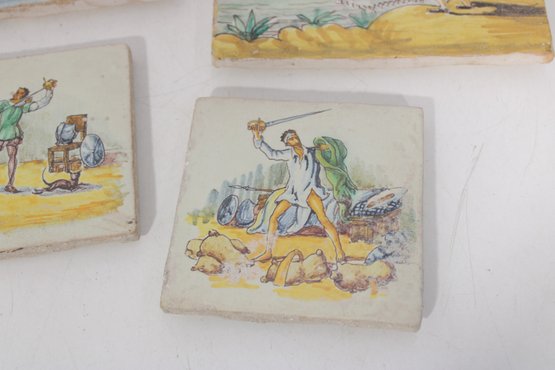 Charming set of antique-style hand-painted ceramic tiles featuring detailed illustrations of figures and landscape scenes reminiscent of traditional Dutch tile motifs.