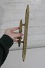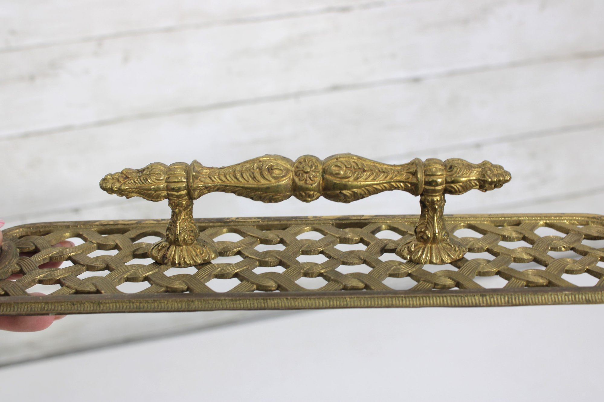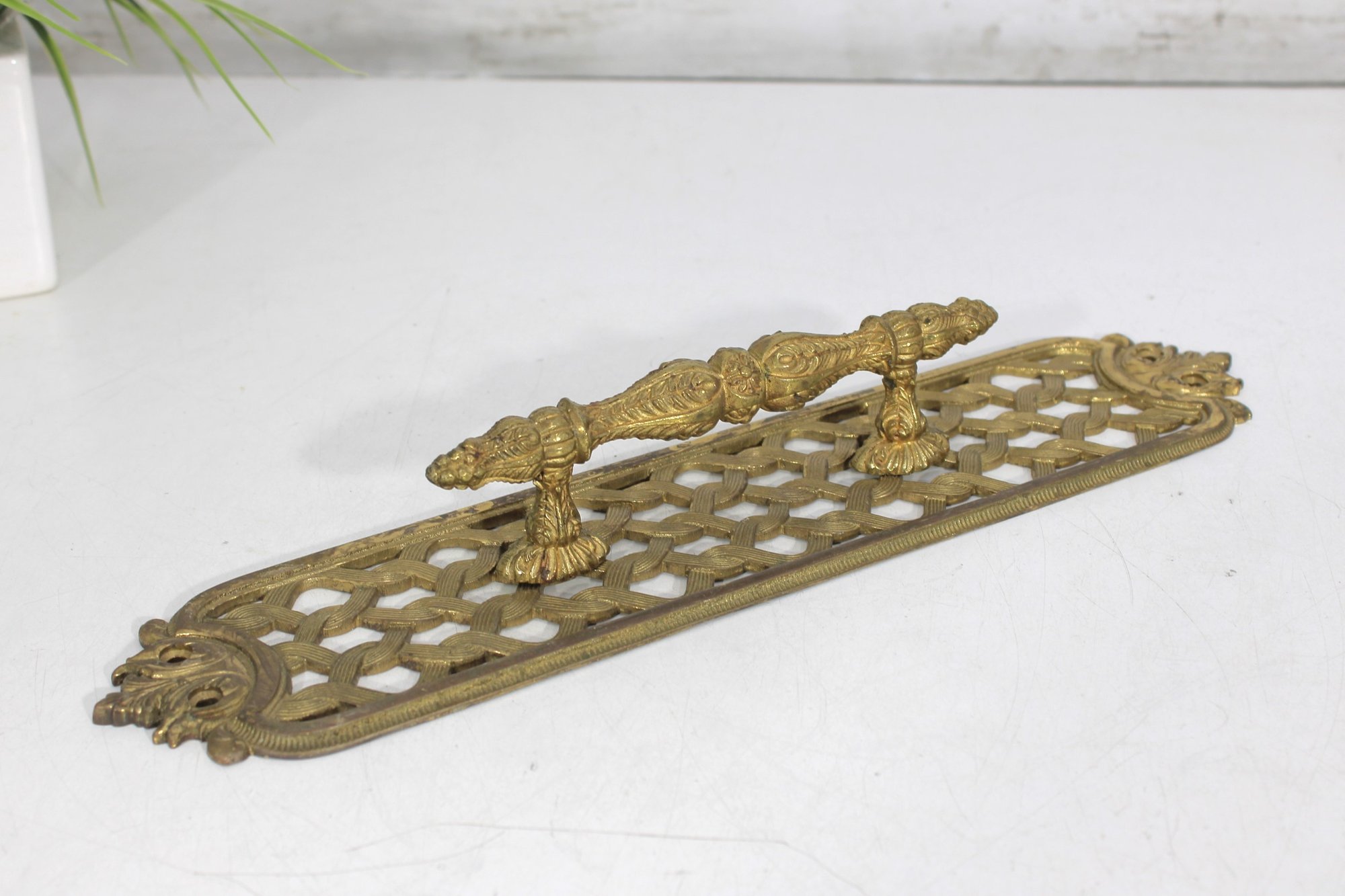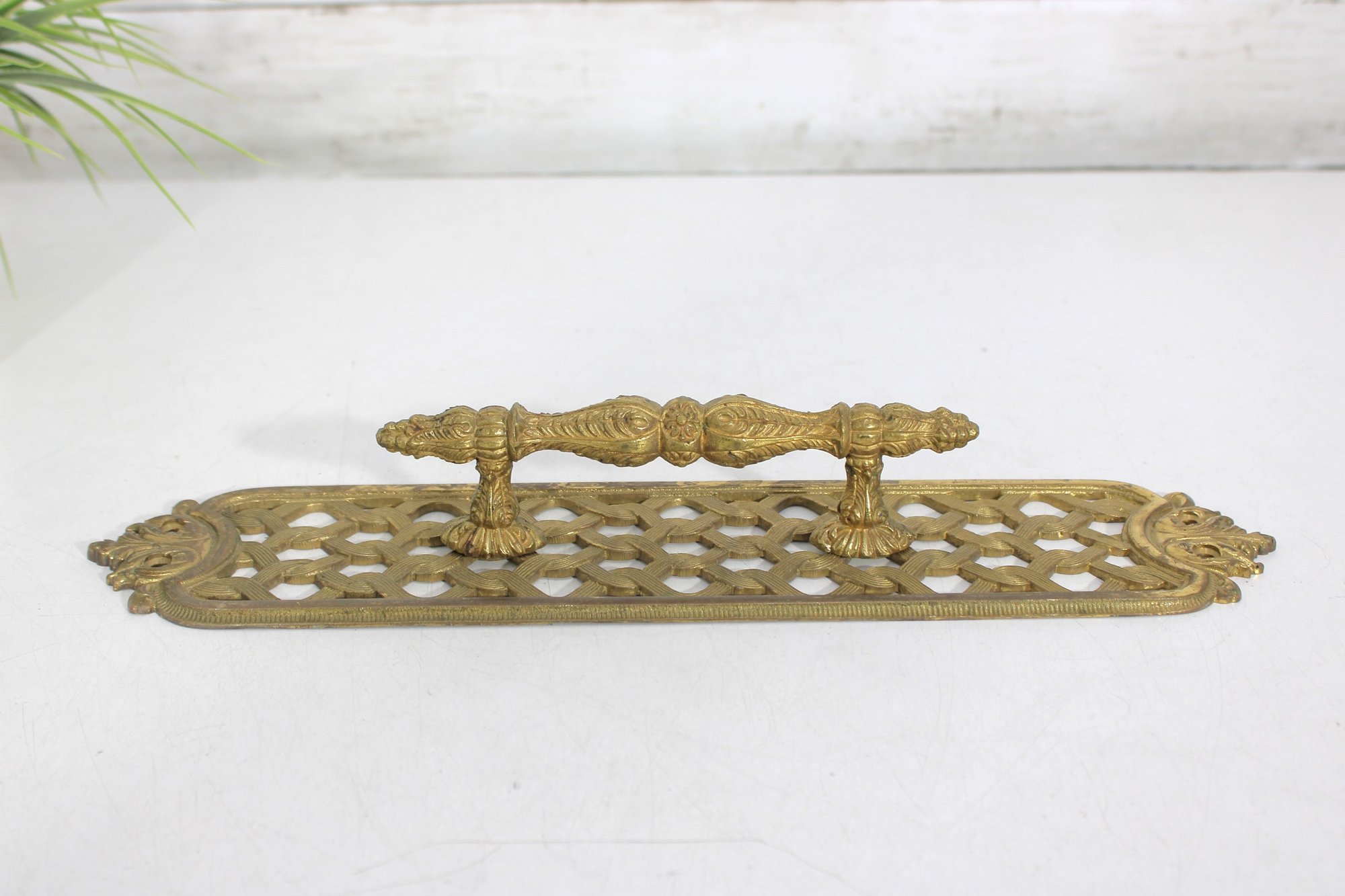 Measuring approximately 13.5 inches long by 3 inches wide, this substantial pull would make a striking statement on a large drawer, cabinet, chest, or interior door. The brass surface exhibits a warm aged patina with light wear, enhancing its vintage character and decorative appeal.