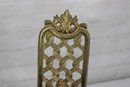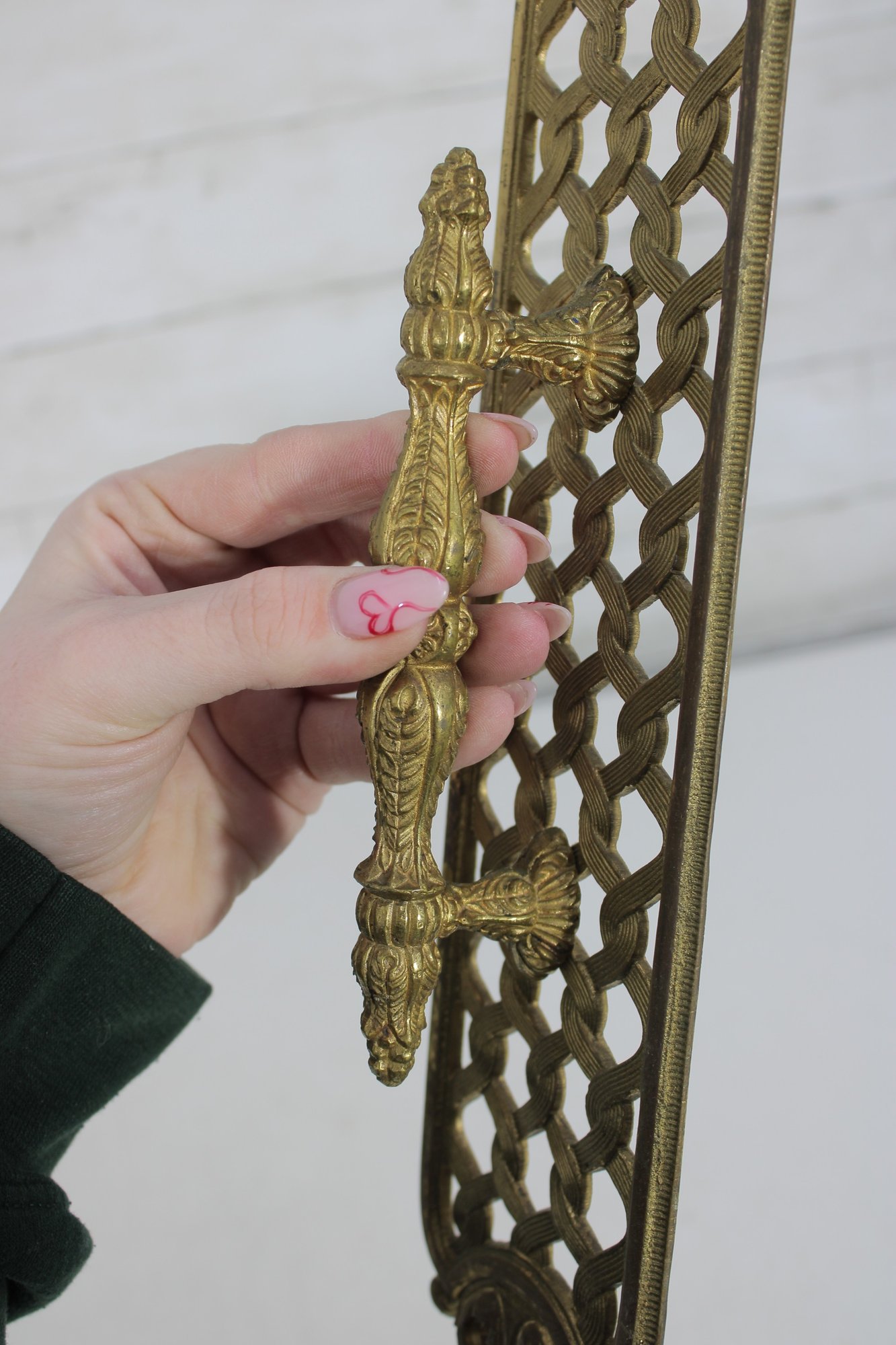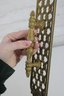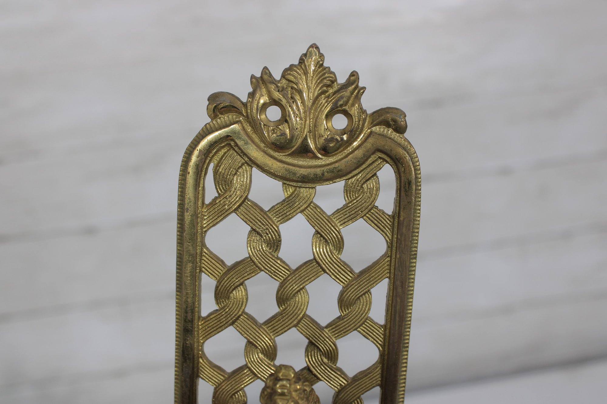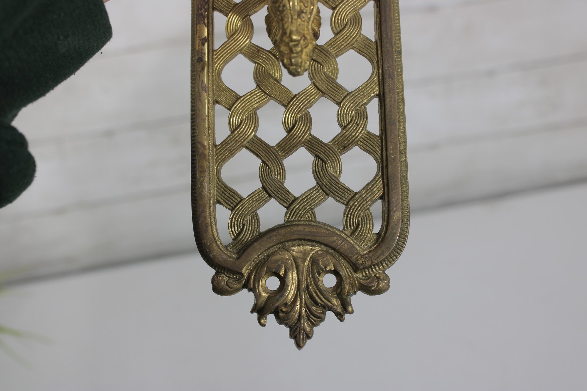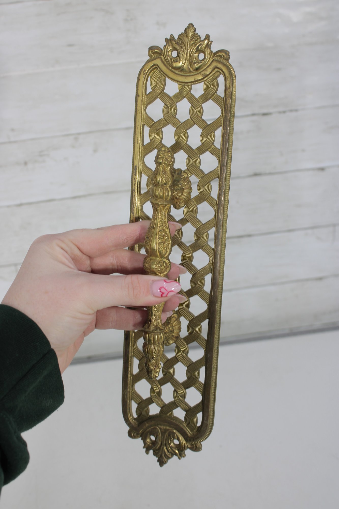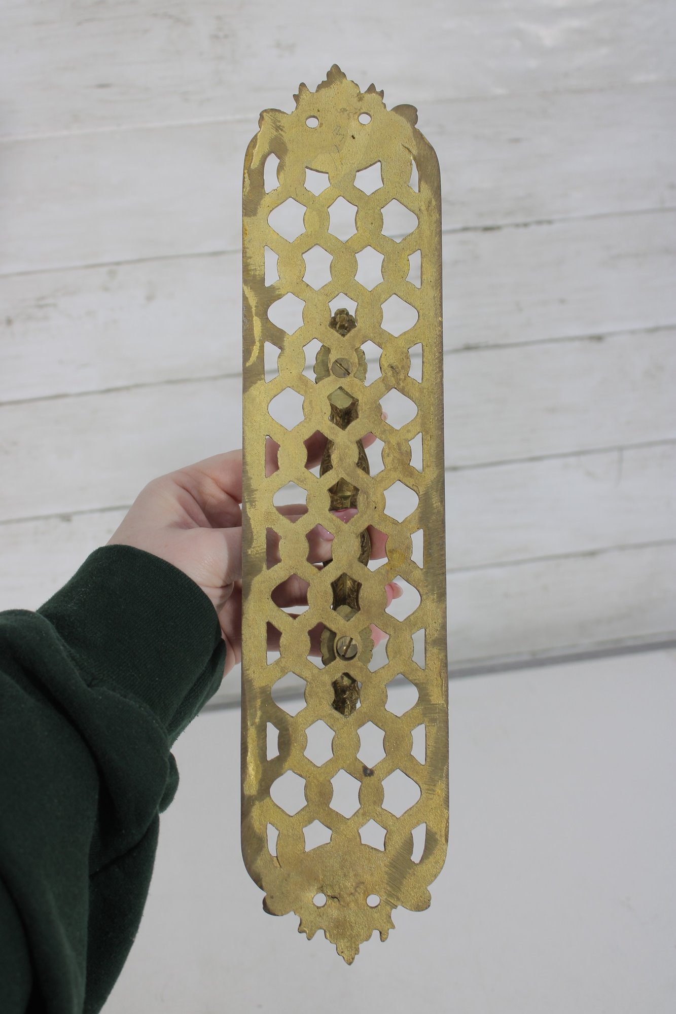 ornate brass pull featuring a long pierced backplate and a richly detailed raised handle. The design showcases classical scrolling, lattice-style piercings, and decorative finials, giving it a refined antique aesthetic with strong architectural presence.