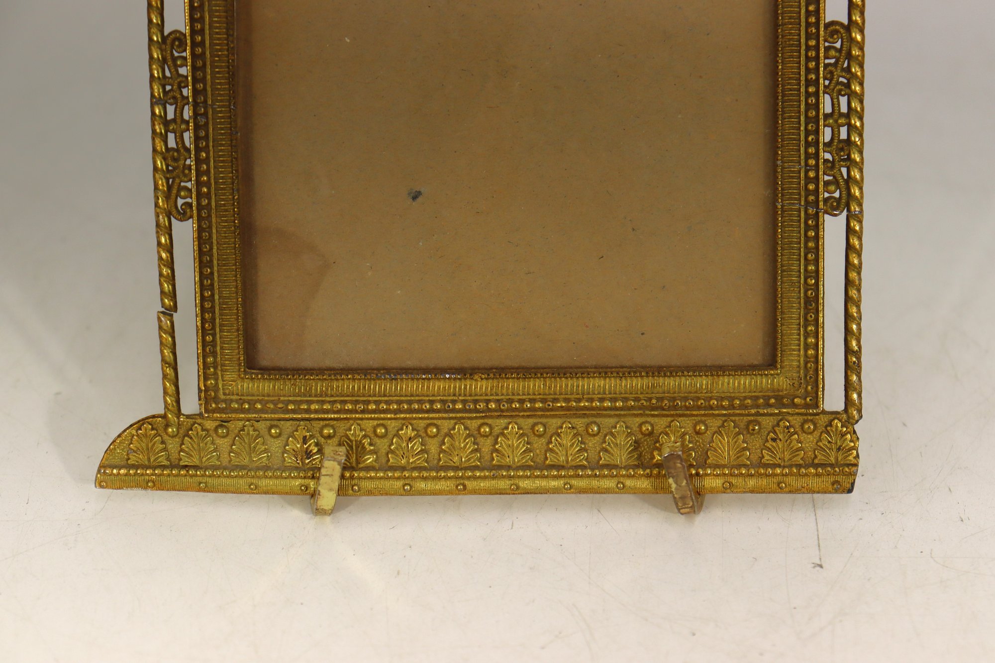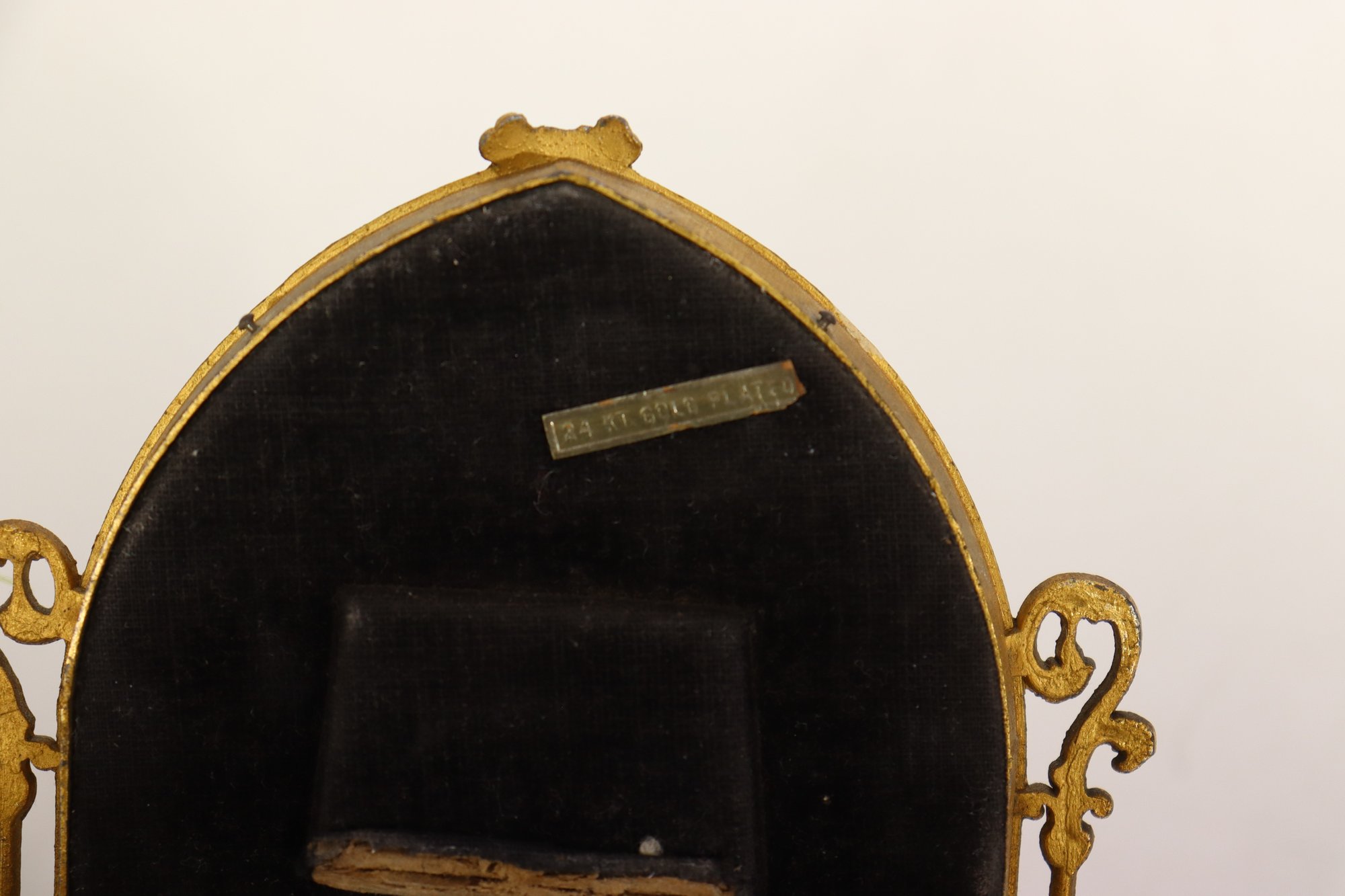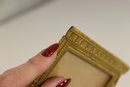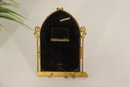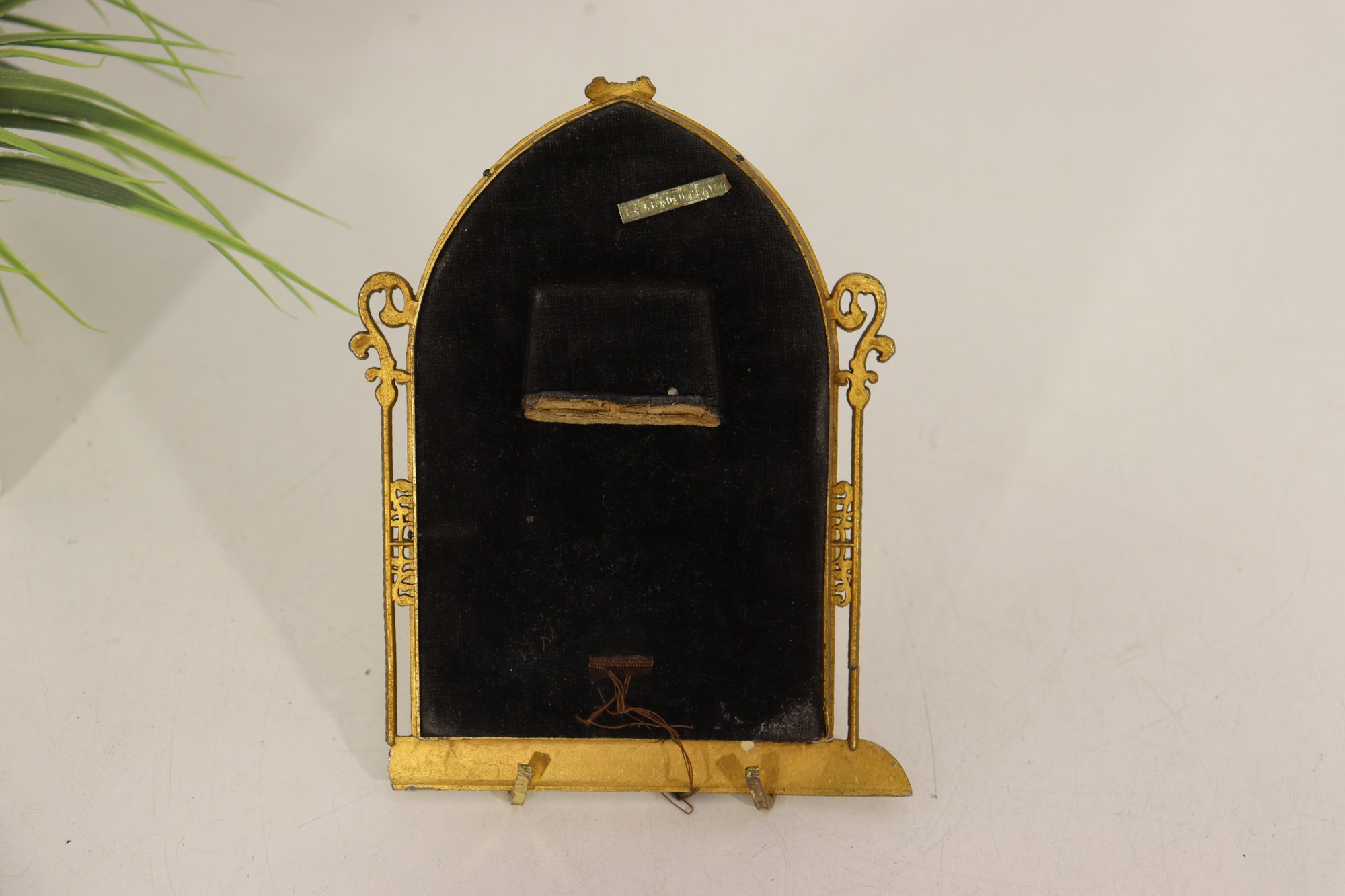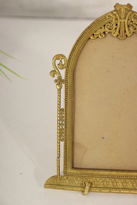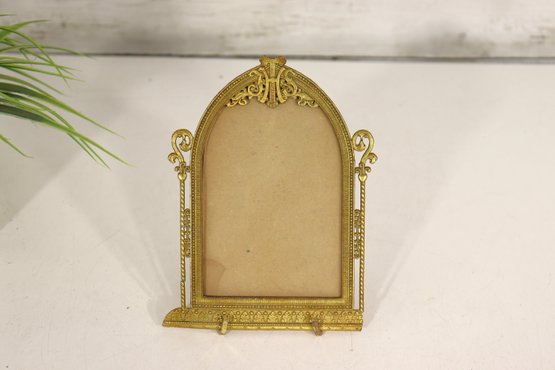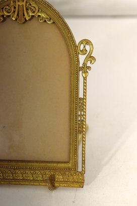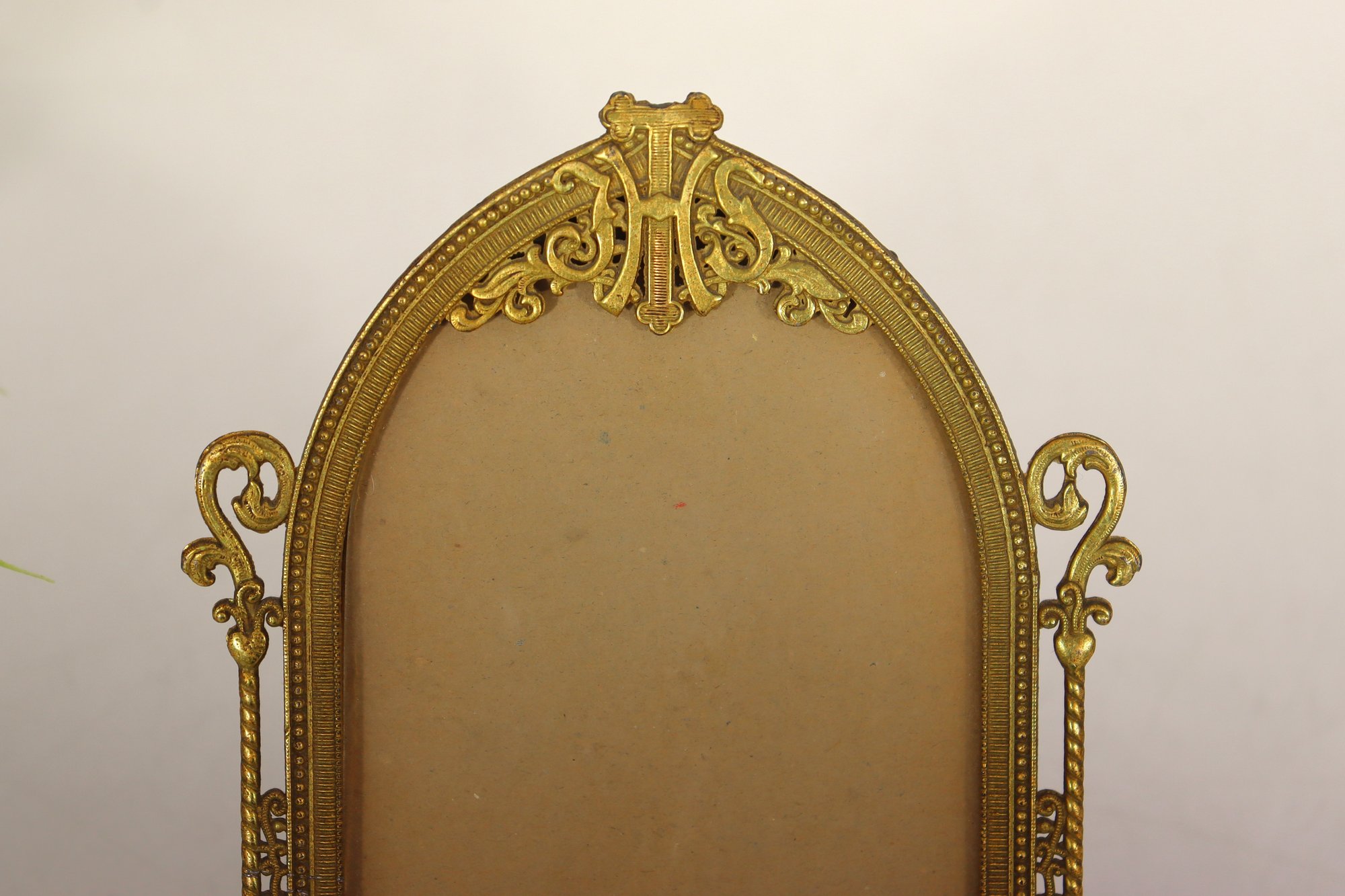 Beautiful ornate antique-style tabletop photo frame with gorgeous detailed brass finish. Features a Gothic arched top with scroll design, decorative side supports, and intricate beaded edging. Back side is fabric-lined with original paper label still attached.