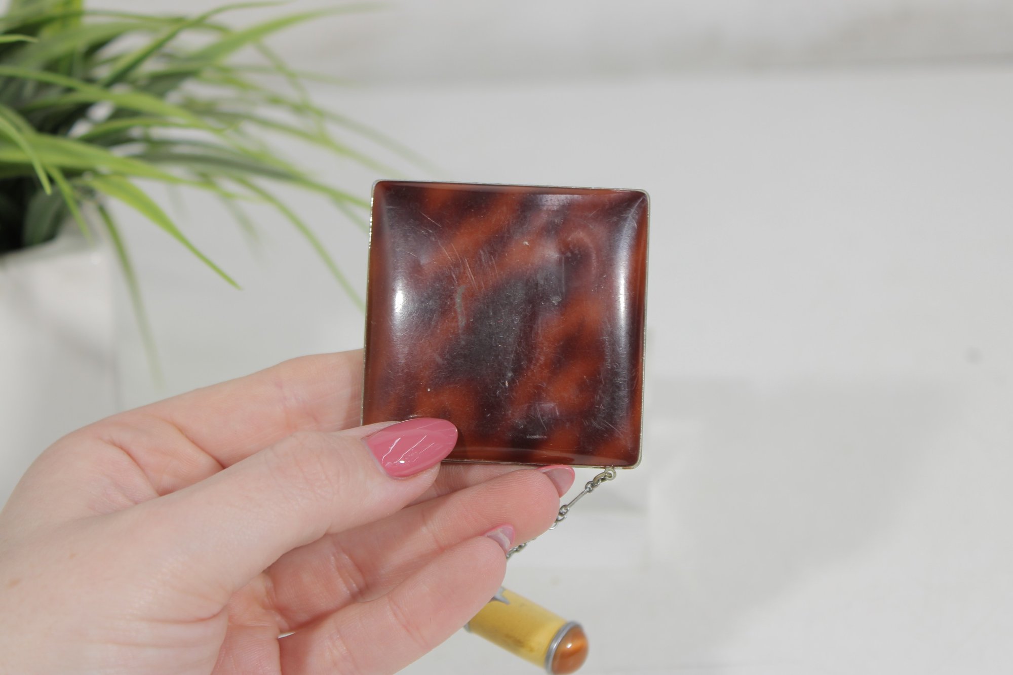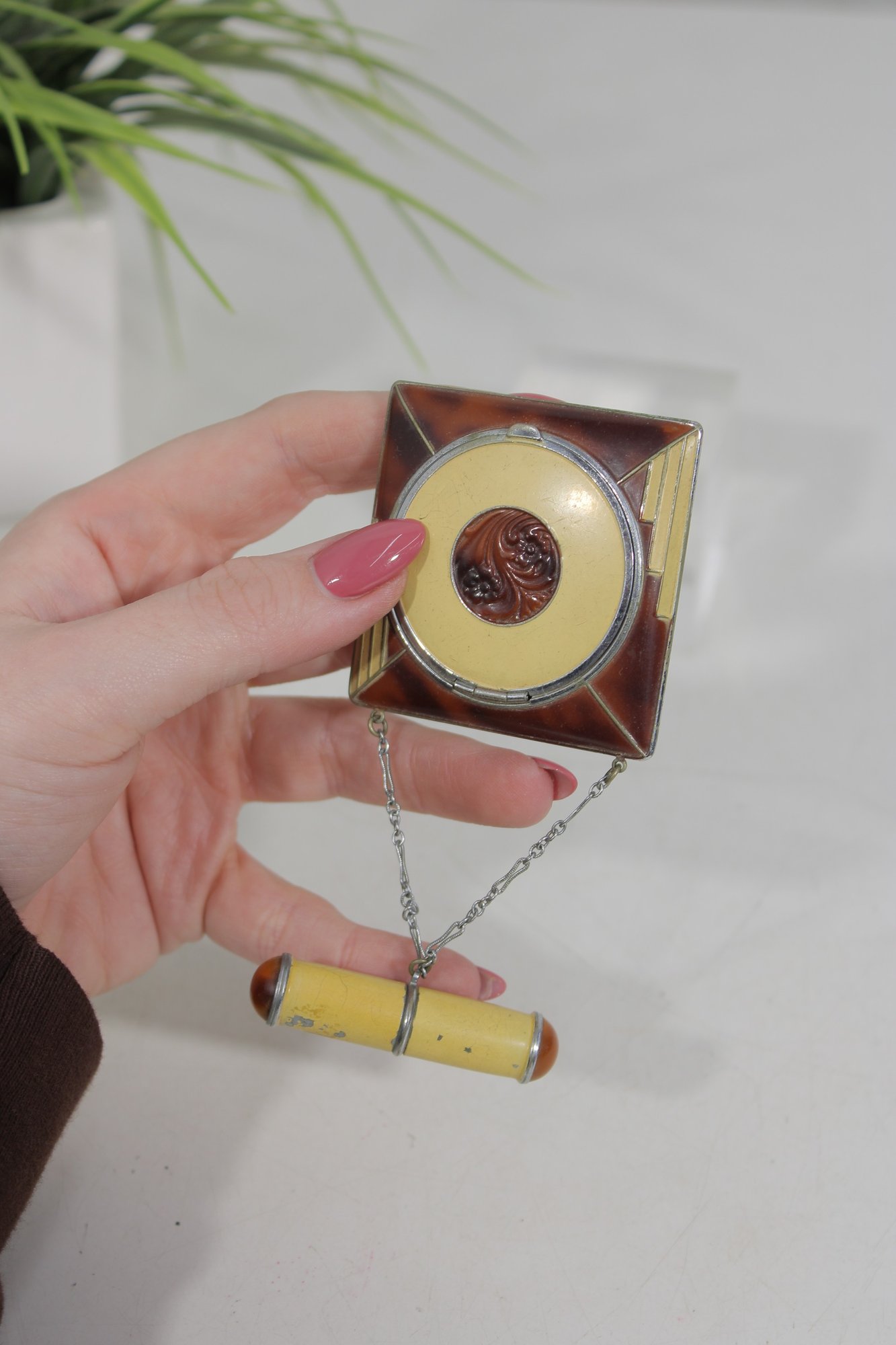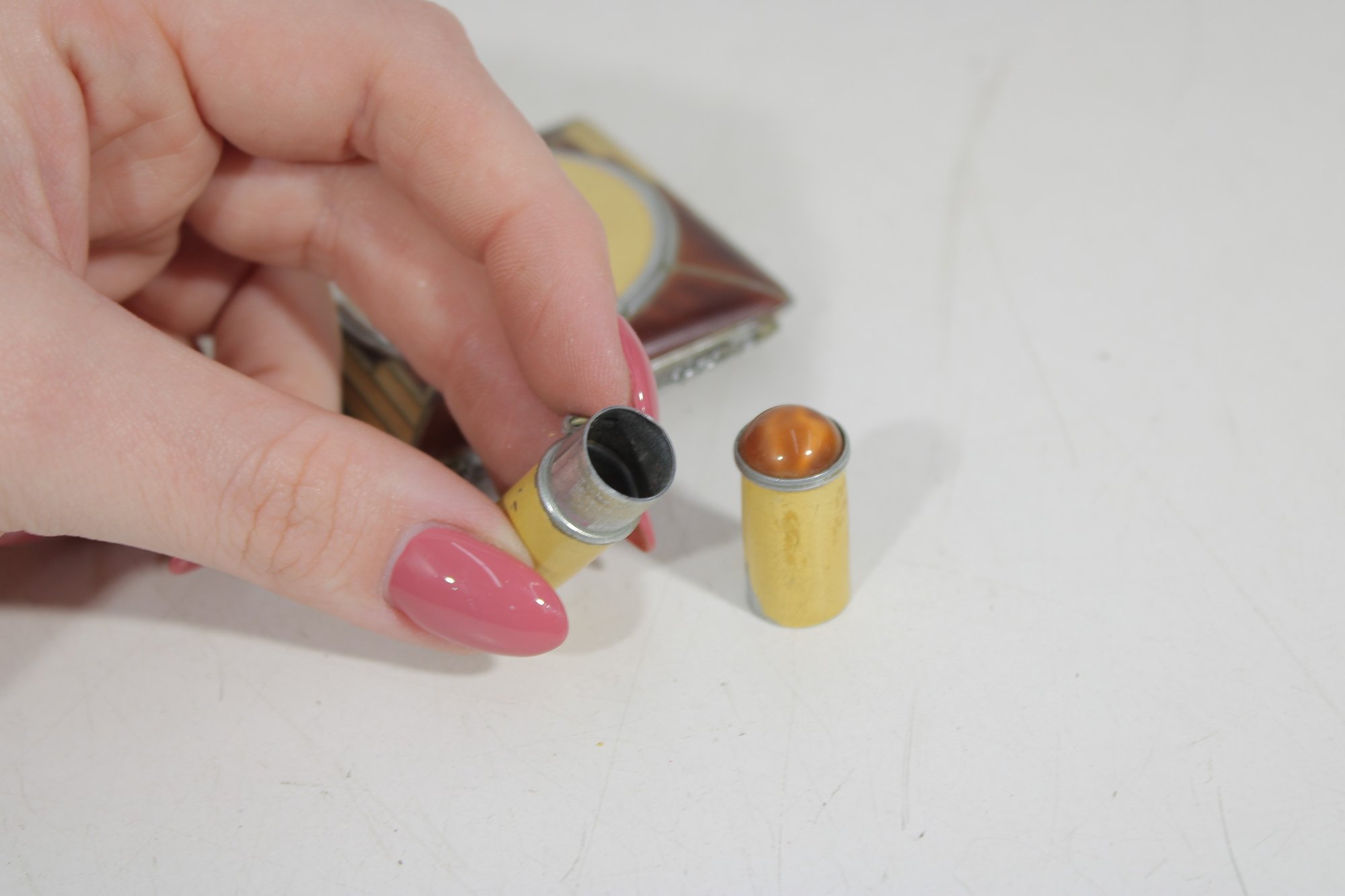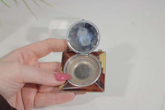 The compact opens to reveal the powder compartment and interior mirror, and it still retains its original design elements. The piece also includes a matching lipstick holder attached by a small chain, making this a charming and collectible vanity set.