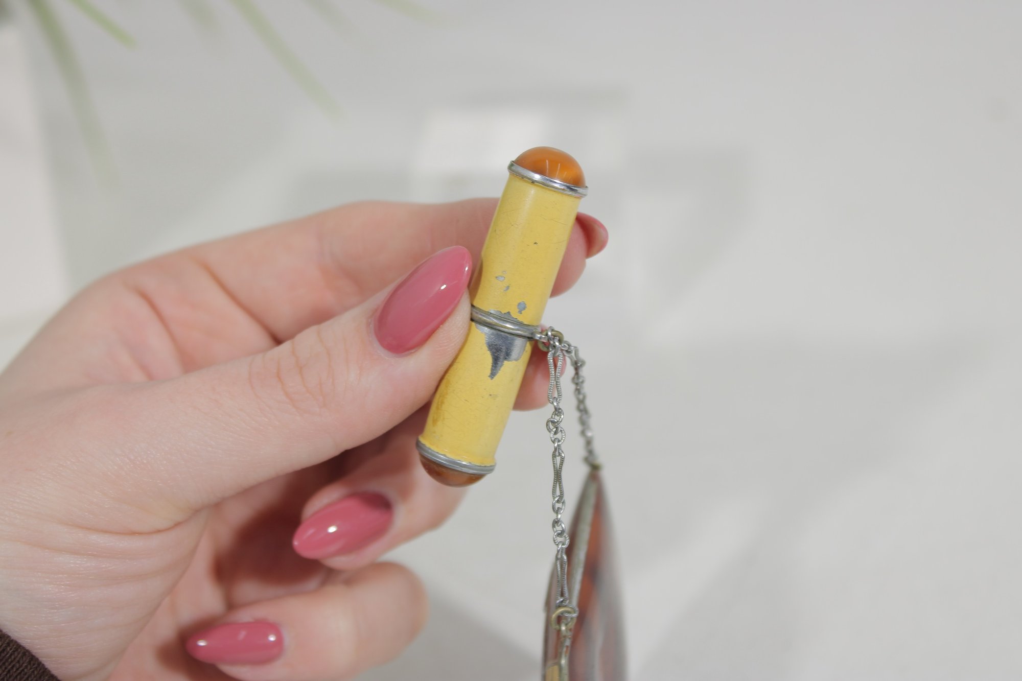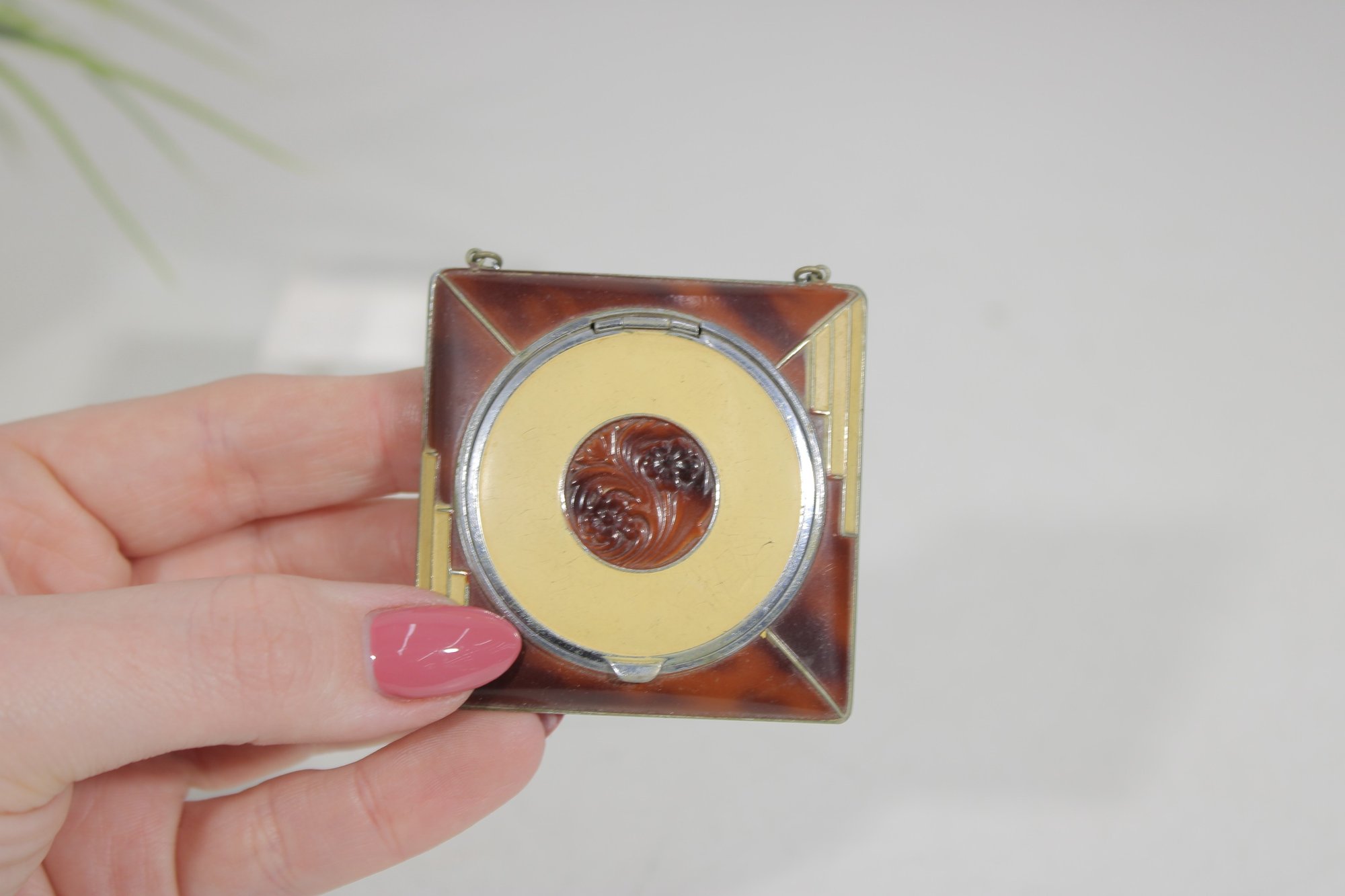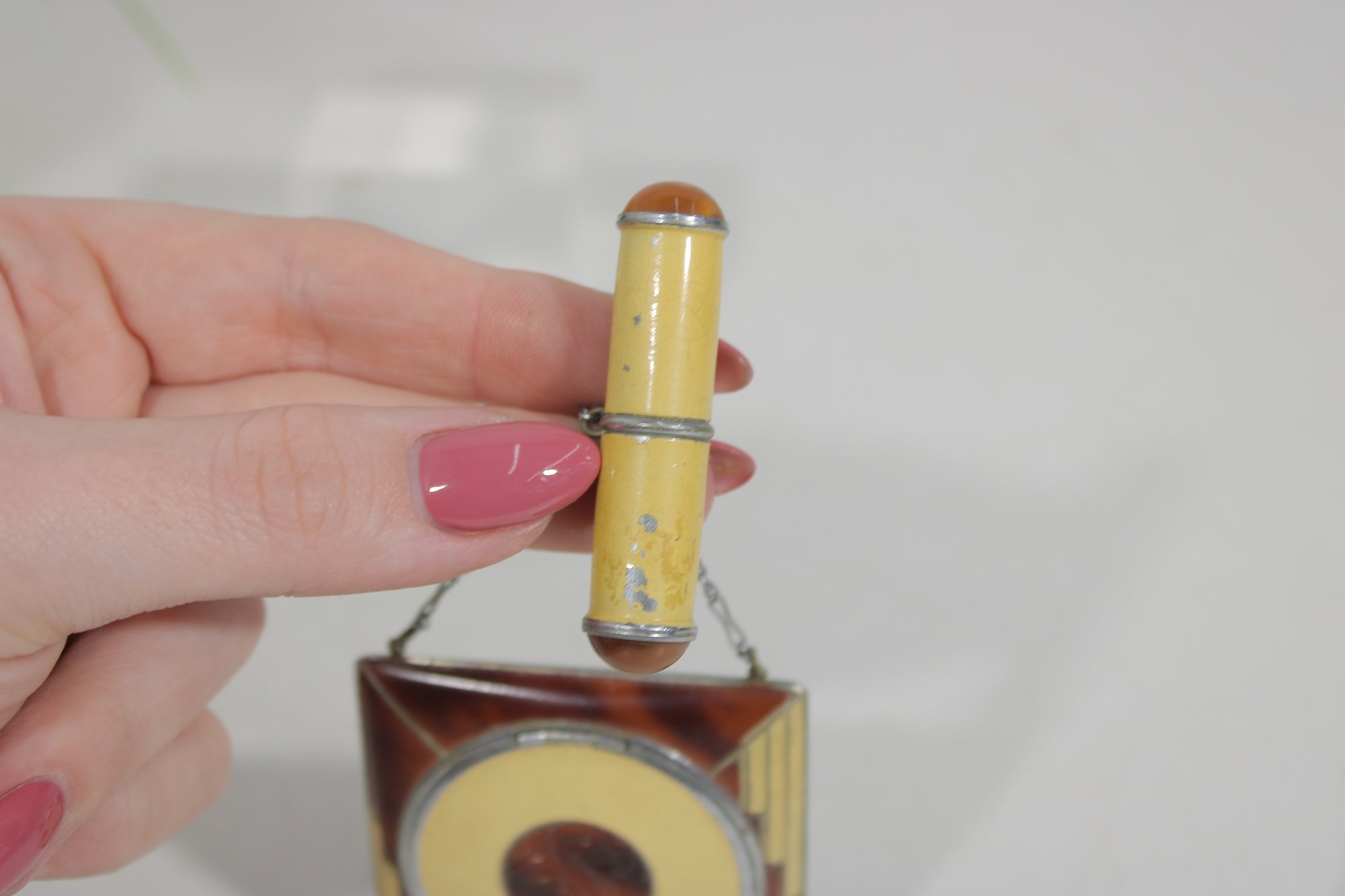 The compact opens to reveal the powder compartment and interior mirror, and it still retains its original design elements. The piece also includes a matching lipstick holder attached by a small chain, making this a charming and collectible vanity set.