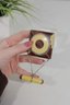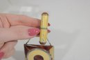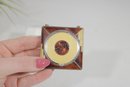 vintage Evans Mayfair makeup compact with matching lipstick holder, a beautiful example of Art Deco “Tango” era vanity accessories. The compact features a striking geometric design with butterscotch yellow and tortoiseshell-style panels accented by a central decorative medallion.