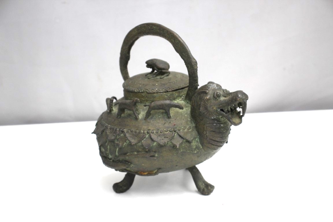 Antique Teapot With Asian Dragon Spout , Decorated With Animals Around It