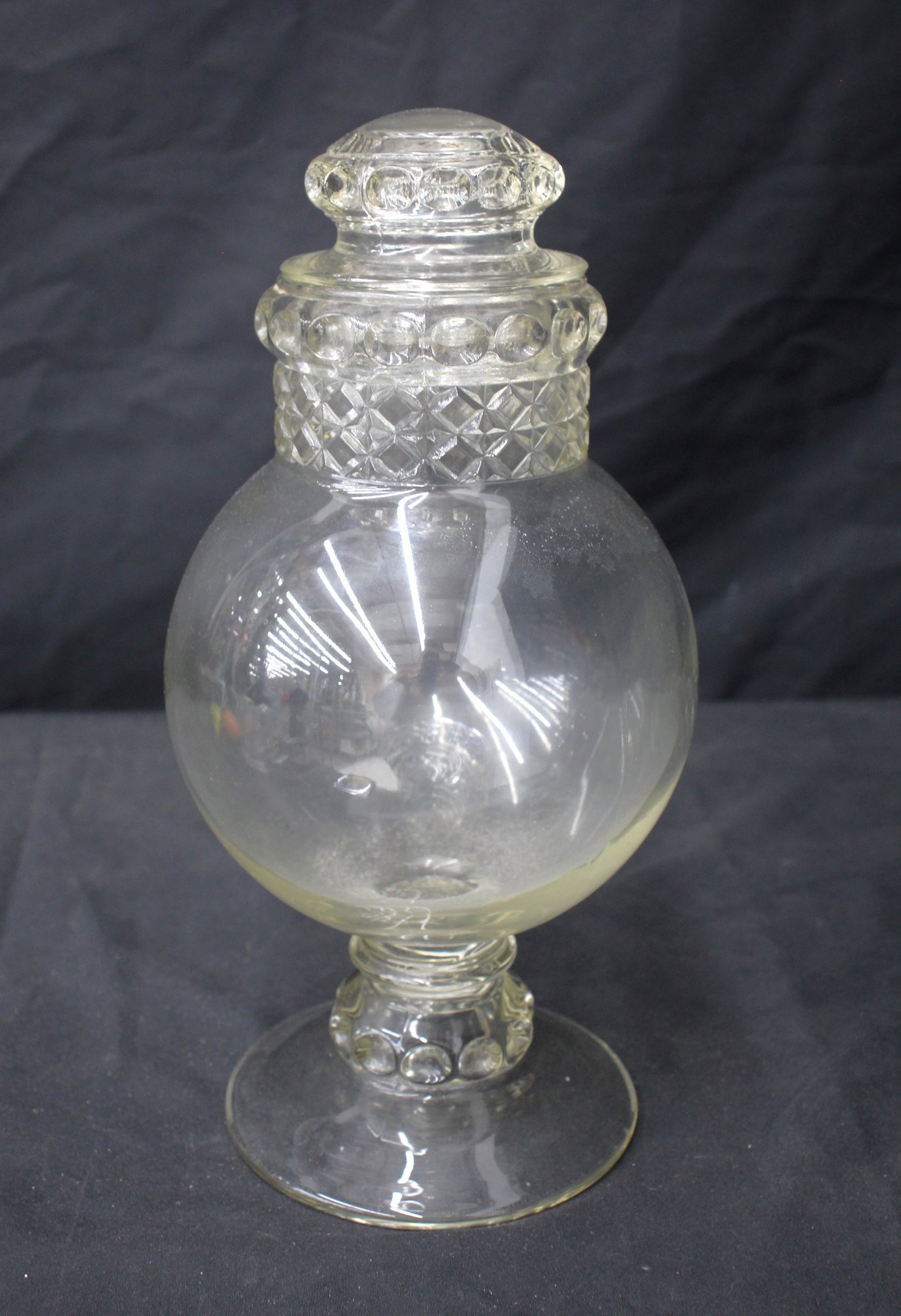 his antique Tiffin Dakota glass apothecary candy jar with its original lid is a marvel from a bygone era. Exquisitely designed, the jar stands proudly with a striking combination of elegant curves and detailed patterns that reflect the mastery of early glasswork.