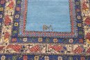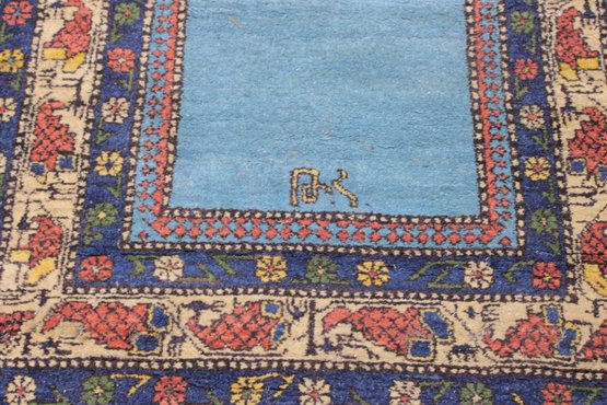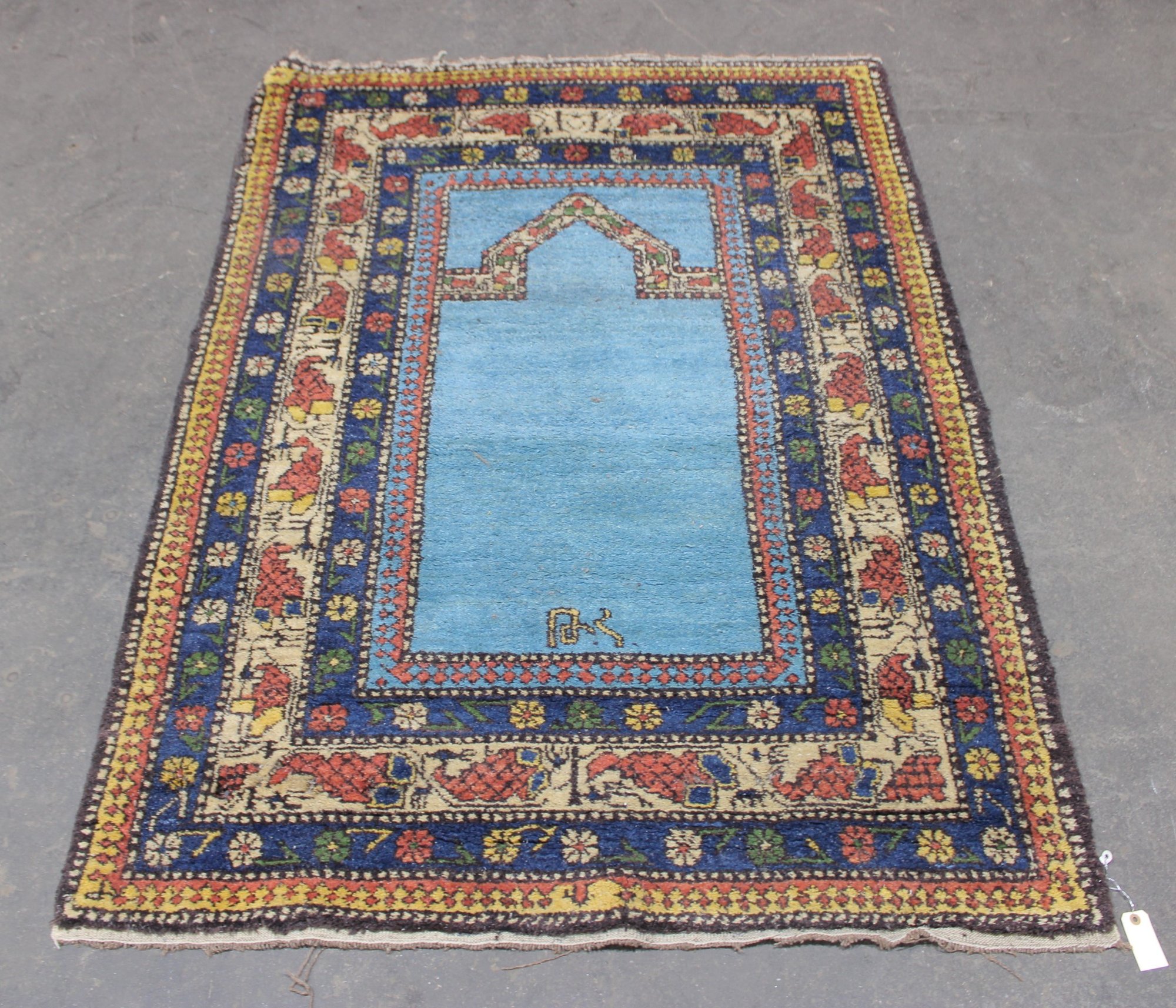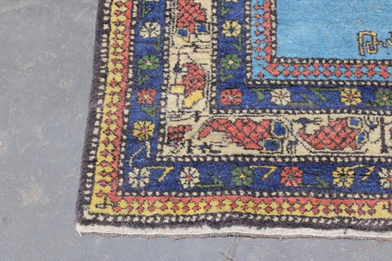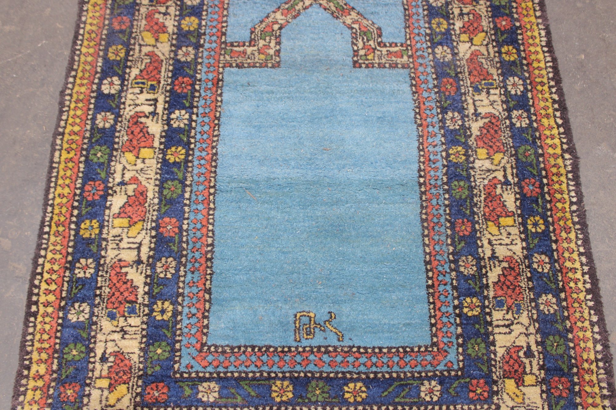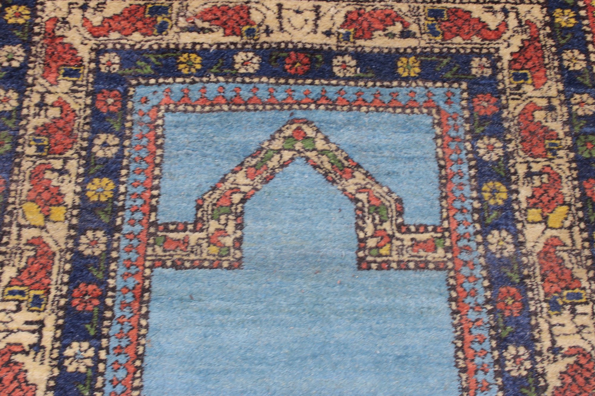 Beautiful antique Turkish prayer rug measuring approximately 6 feet by 4 feet, featuring a classic mihrab (prayer niche) design set against a soft sky-blue field. This handwoven wool rug showcases intricate geometric and floral borders in deep reds, blues, and warm ivory tones, reflecting traditional Anatolian craftsmanship.