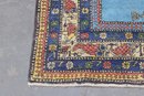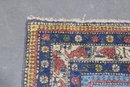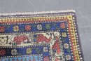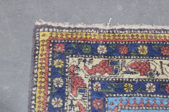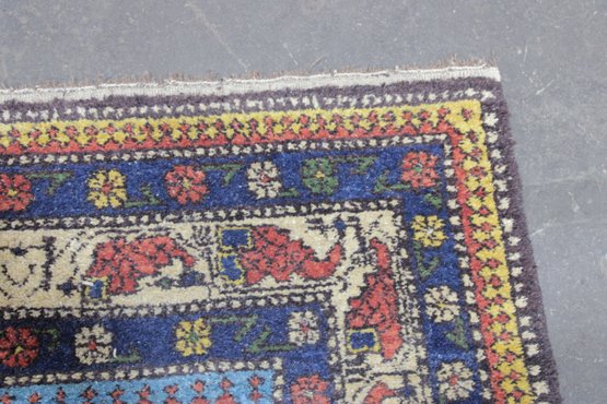 The rug displays authentic age and character, including natural wear consistent with antique textiles, adding to its charm and collectible appeal. A striking decorative piece suitable for display, layering, or use in a curated interior space.