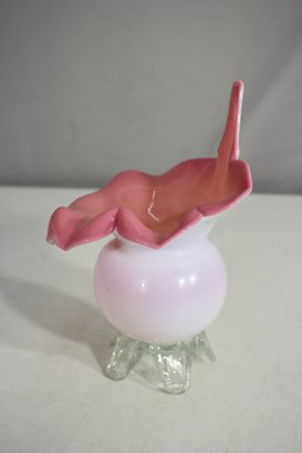 beautiful antique Victorian-era Jack-in-the-Pulpit vase, featuring a striking pink and white opalescent glass design with clear applied feet. These delicate art glass pieces showcase intricate craftsmanship with ruffled, flared rims and an elegant, organic form.