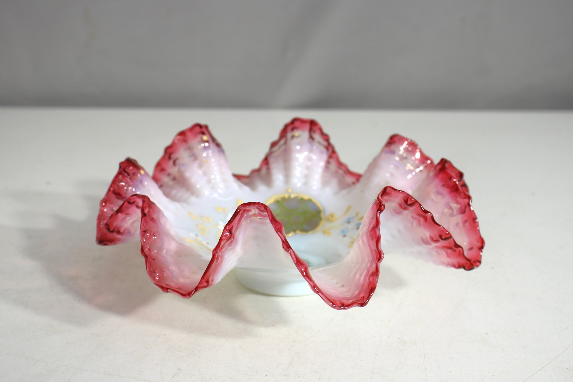 This exquisite antique Victorian art glass bowl features a delicate ruffled edge with a deep cranberry pink trim, transitioning into a soft opalescent white body. Beautifully hand-painted with gold detailing, floral motifs, and a central romantic scene, this elegant bowl embodies the fine craftsmanship of the late 19th to early 20th century.