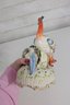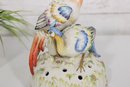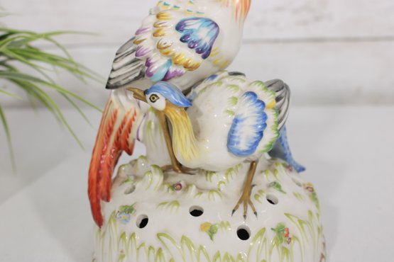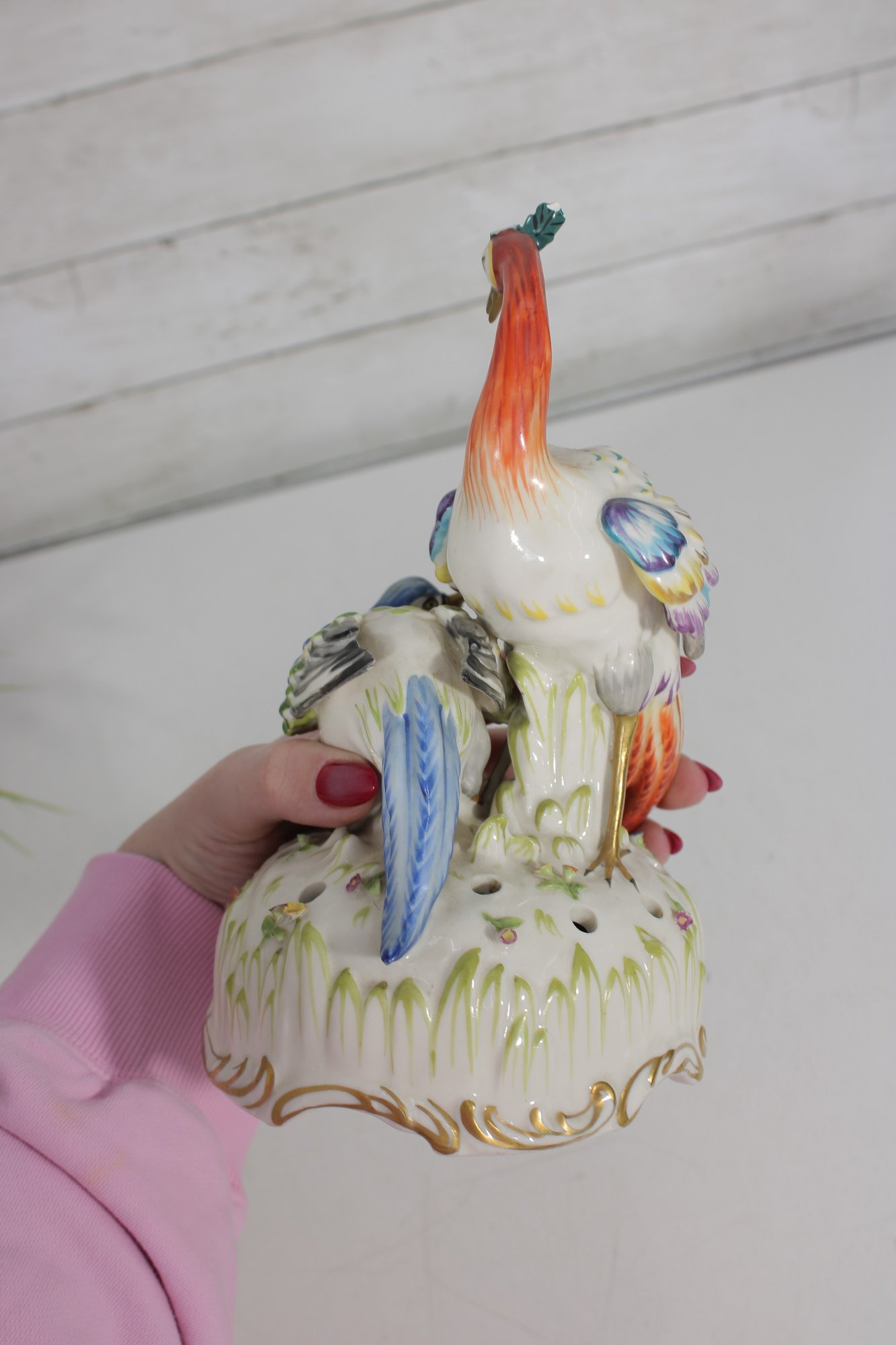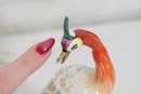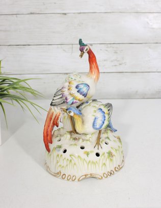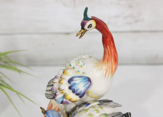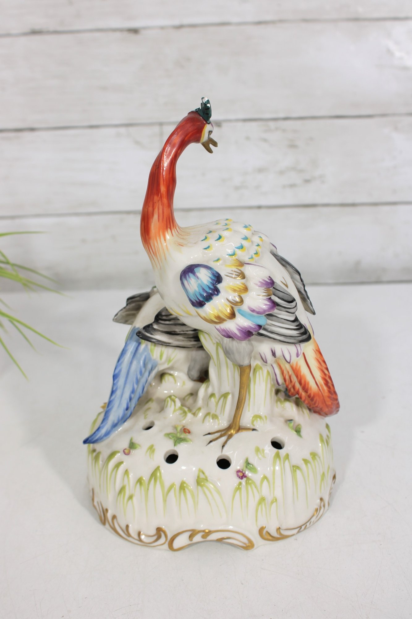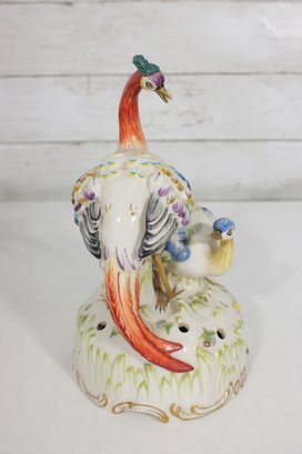 antique Von Schierholz porcelain figurine featuring an elegant peacock with a peachick, beautifully hand-painted in vibrant colors. This exquisite German piece showcases fine craftsmanship, with intricate detailing in the feathers and delicate hand-painted accents in shades of blue, green, gold, and fiery orange.