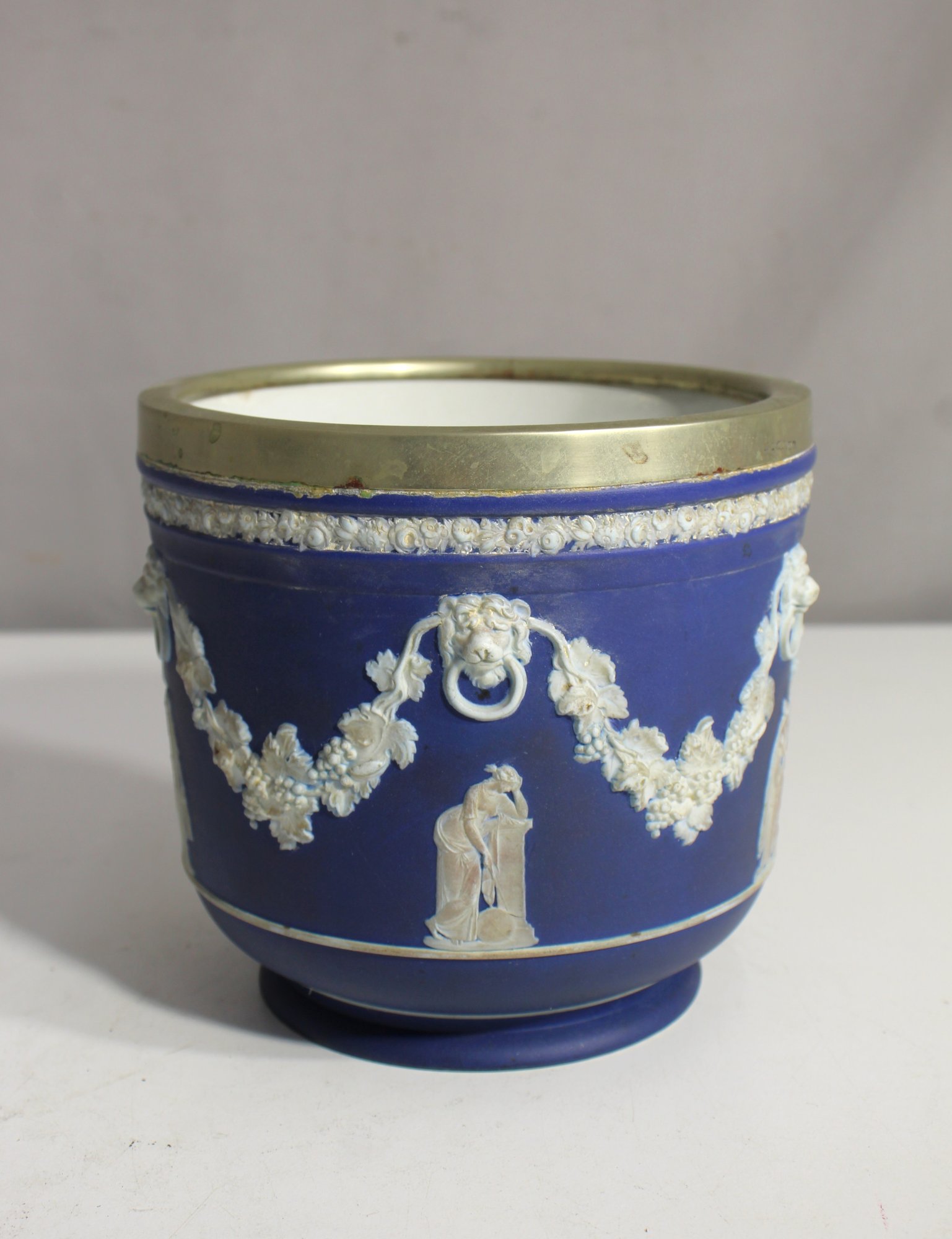 This elegant antique Wedgwood blue jasperware planter features classic white neoclassical reliefs and a decorative metal rim. The iconic garland and figure design is beautifully displayed on the matte blue ceramic background, typical of Wedgwood’s timeless style. The planter is marked "Wedgwood" on the base and features a hallmark on the metal rim, adding to its authenticity.The planter shows an age-related crack on the interior (visible in the photos). The crack does not affect the structural integrity of the piece, and it remains a highly decorative and collectible item.