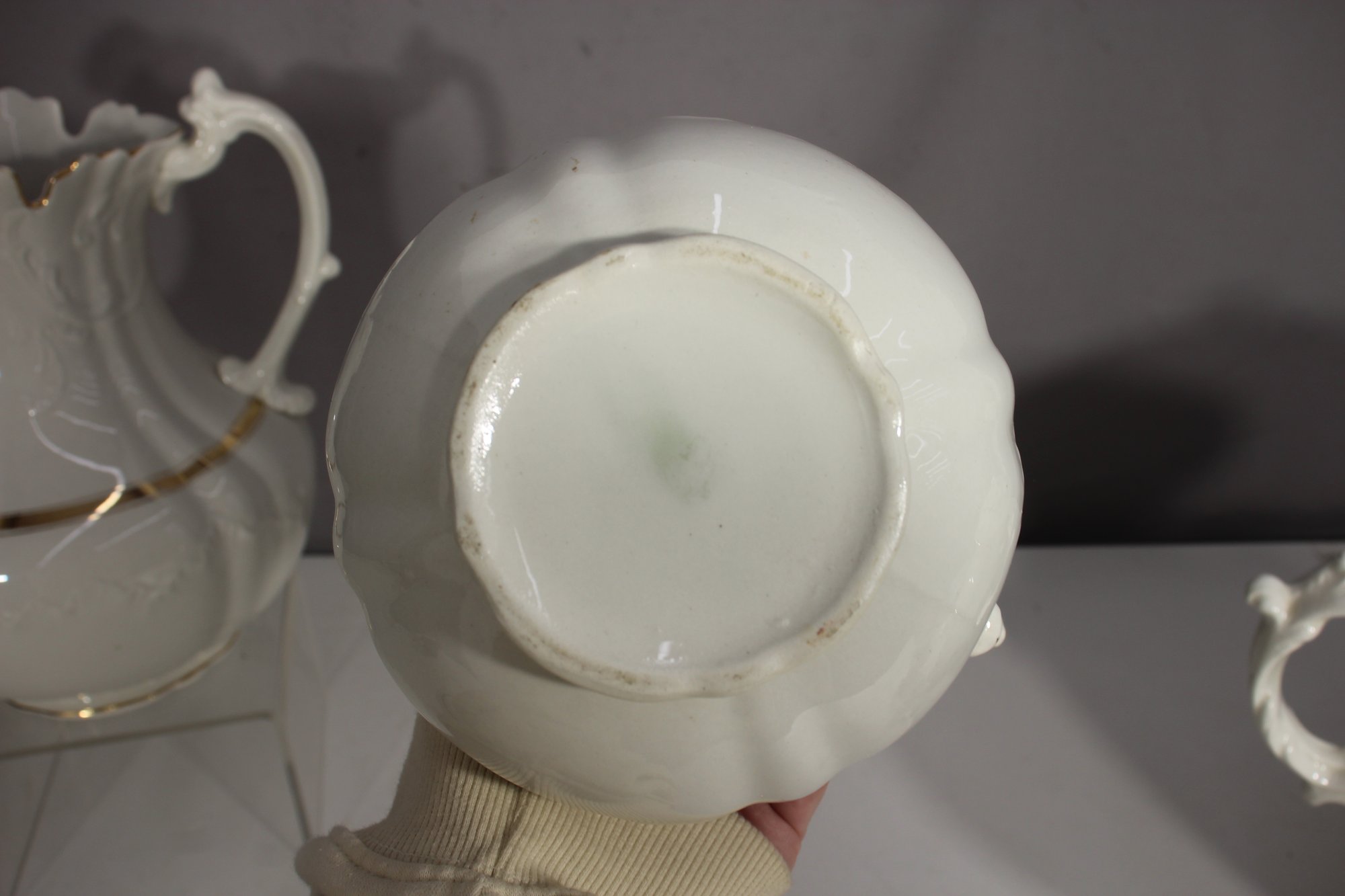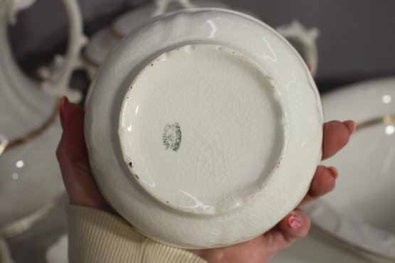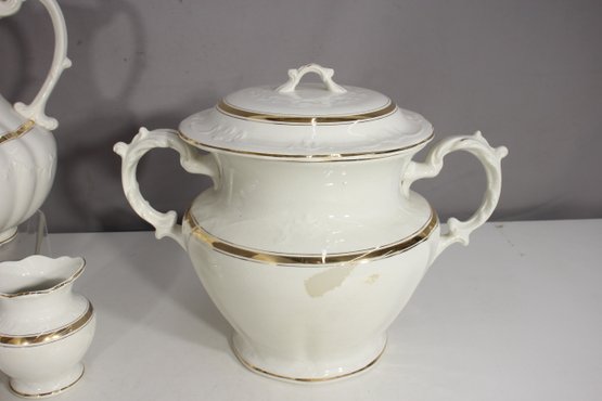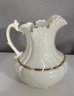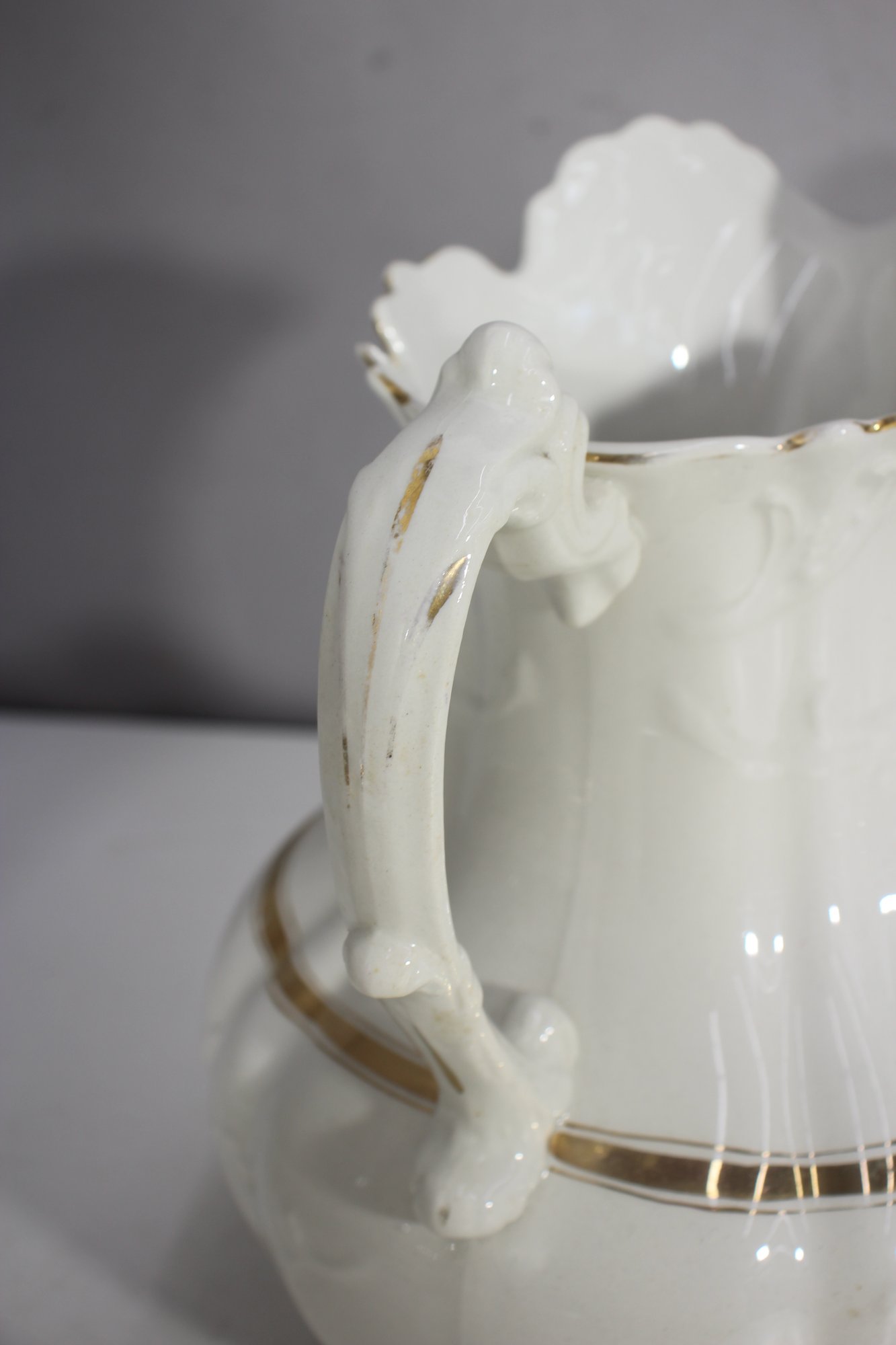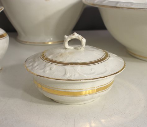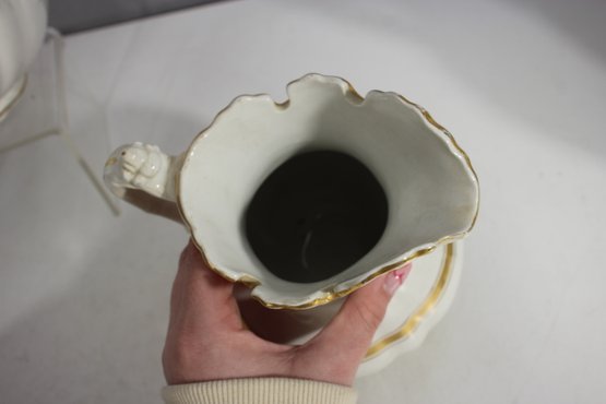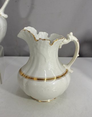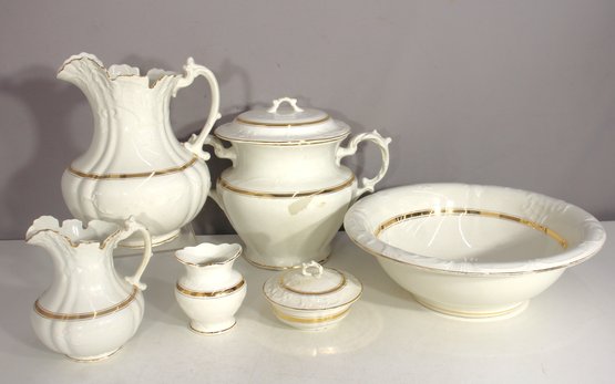 antique porcelain wash basin set is a timeless example of fine craftsmanship, featuring delicate gold trim and intricate embossed details. The set includes a variety of beautifully shaped pieces, perfect for collectors of vintage ceramics or period décor enthusiasts.