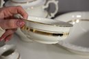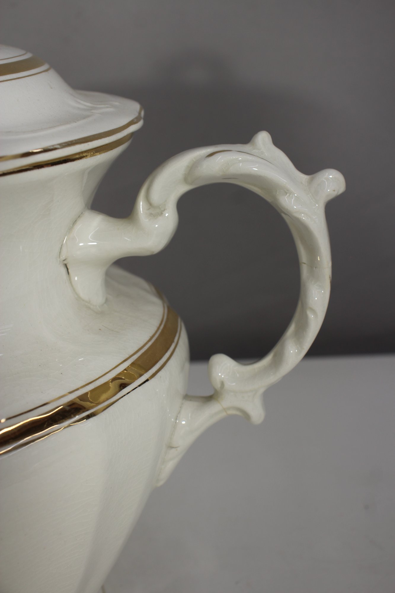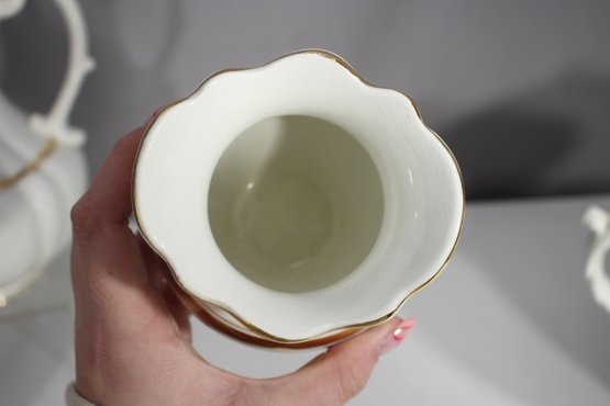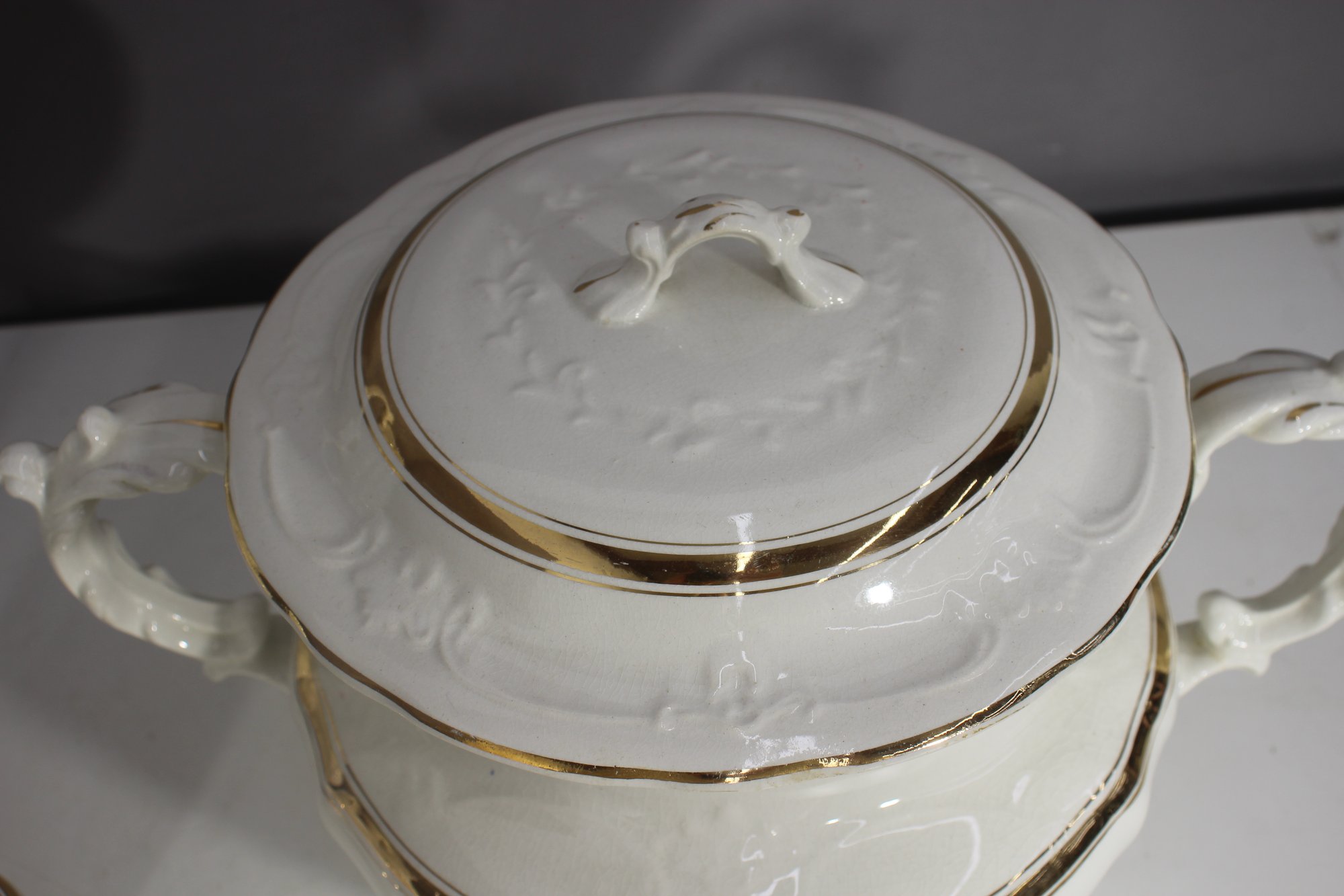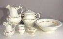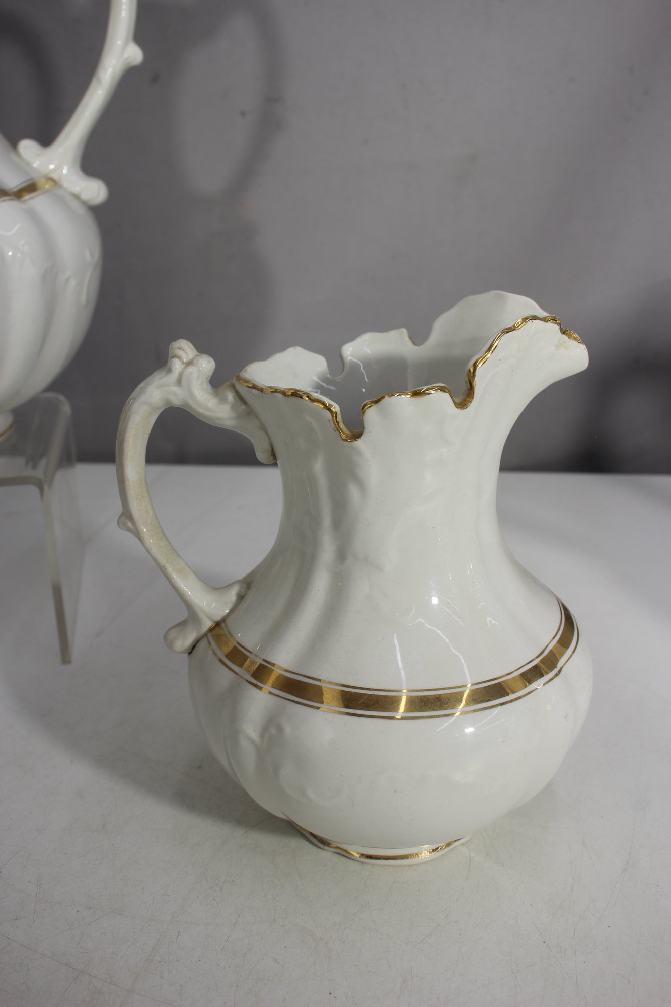 antique porcelain wash basin set is a timeless example of fine craftsmanship, featuring delicate gold trim and intricate embossed details. The set includes a variety of beautifully shaped pieces, perfect for collectors of vintage ceramics or period décor enthusiasts.