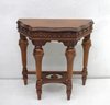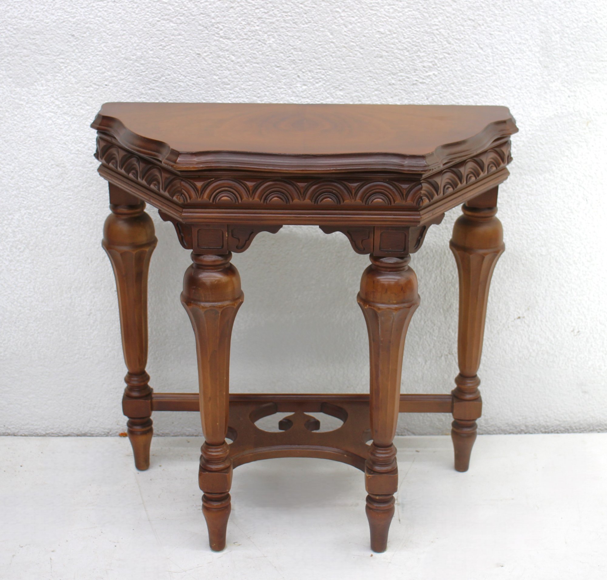 This is a beautifully crafted antique wooden accent table featuring intricate carvings and a rich, natural wood finish. Its unique shape and detailed apron design make it a standout piece perfect for any room. The table rests on four elegantly turned legs connected by a decorative stretcher for added stability and charm. Ideal as a side table, entryway accent, or display piece.