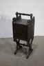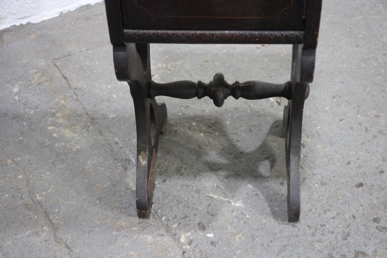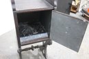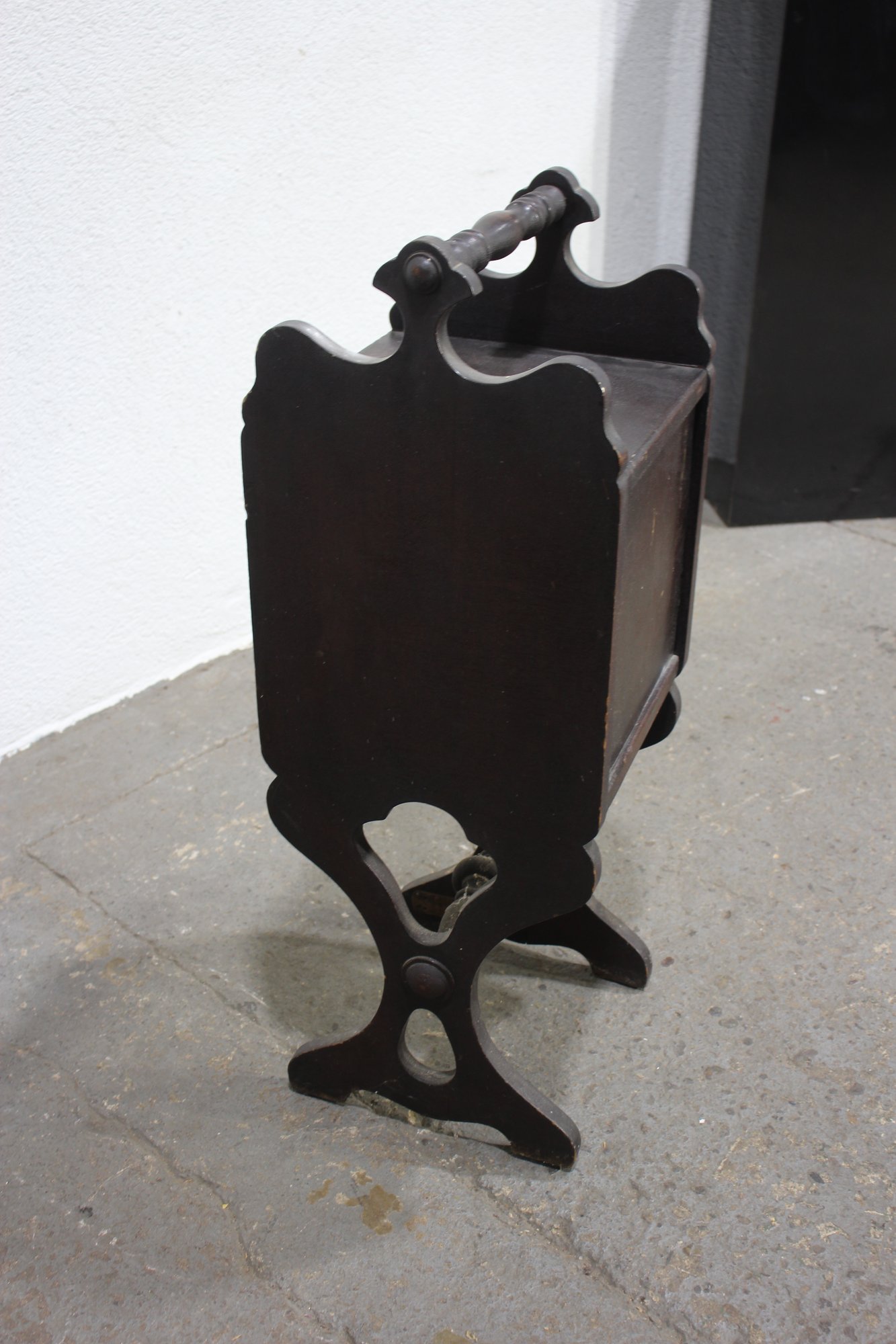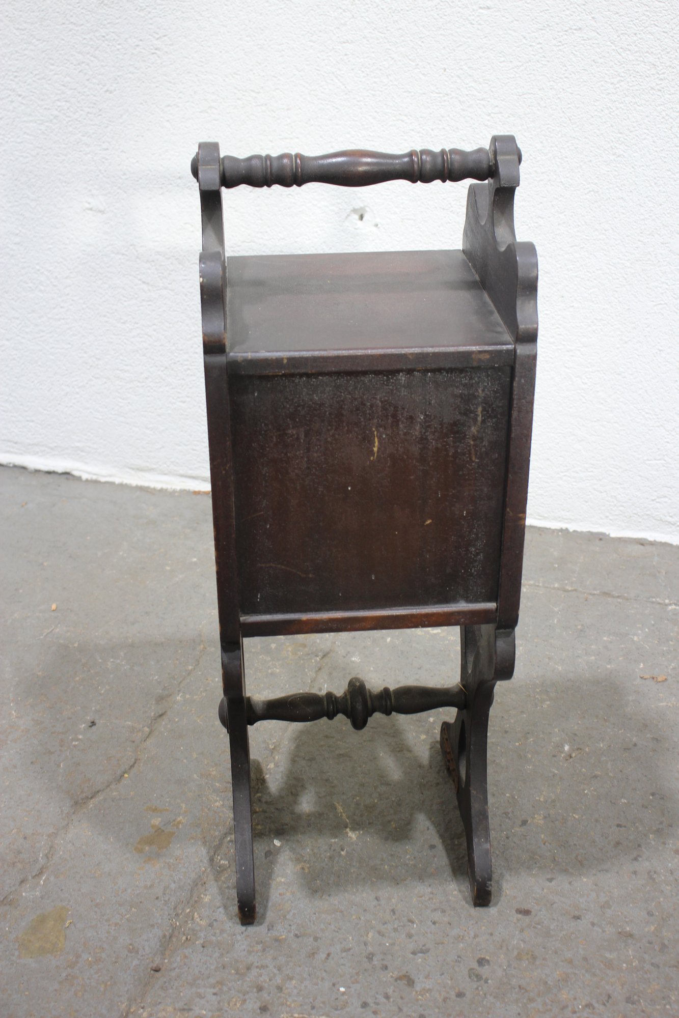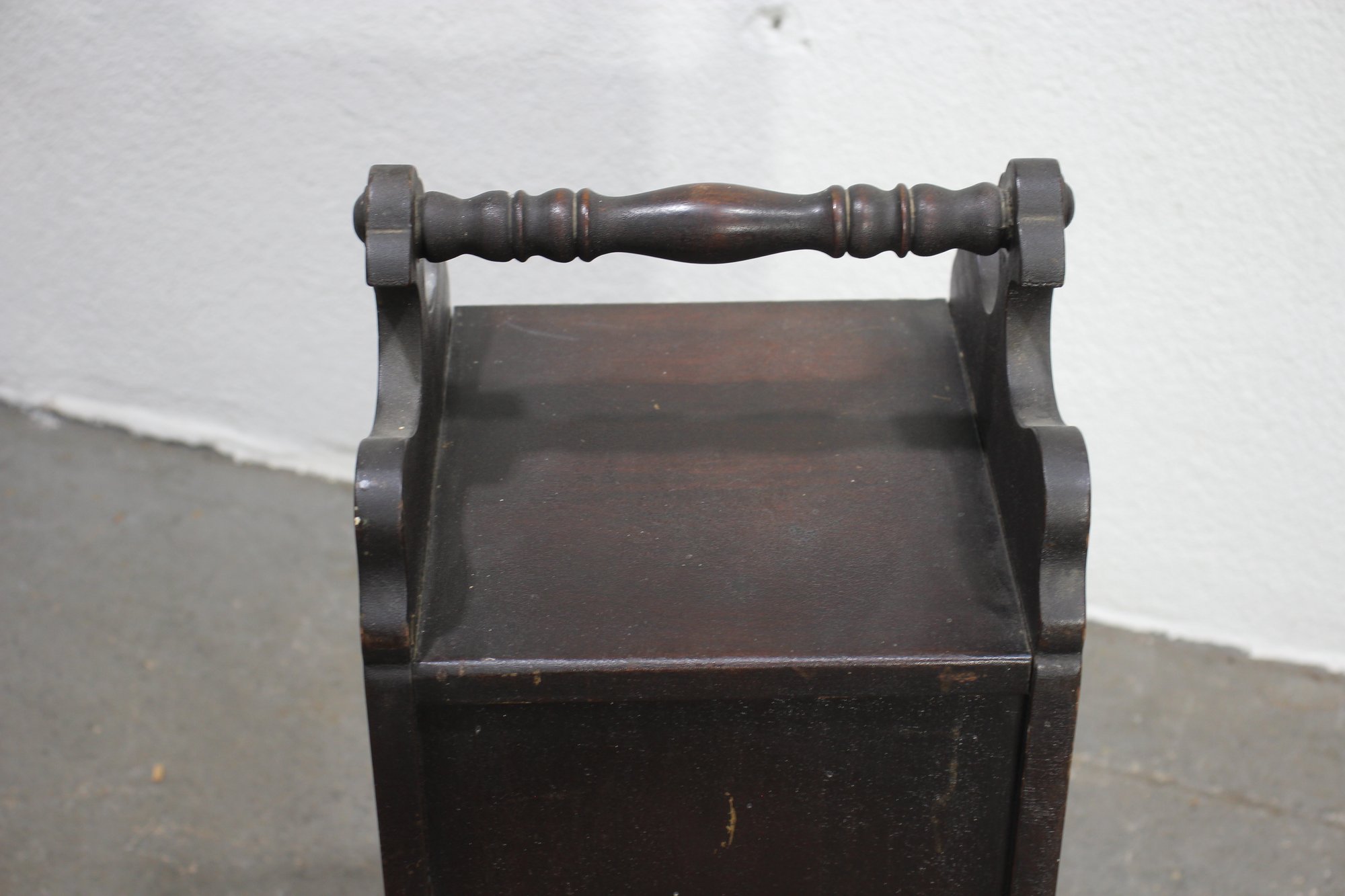 antique wooden coal scuttle offers both functionality and vintage charm. Crafted from rich, dark wood, it features a delicately carved handle and ornate side details. The scuttle opens to reveal a spacious interior with a metal-lined compartment, originally designed for storing coal or kindling.