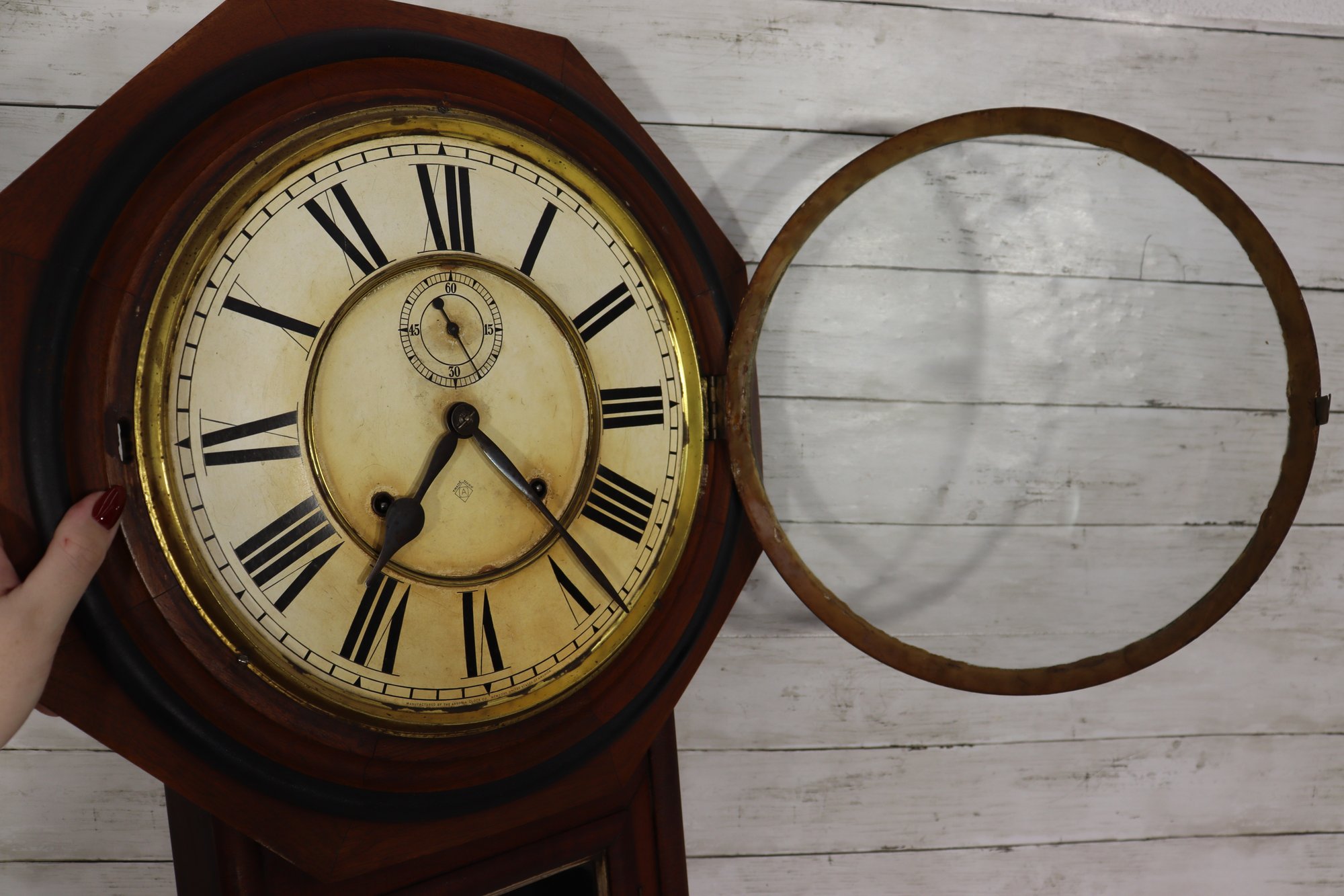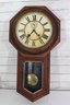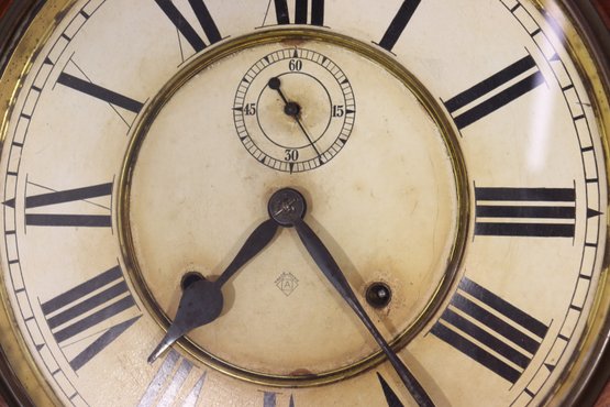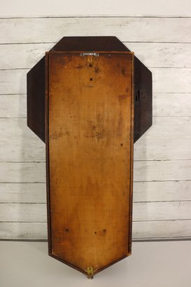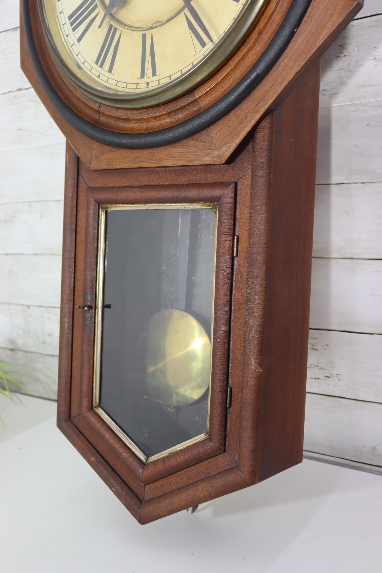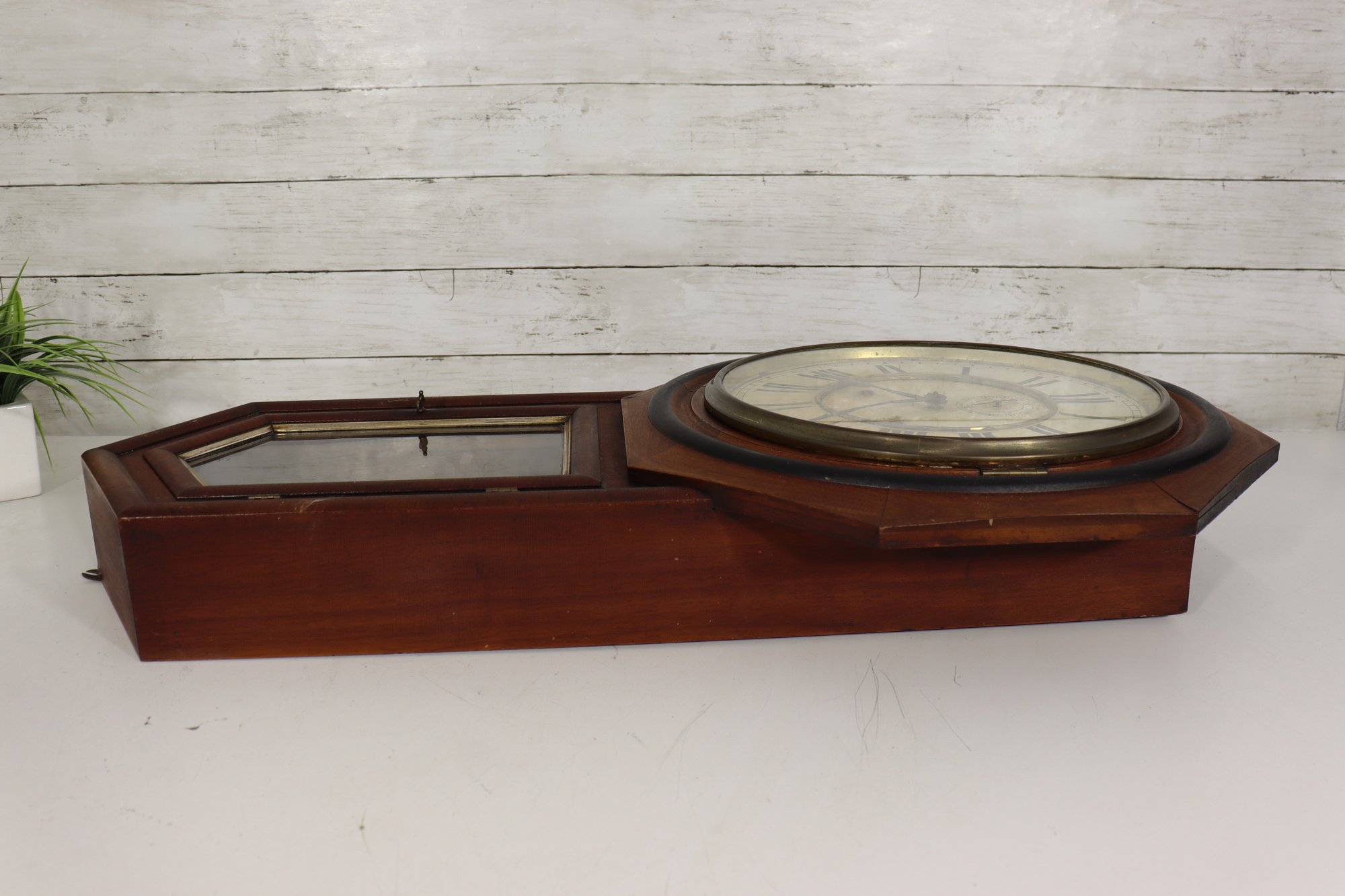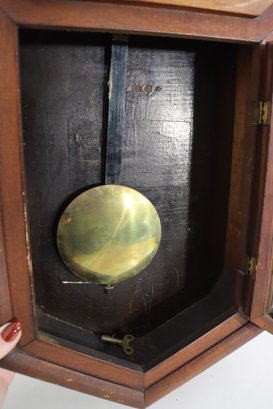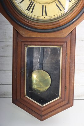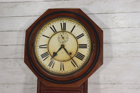Beautiful antique wooden schoolhouse style regulator wall clock with lower glass pendulum window. Classic octagon top / drop style case with Roman numeral dial and second sub-dial. This is a fantastic early clock display piece with great patina, original style charm, and a wonderful vintage look.