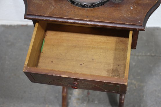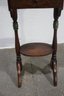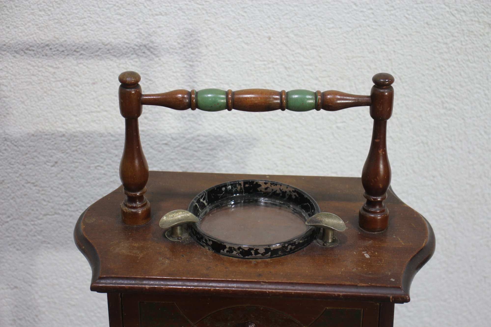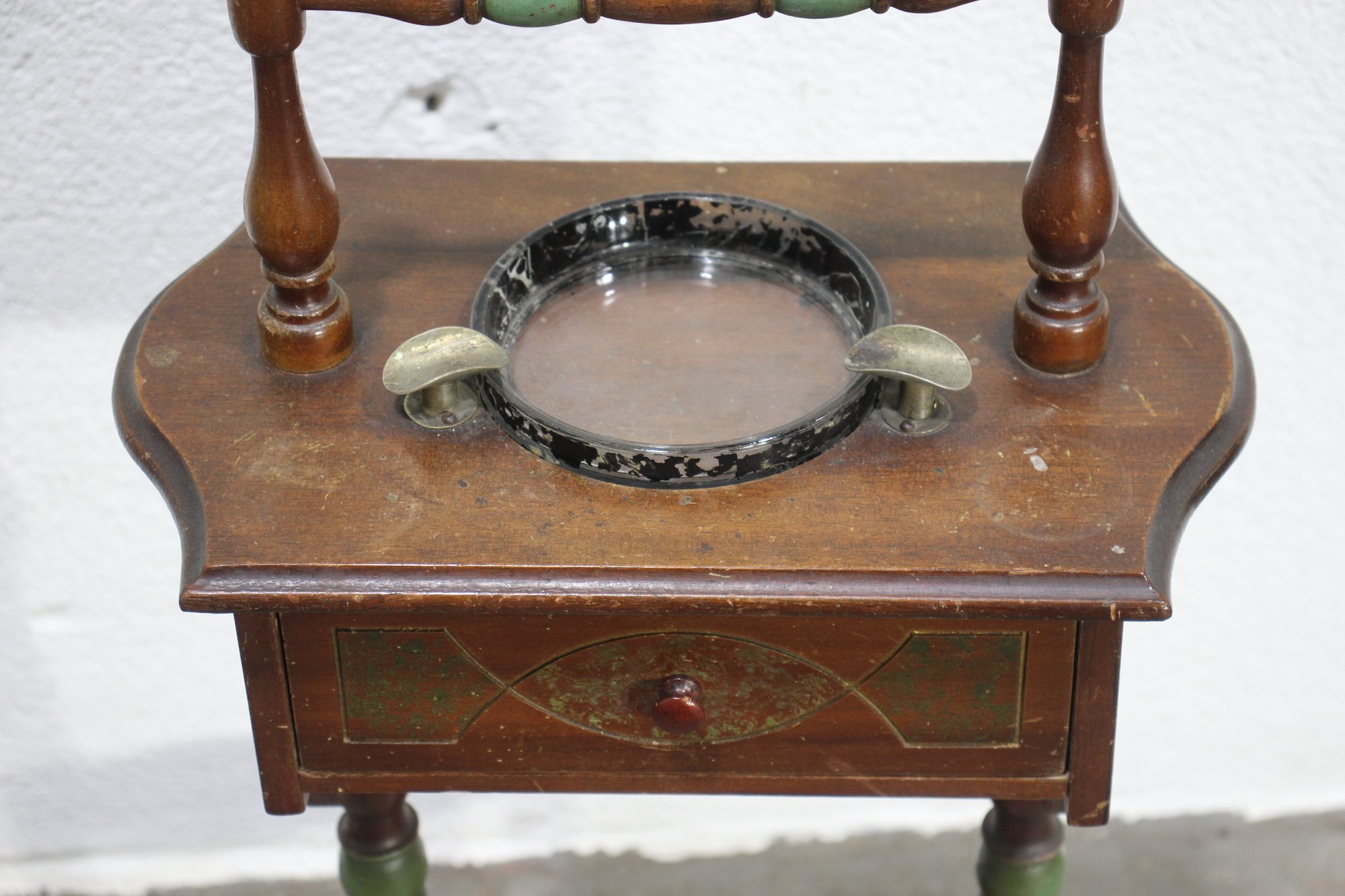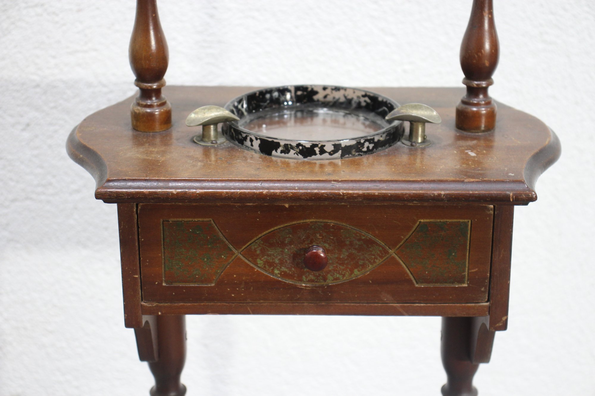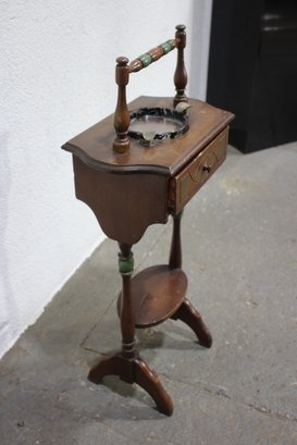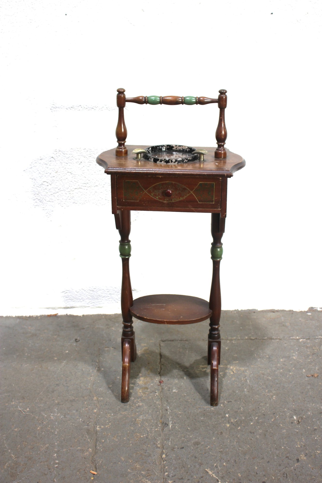 This charming antique smoking stand is a perfect blend of functionality and vintage appeal. Crafted from solid wood, it features a decorative handle, a single drawer for storage, and a built-in ashtray with brass accents. The intricate design includes turned legs with subtle green-painted details and a lower circular shelf for added utility.