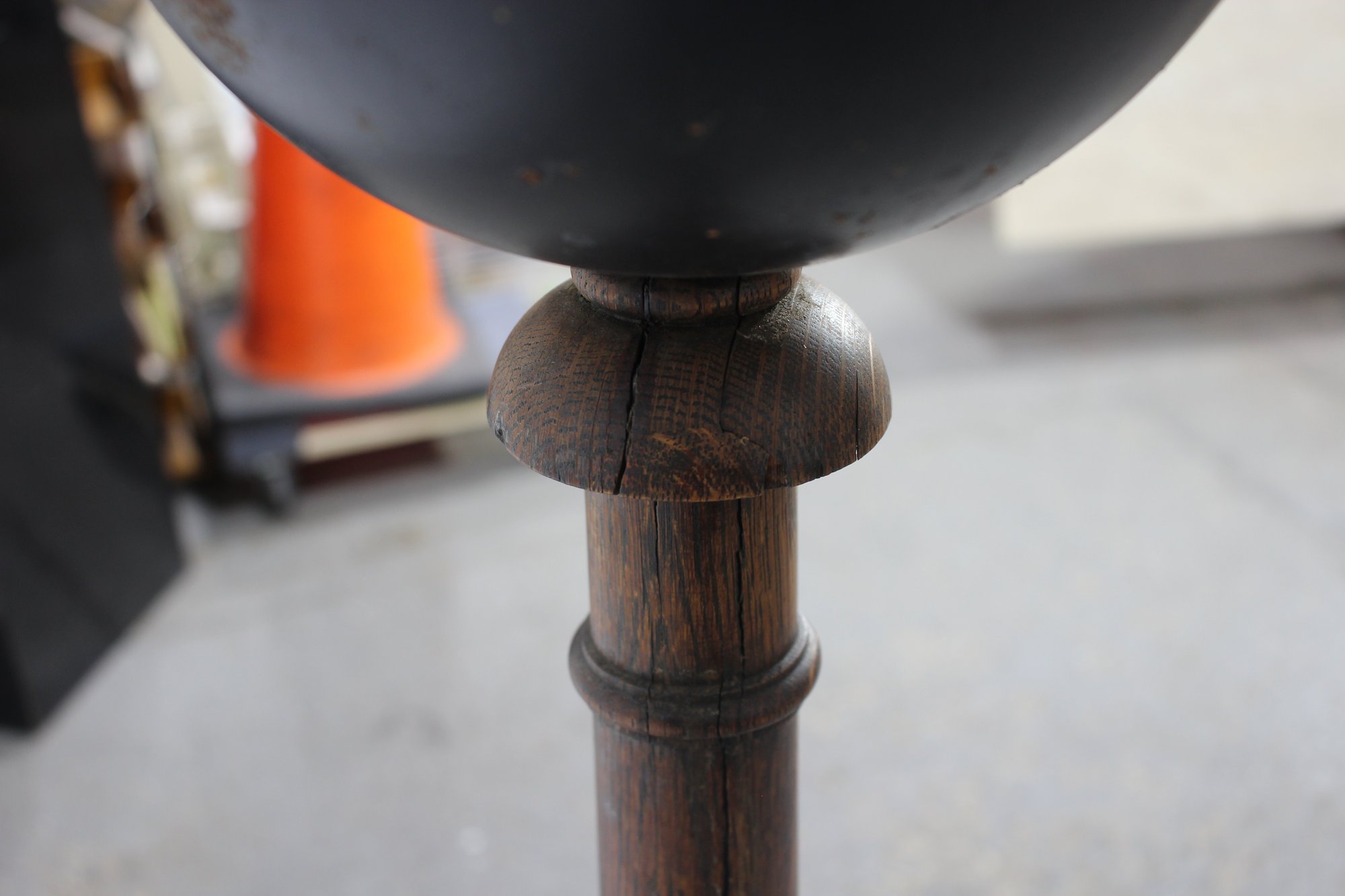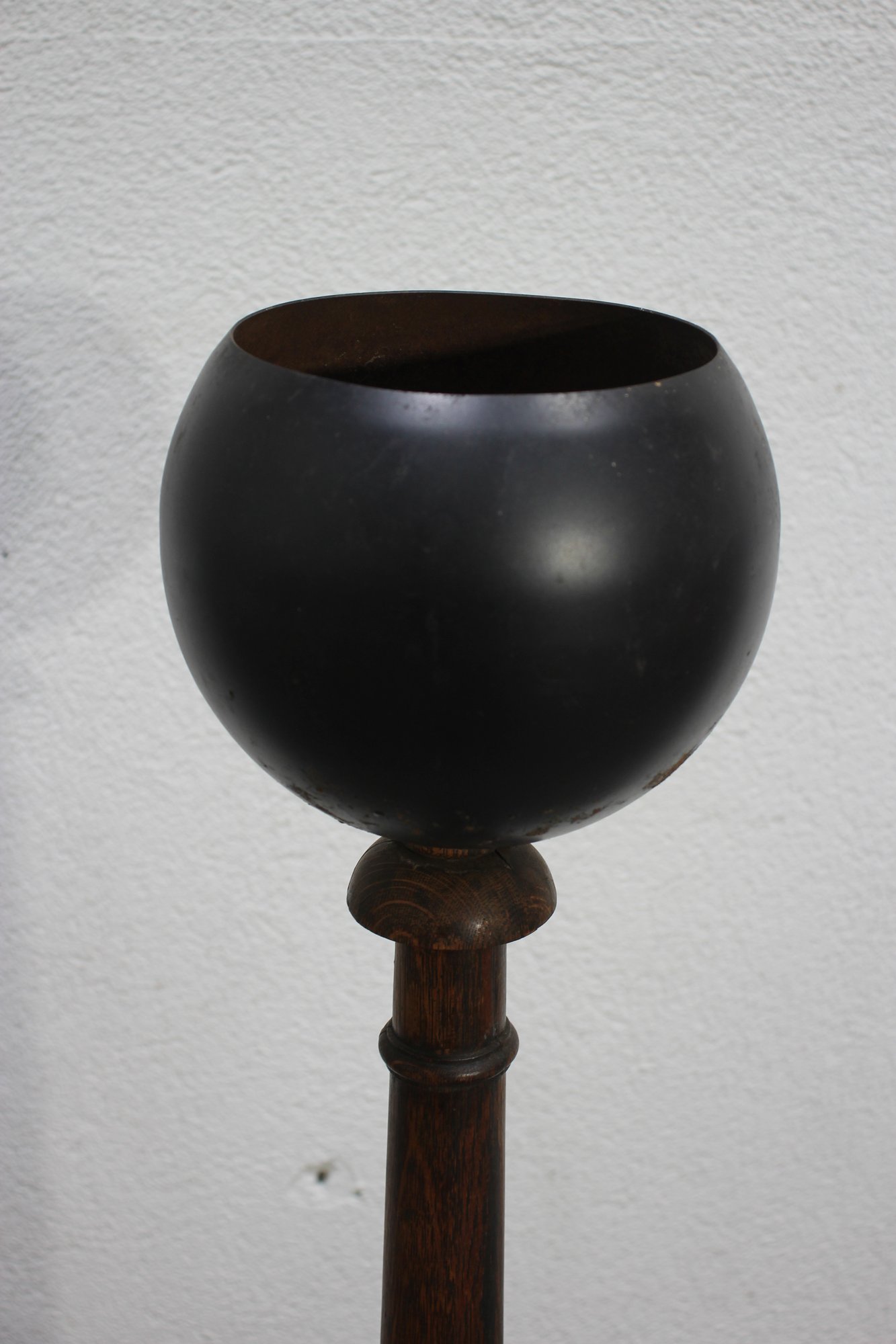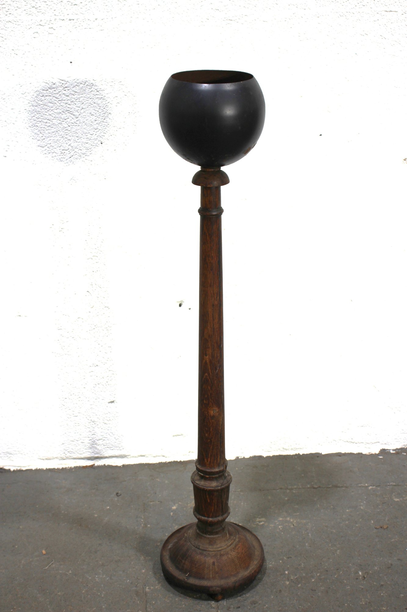 his charming antique stand offers a unique combination of rustic craftsmanship and functional design. The stand features a turned wooden base with a rich, weathered patina that speaks to its age and history. The removable metal bowl atop the stand adds versatility and character, making it suitable for various uses such as a plant stand, decorative centerpiece, or storage solution.