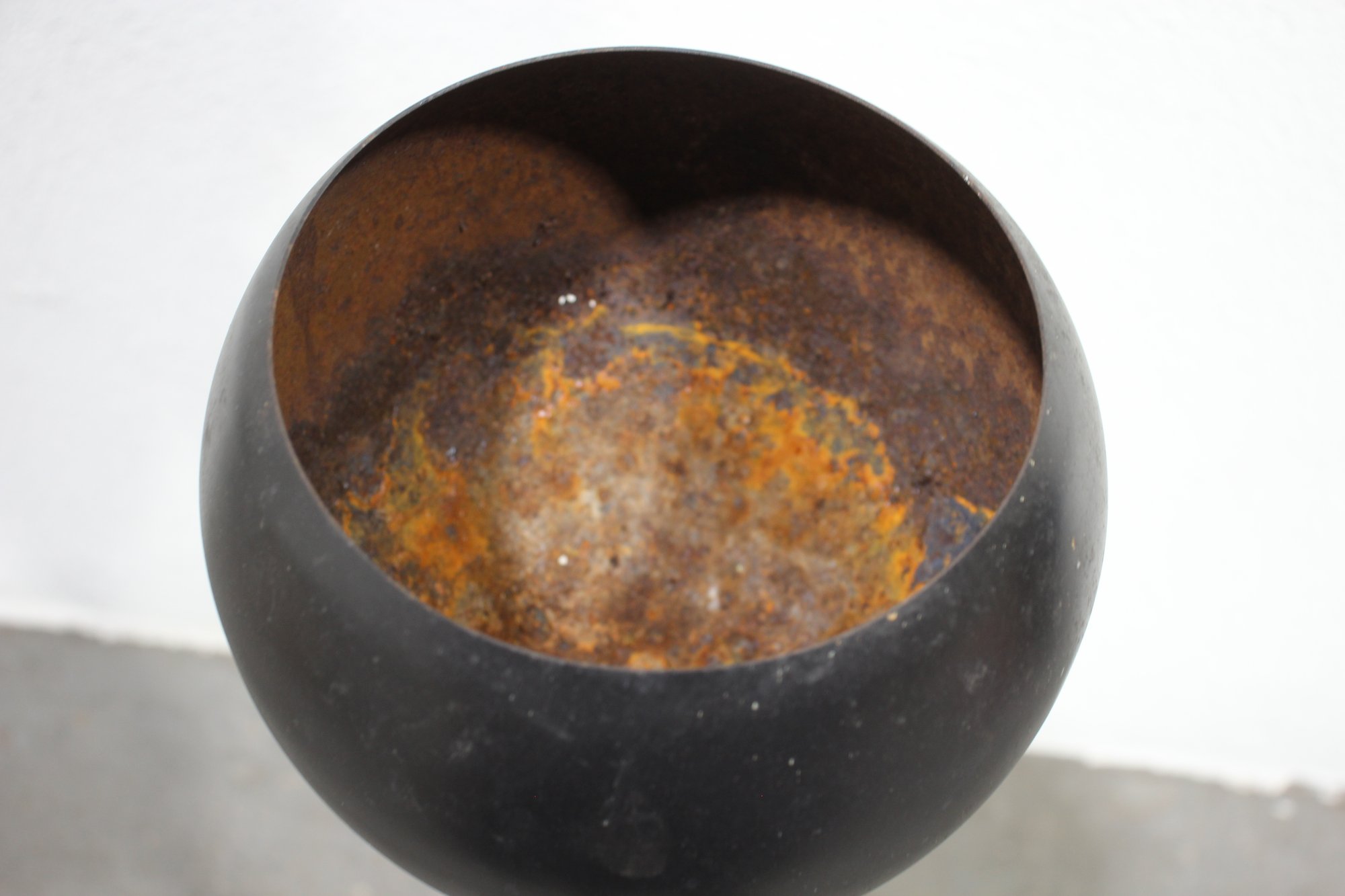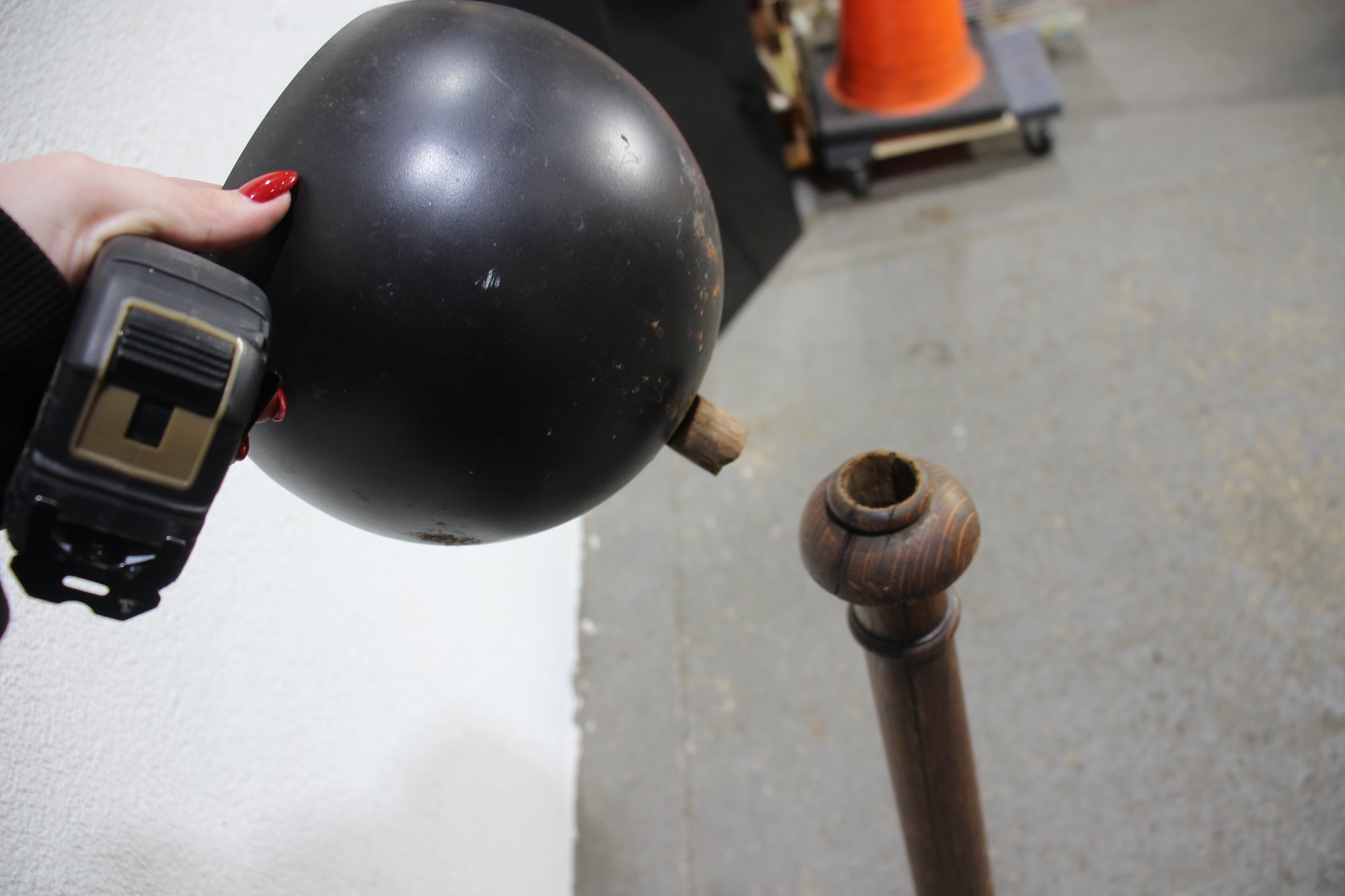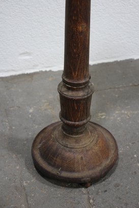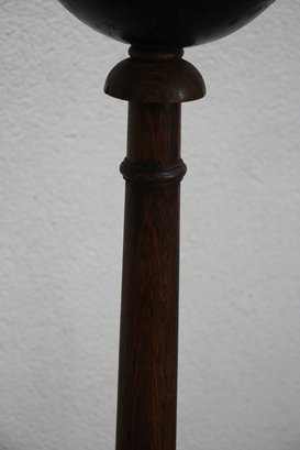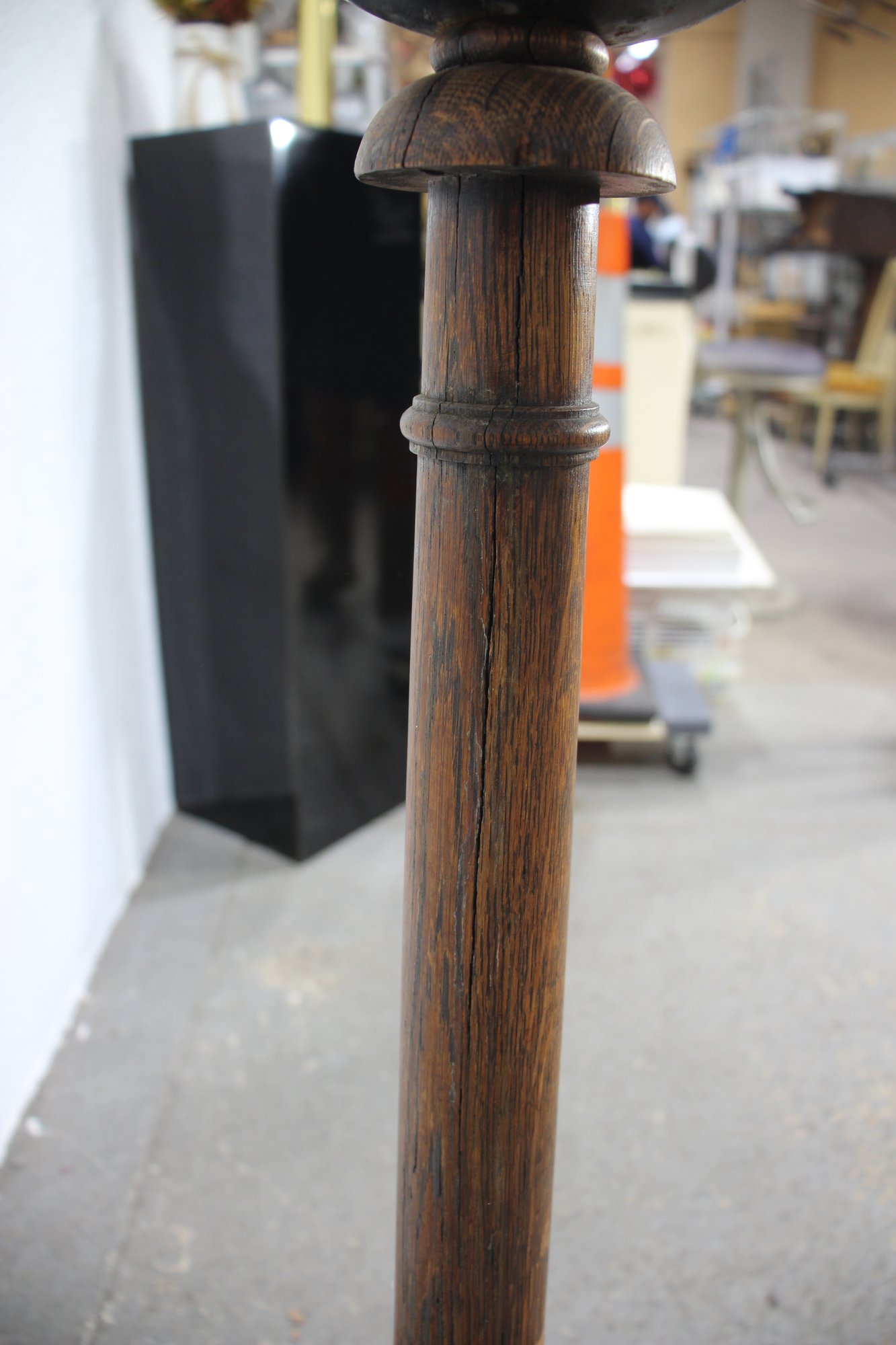 his charming antique stand offers a unique combination of rustic craftsmanship and functional design. The stand features a turned wooden base with a rich, weathered patina that speaks to its age and history. The removable metal bowl atop the stand adds versatility and character, making it suitable for various uses such as a plant stand, decorative centerpiece, or storage solution.