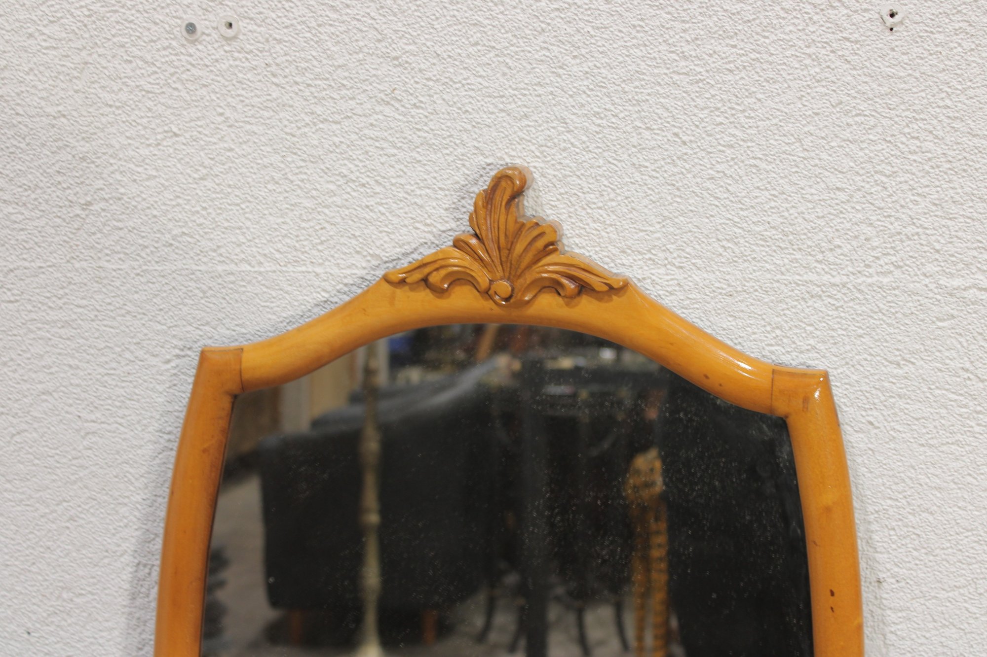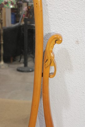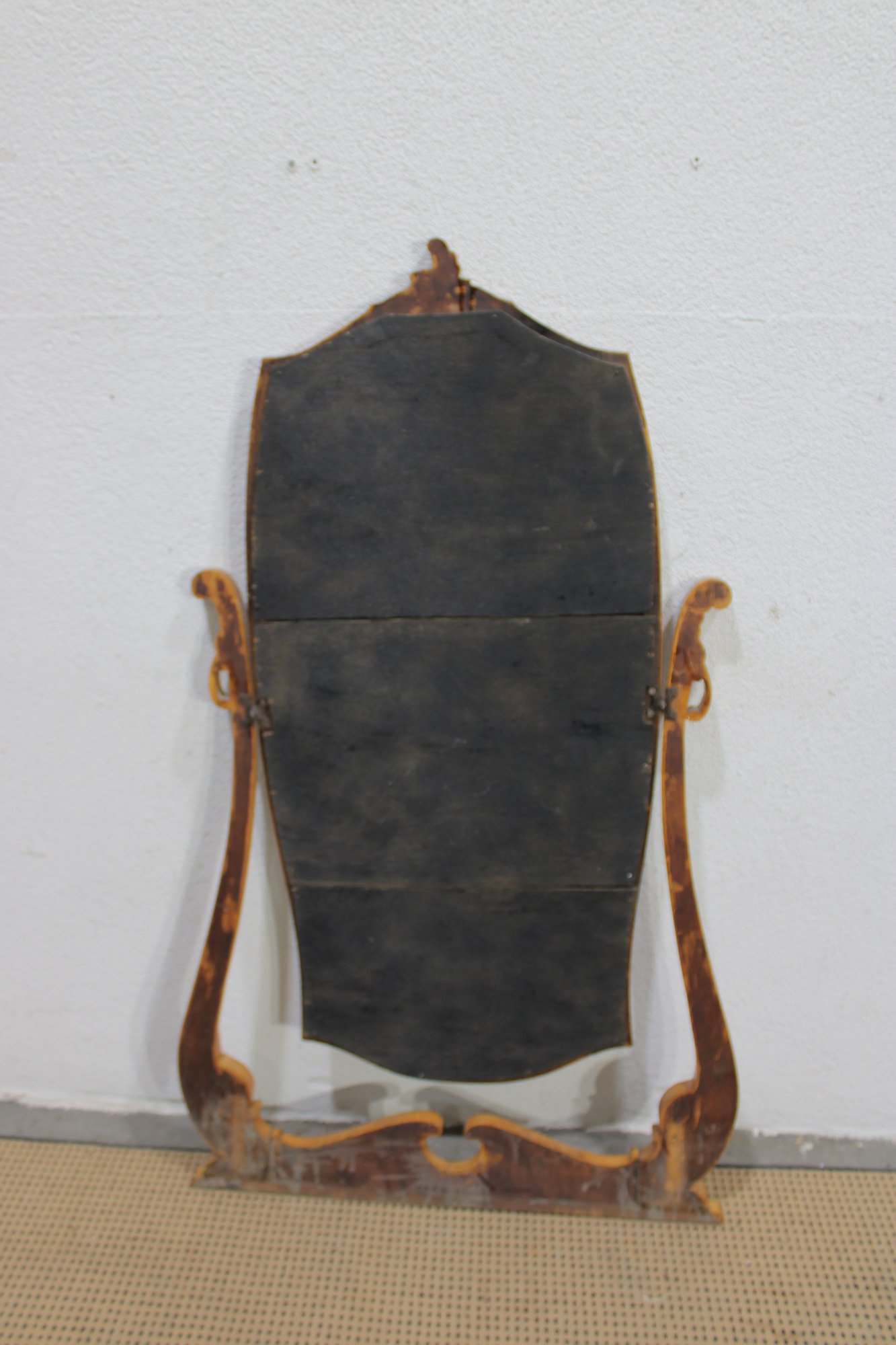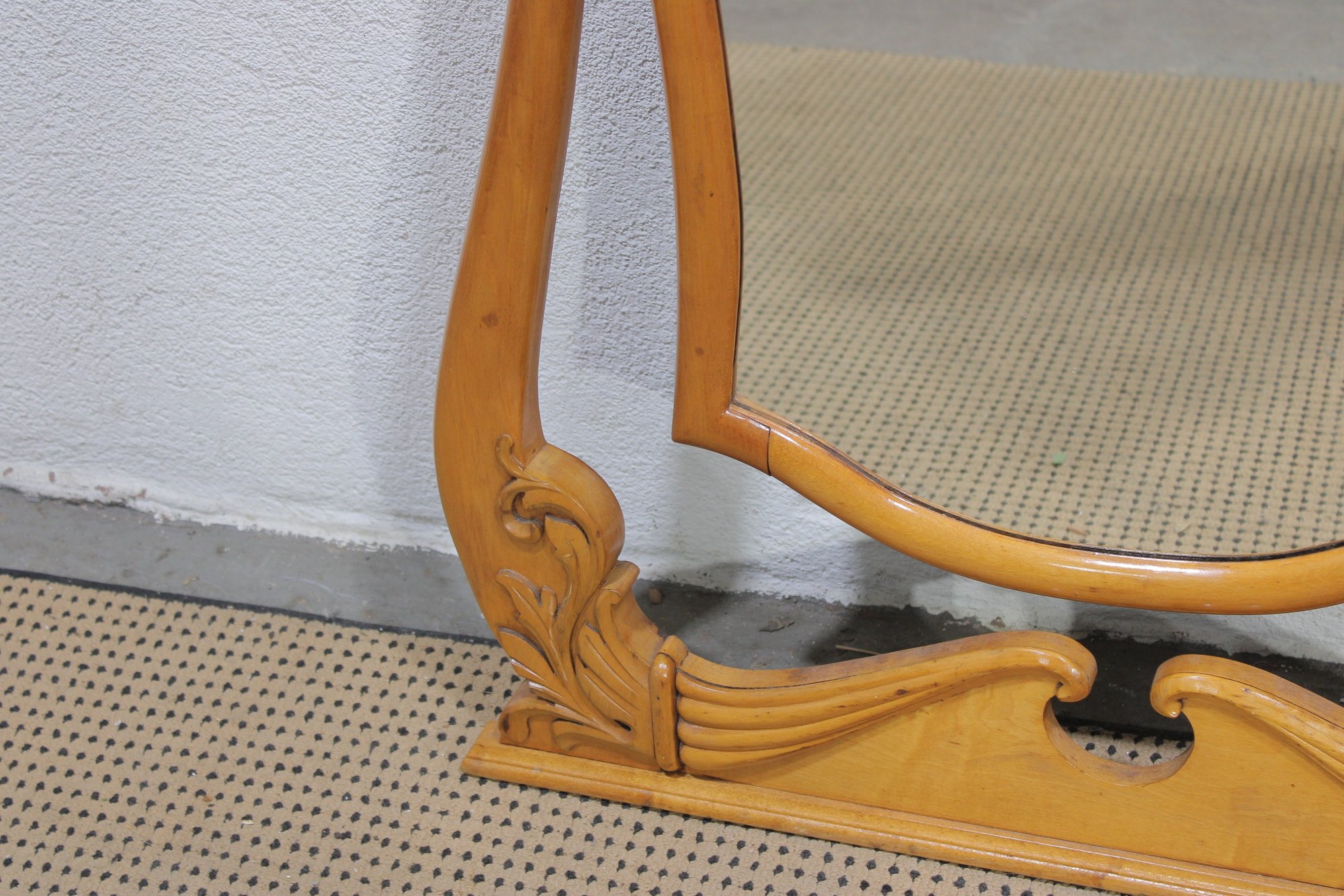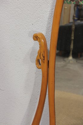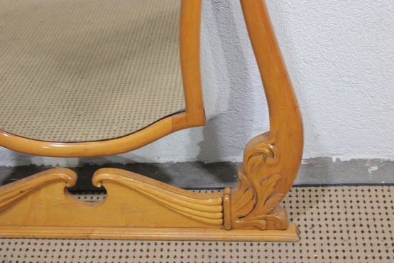 a beautiful antique wooden vanity mirror featuring an ornately carved frame with graceful curves and decorative detailing. Designed in a classic style, this mirror makes a striking statement as a dresser-top vanity mirror, tabletop accent, or freestanding display piece.