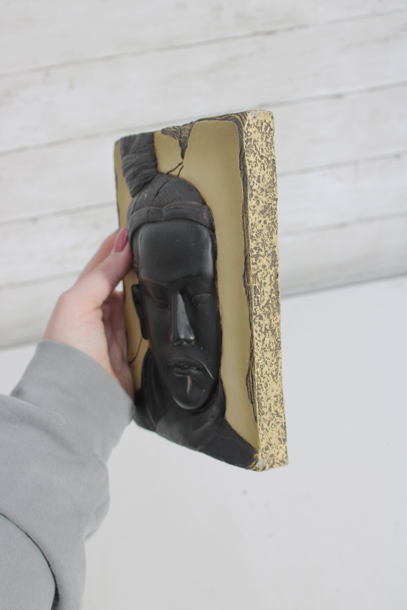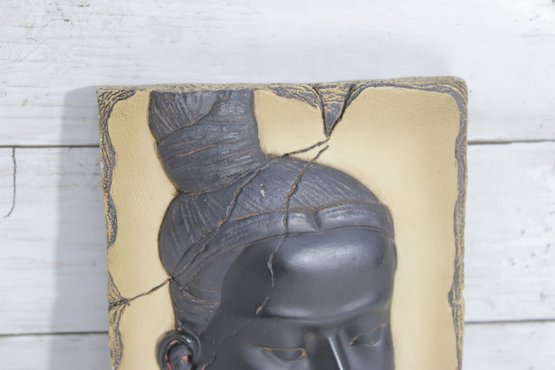 This piece combines sculptural relief with a textured, cracked-edge design and a gold-tone background, giving it a distinctive, dimensional look perfect for display.