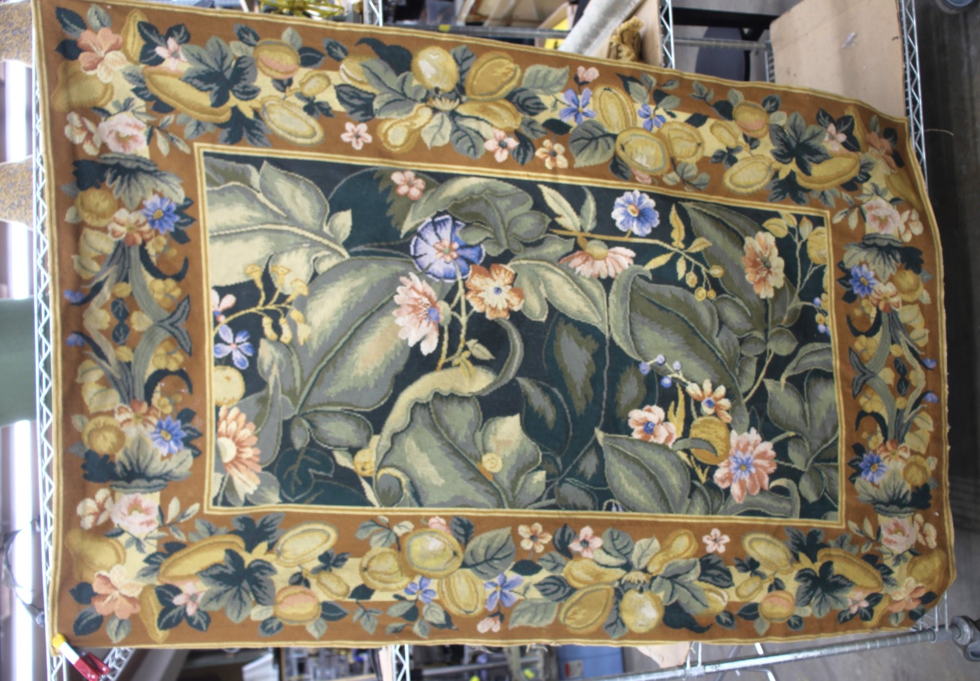 a stunning needlepoint rug that beautifully captures the essence of a lush garden. This piece features an intricate floral pattern with a rich palette of blues, yellows, and greens, surrounded by a decorative border that enhances its visual appeal. Each stitch contributes to a detailed depiction of blooming flowers and fruit, showcasing superb craftsmanship and attention to detail.