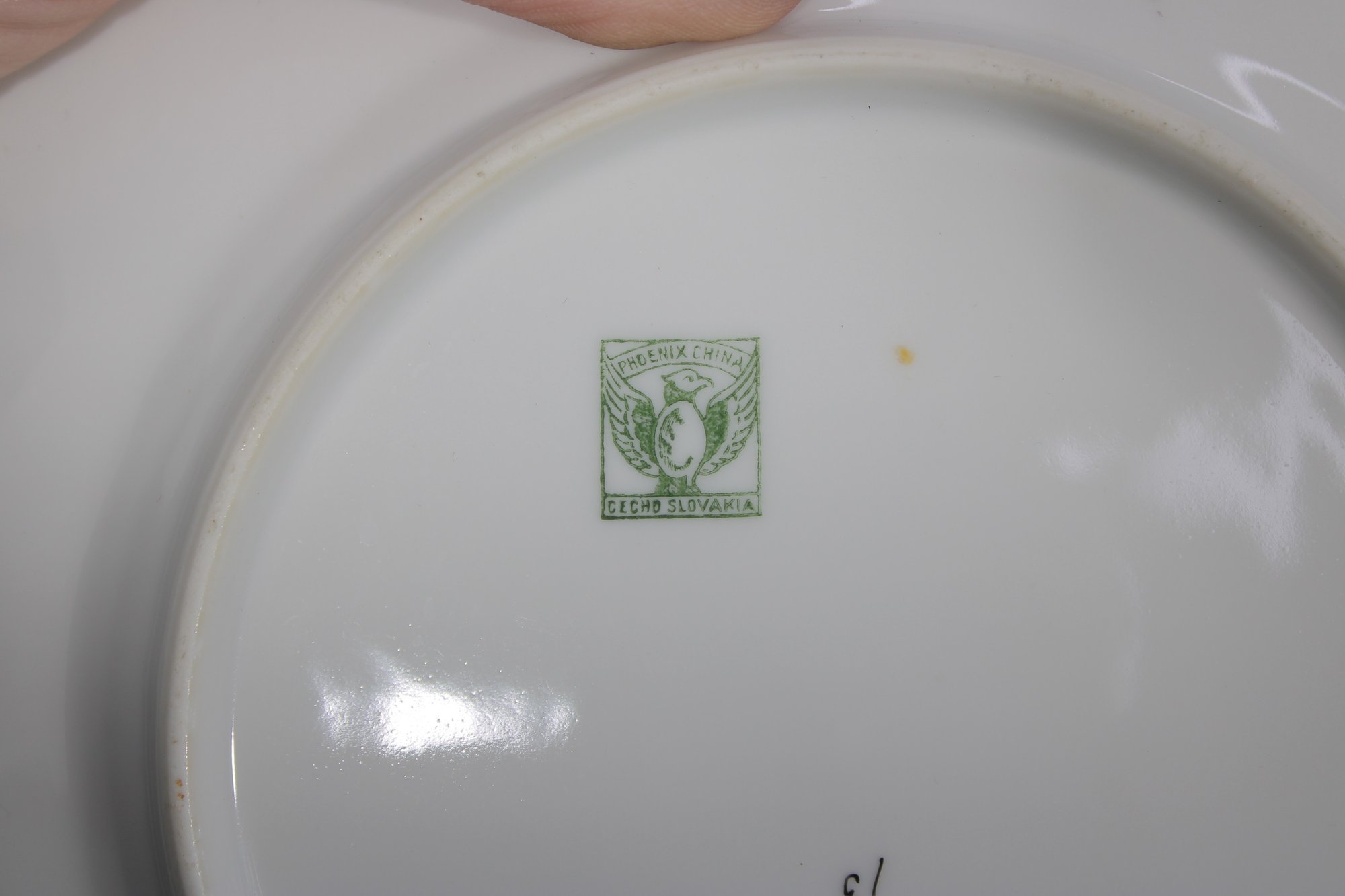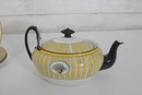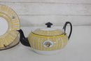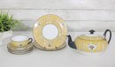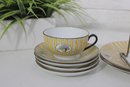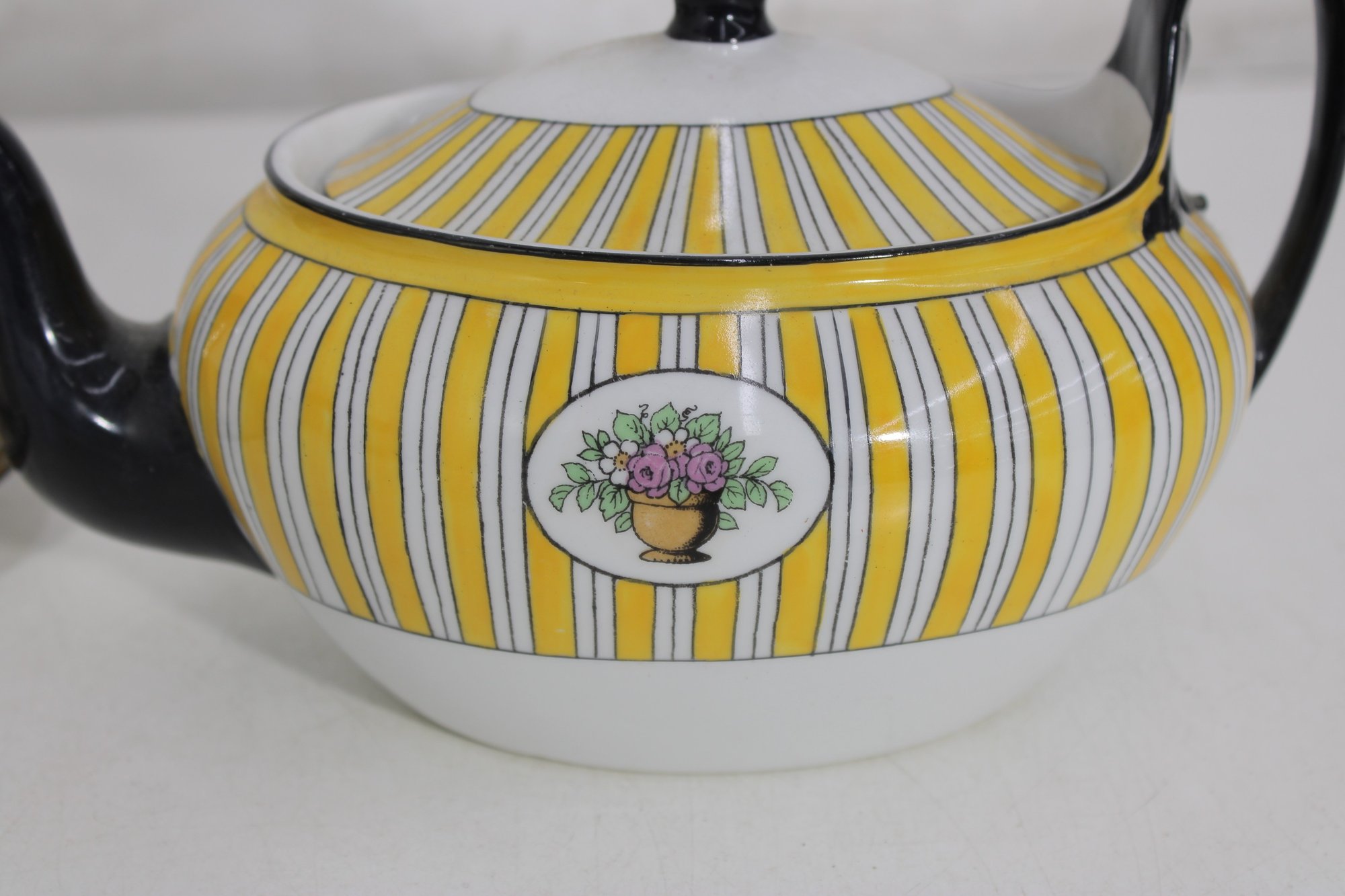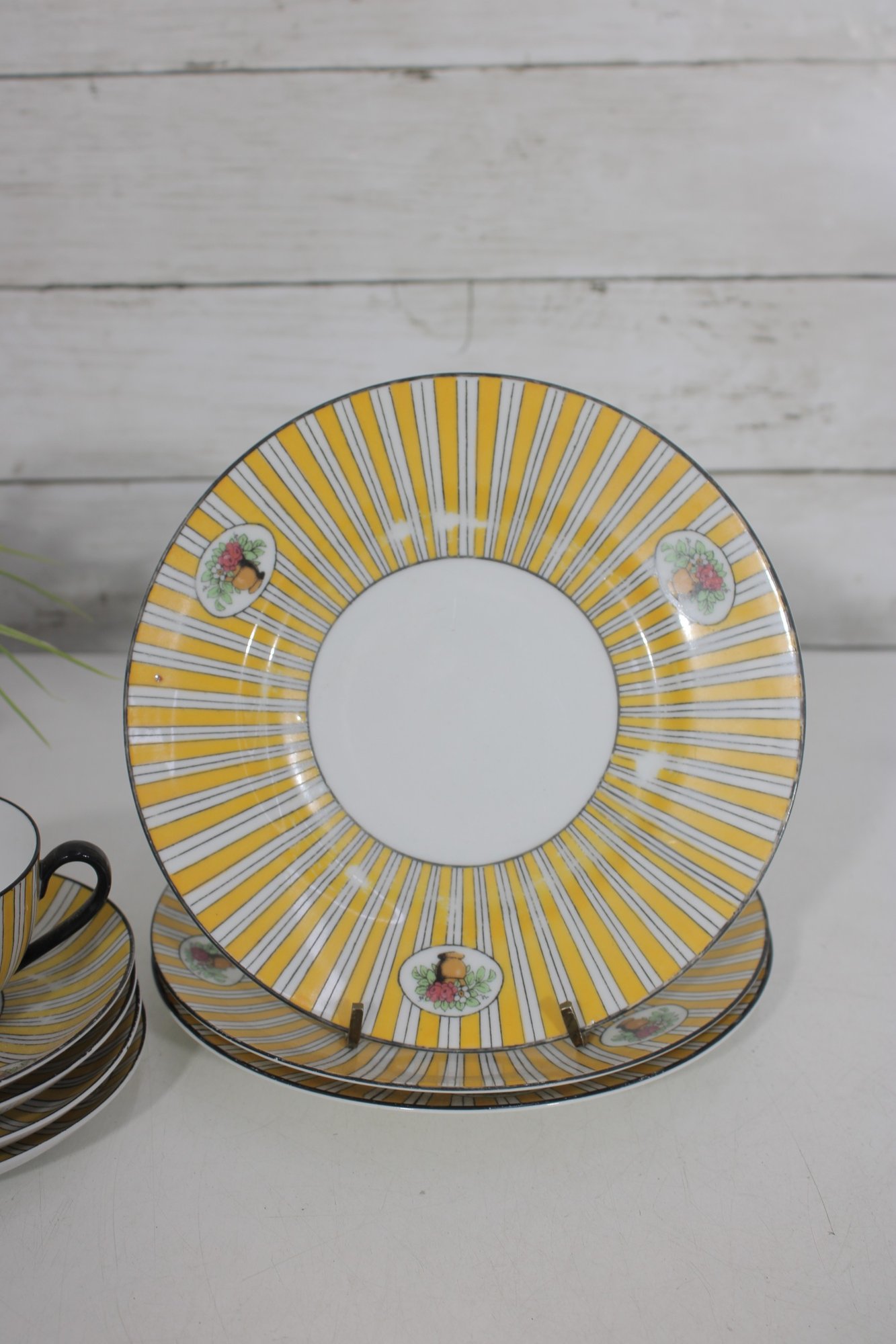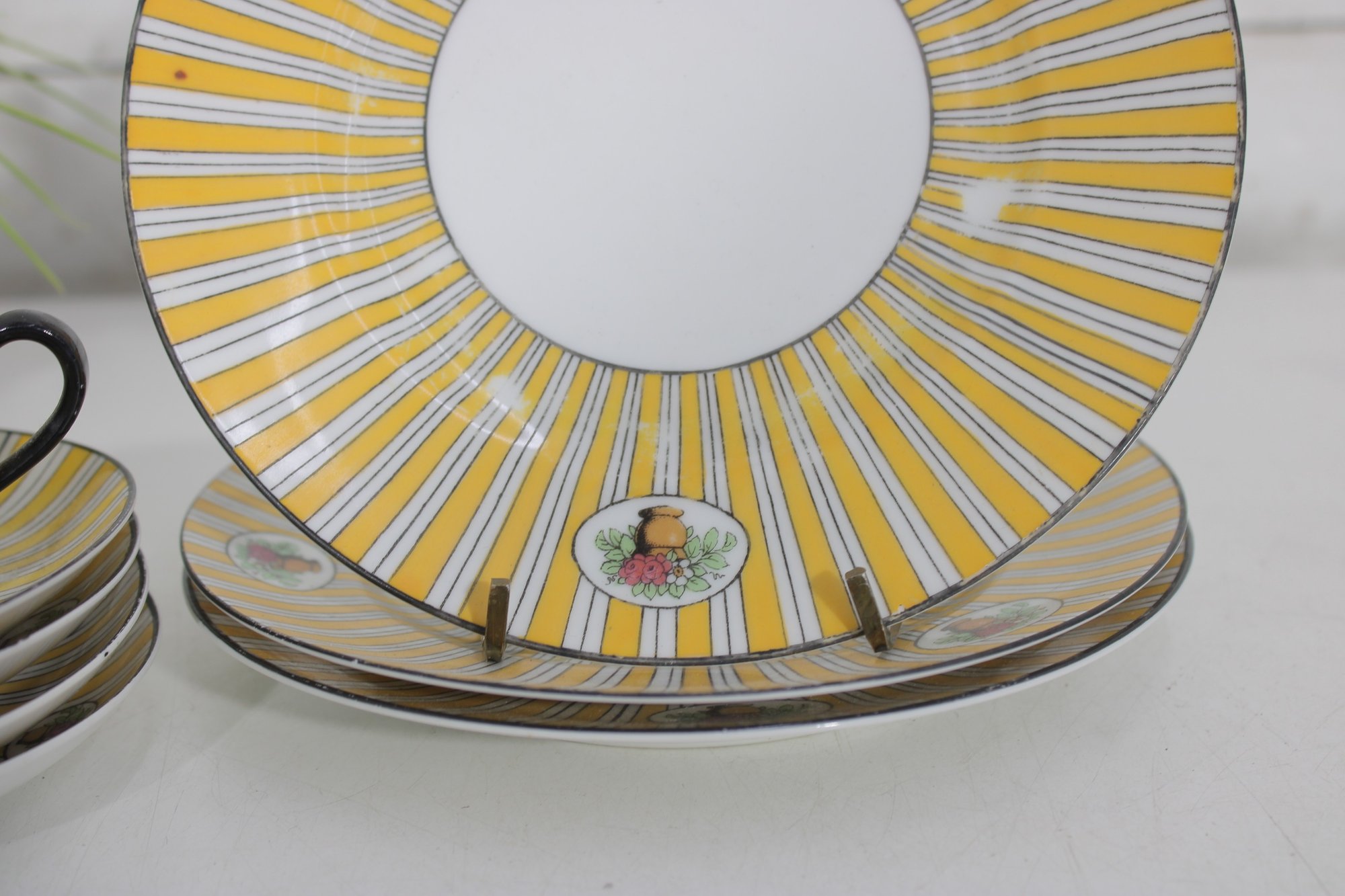 vintage Art Deco tea set by Phoenix China, made in Czechoslovakia, featuring a striking yellow and white striped design with delicate floral medallion accents. This charming porcelain set includes a teapot, matching cups with saucers, and coordinating plates, all showcasing classic geometric lines and refined Art Deco styling.