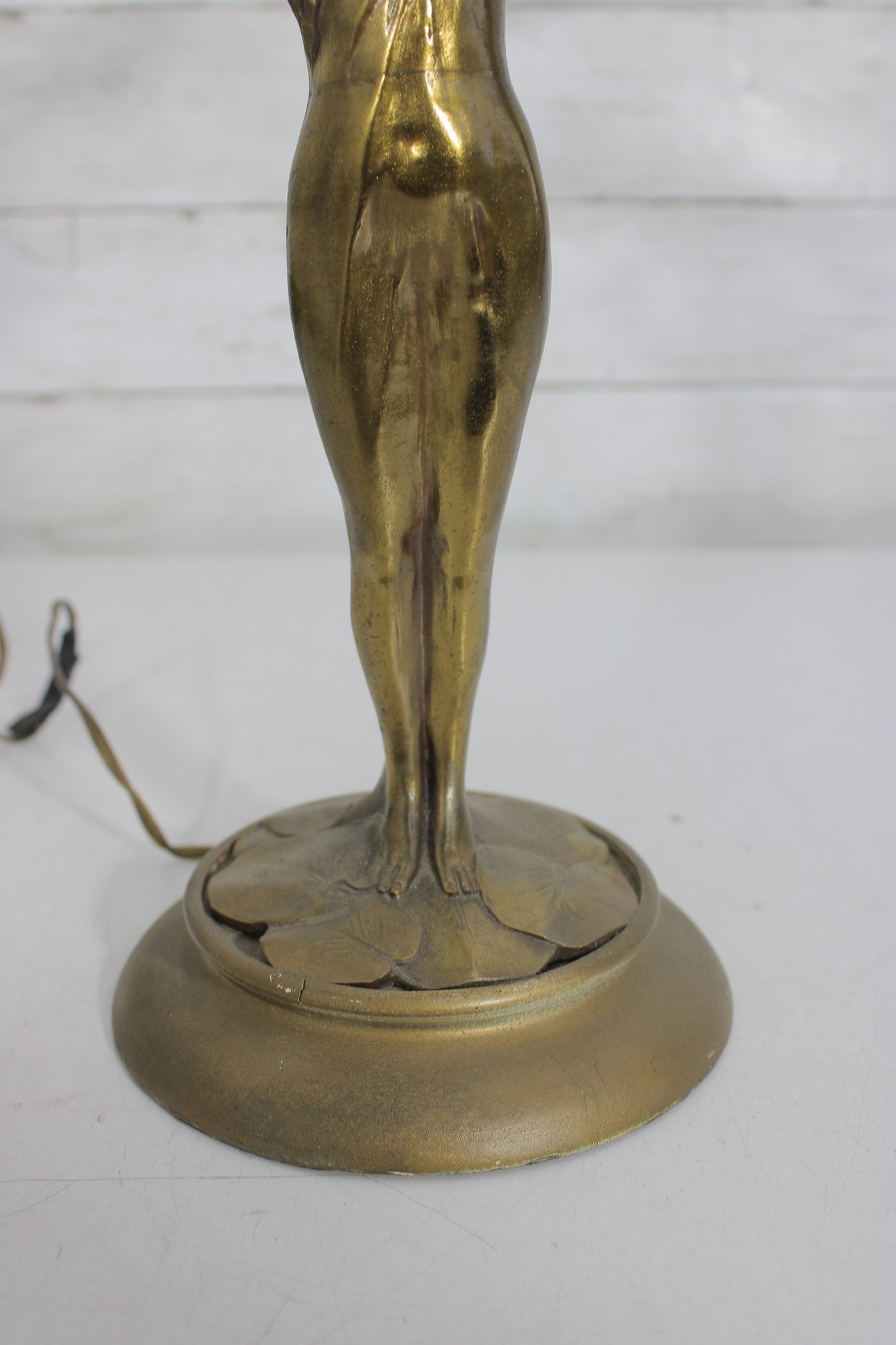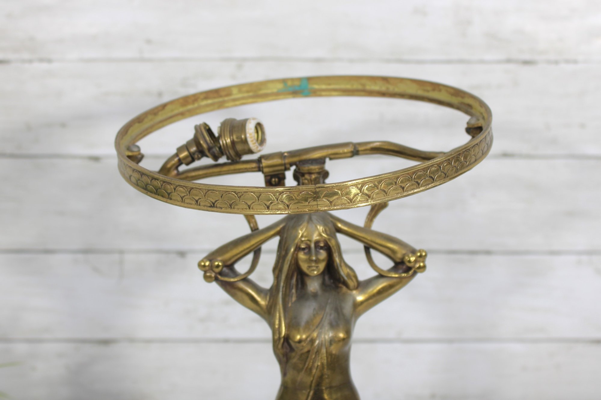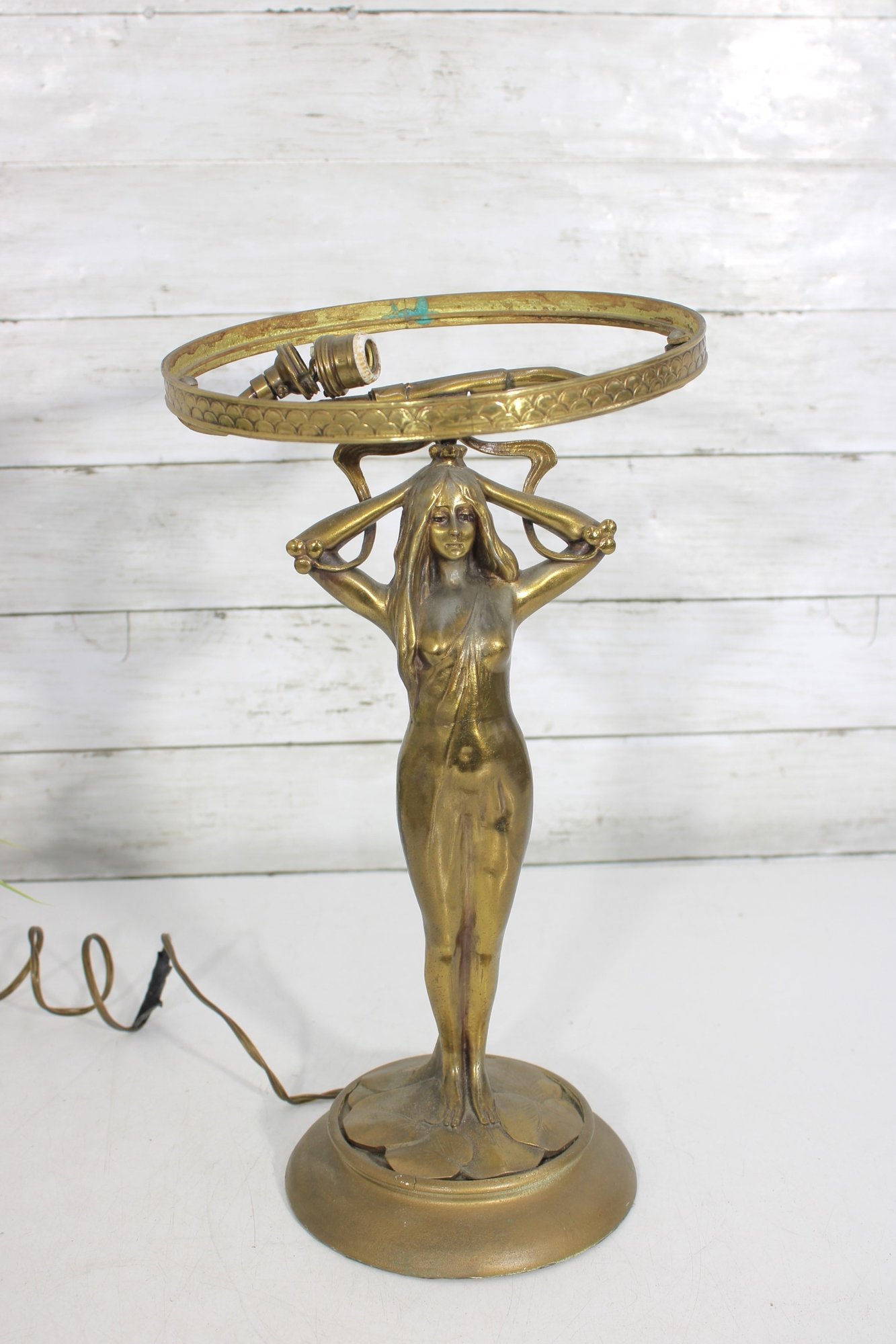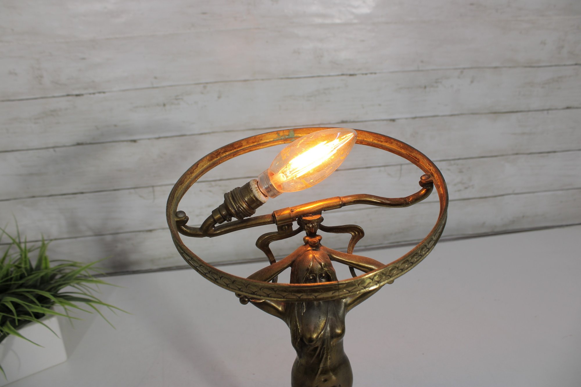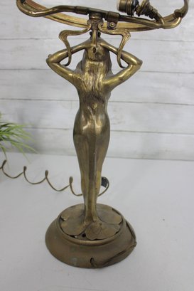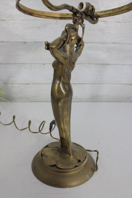 Art Deco style figural table lamp featuring a standing nude female figure holding an 8" round ring frame above her head. The sculptural form is finished in a warm antique brass tone with decorative detailing along the circular top.