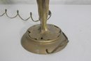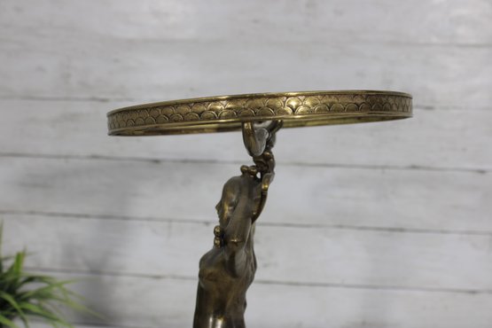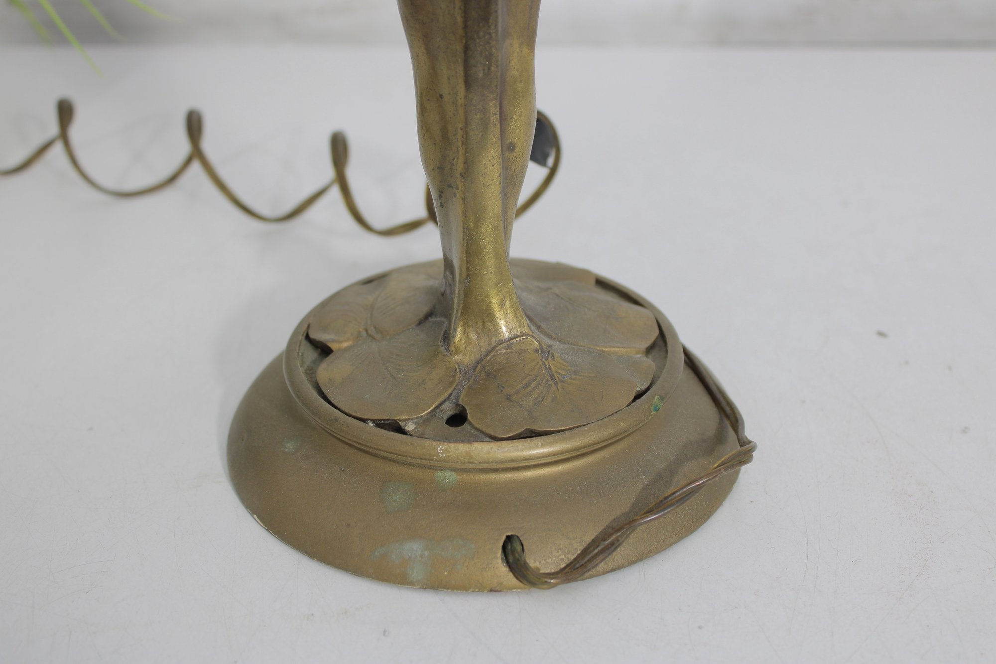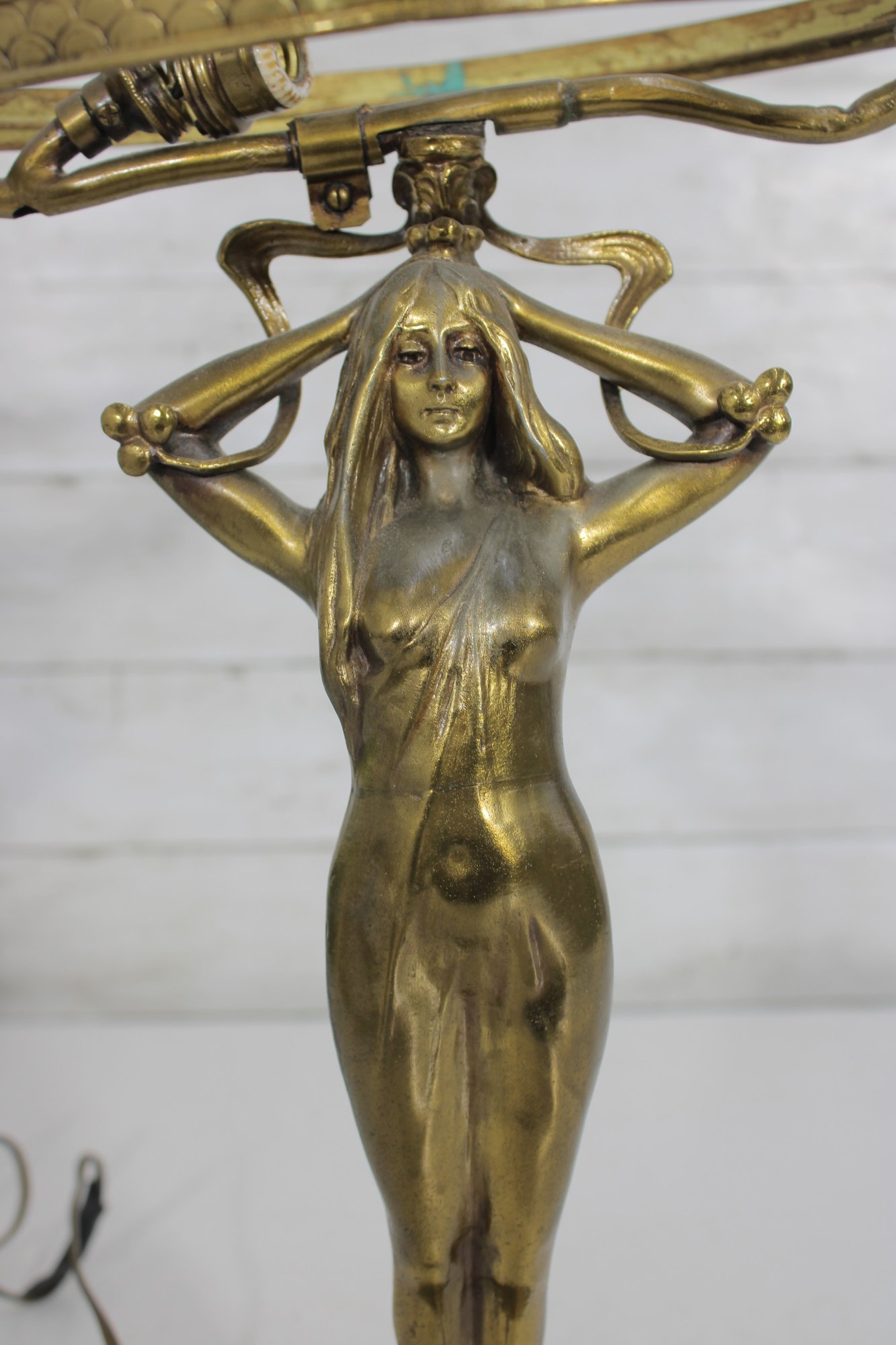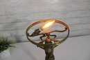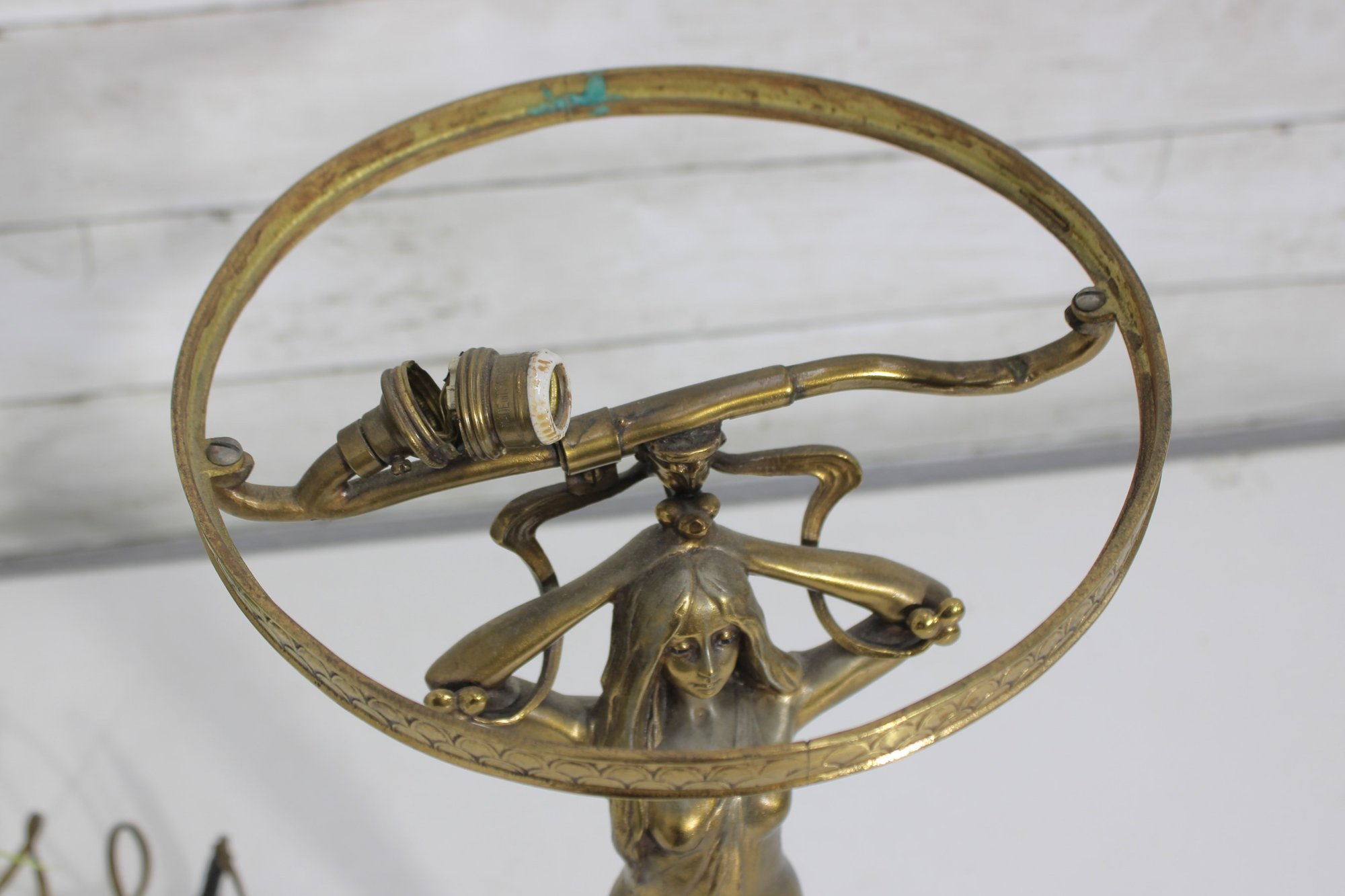 Art Deco style figural table lamp featuring a standing nude female figure holding an 8" round ring frame above her head. The sculptural form is finished in a warm antique brass tone with decorative detailing along the circular top.