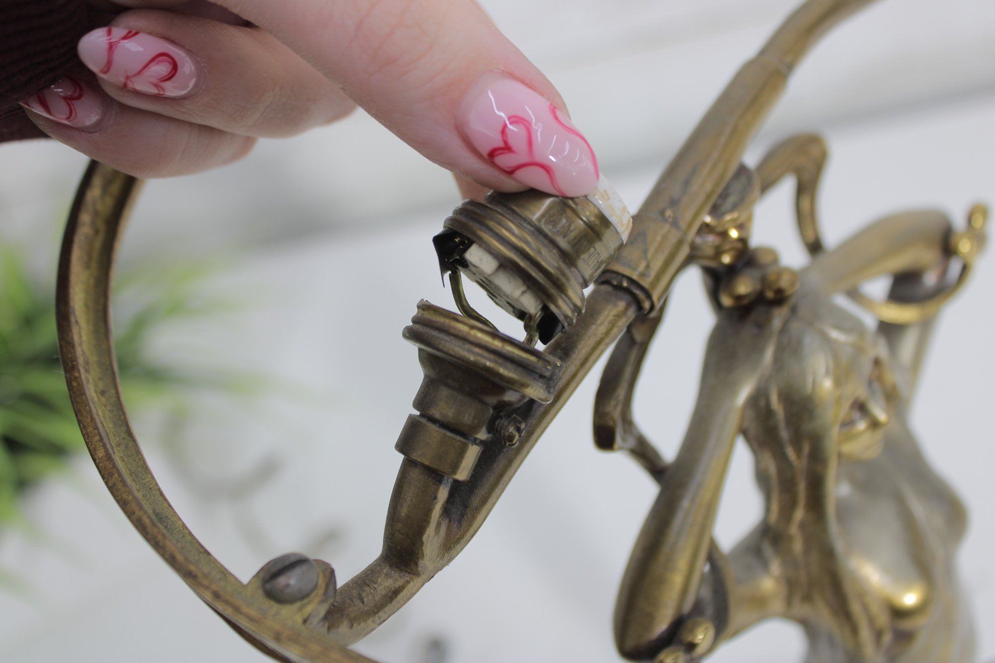 The figure stands gracefully on a round base, with arms raised to support the circular frame housing the socket and wiring. The lamp creates a dramatic silhouette and would make a bold decorative statement.