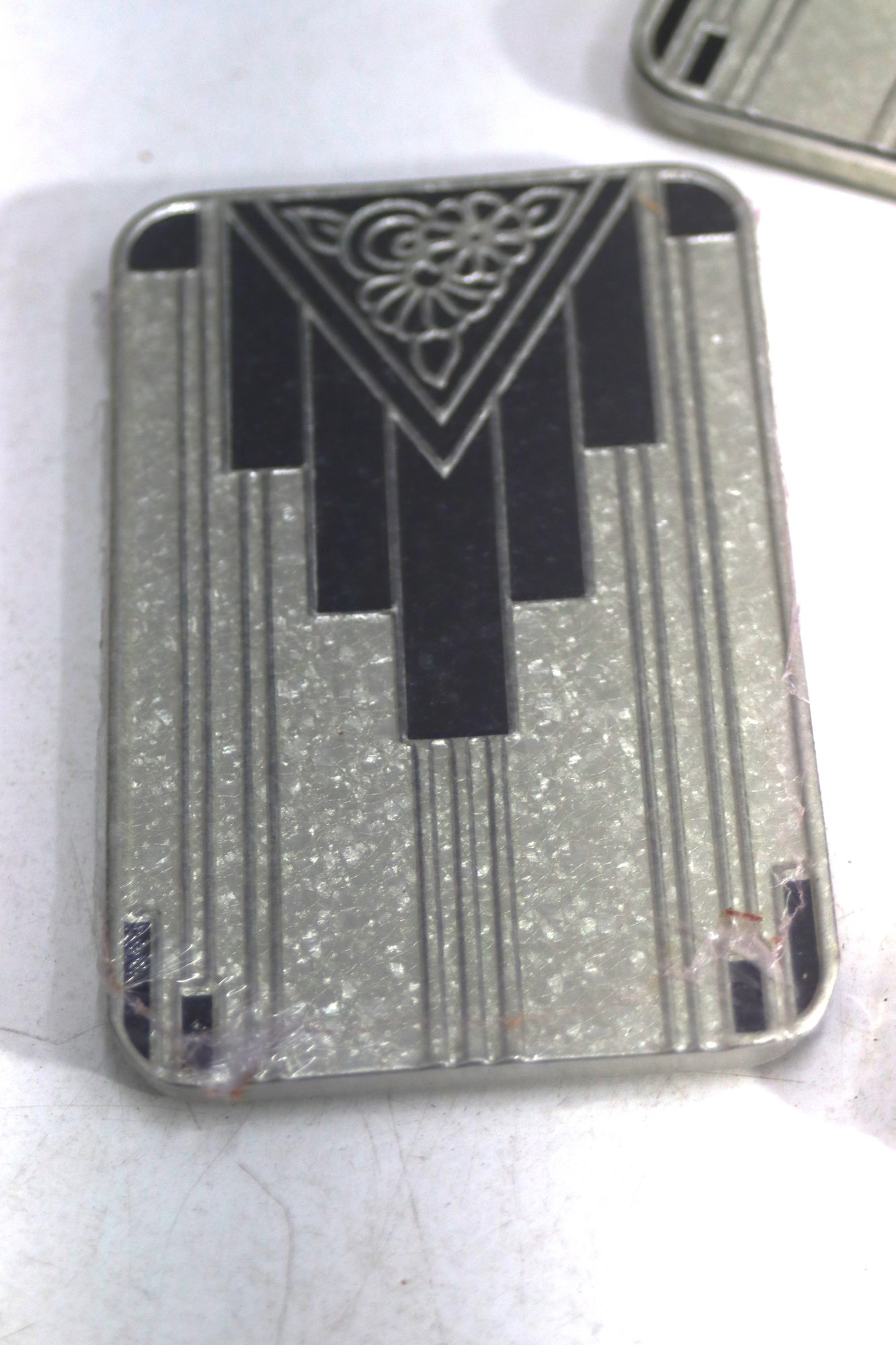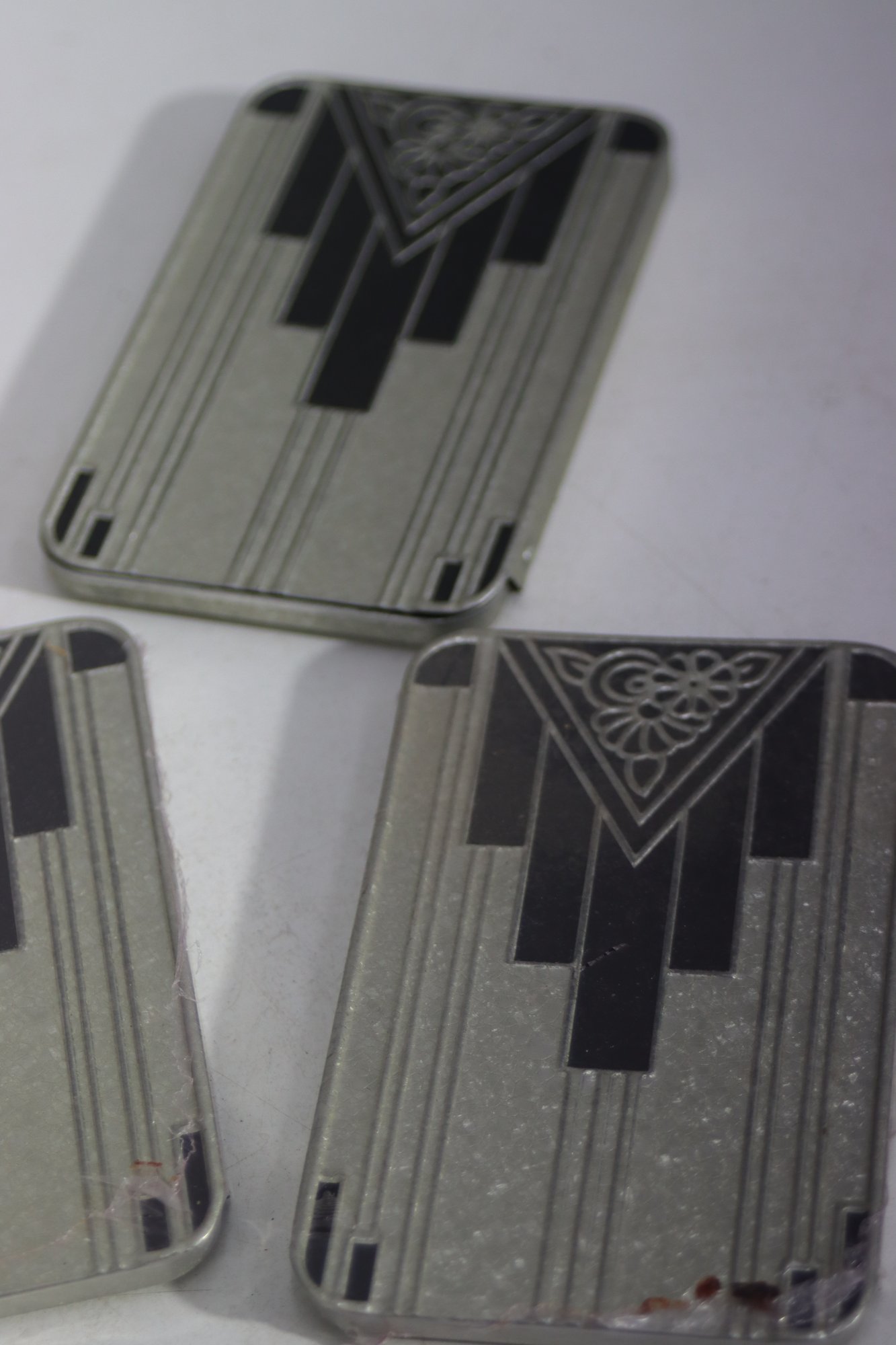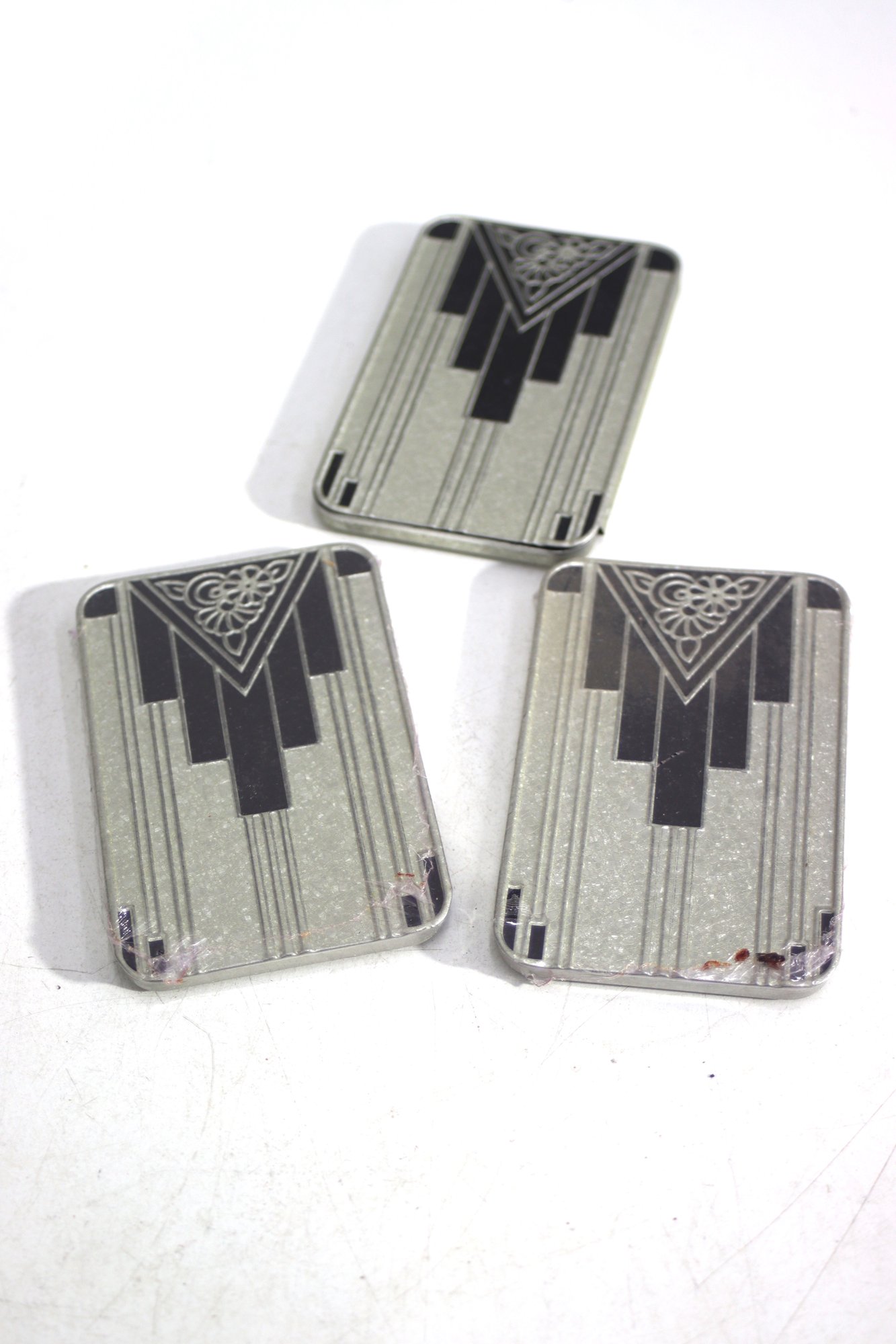 Set of three vintage-style sugar-free mint tins with an elegant Art Deco design. Each tin features a metallic silver body with a black geometric and floral pattern, reminiscent of the roaring twenties aesthetic.