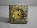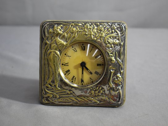 this exquisite Art Deco dresser clock. Encased in a luxurious velvet frame, this vintage piece exudes elegance and charm. The clock features a beautifully detailed brass front with a floral and figurative motif, capturing the essence of the Art Deco era. The dial displays classic Roman numerals, adding to its timeless appeal.