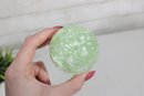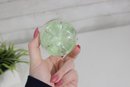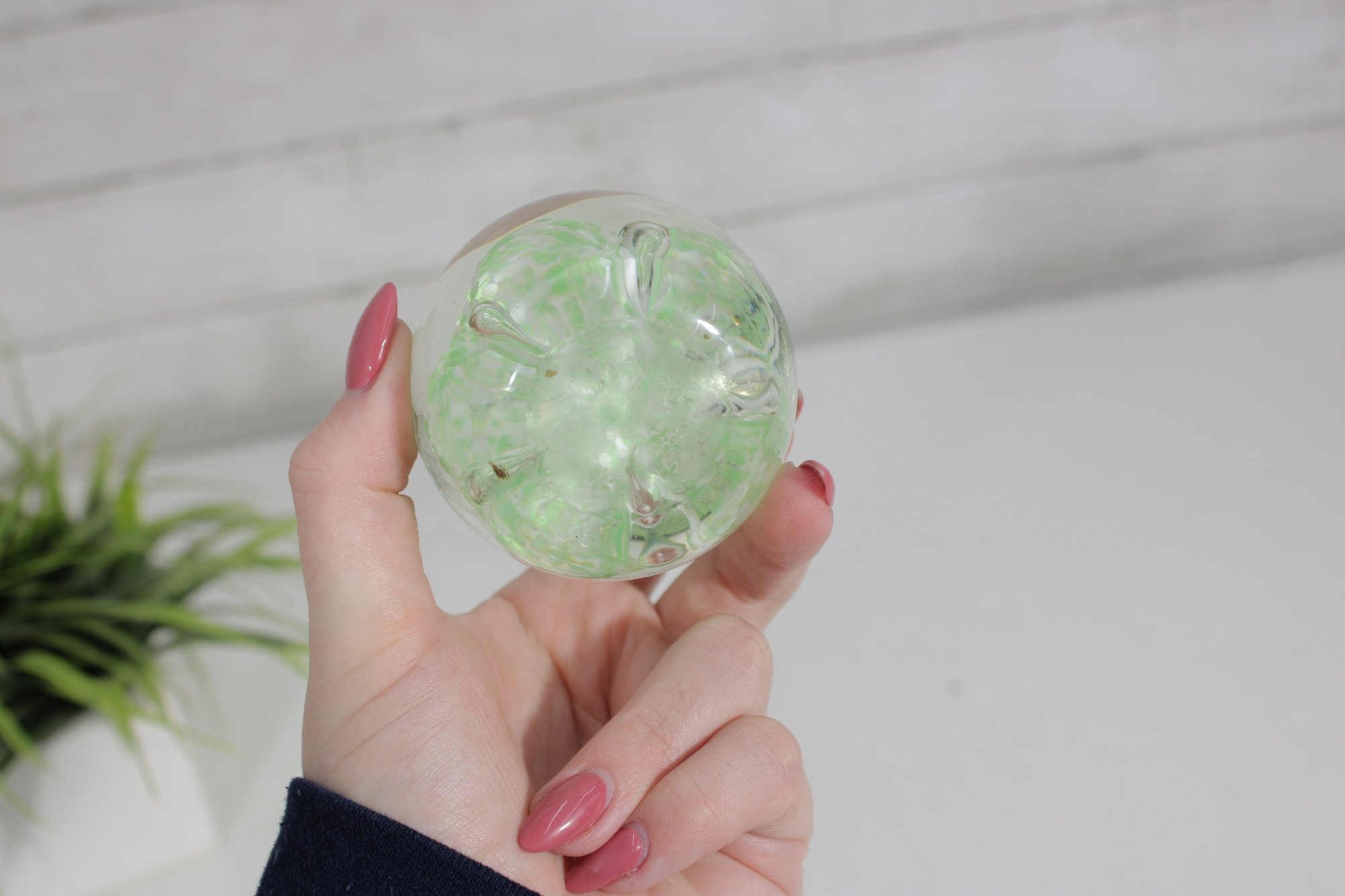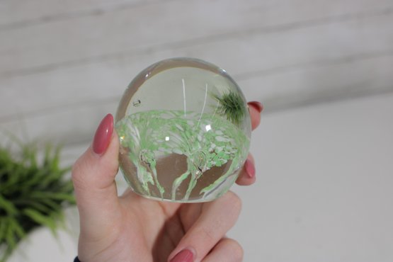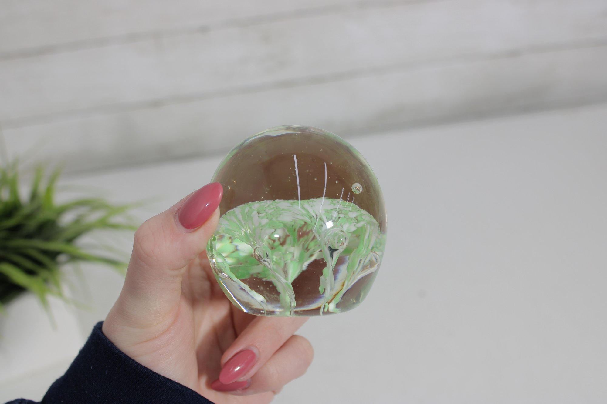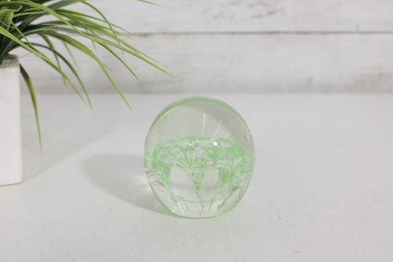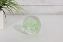 art glass paperweight featuring a delicate trumpet lily floral design in soft green and white tones. Measuring approximately 3 inches tall, this piece displays a beautifully balanced composition of stylized flowers rising within a clear glass sphere.