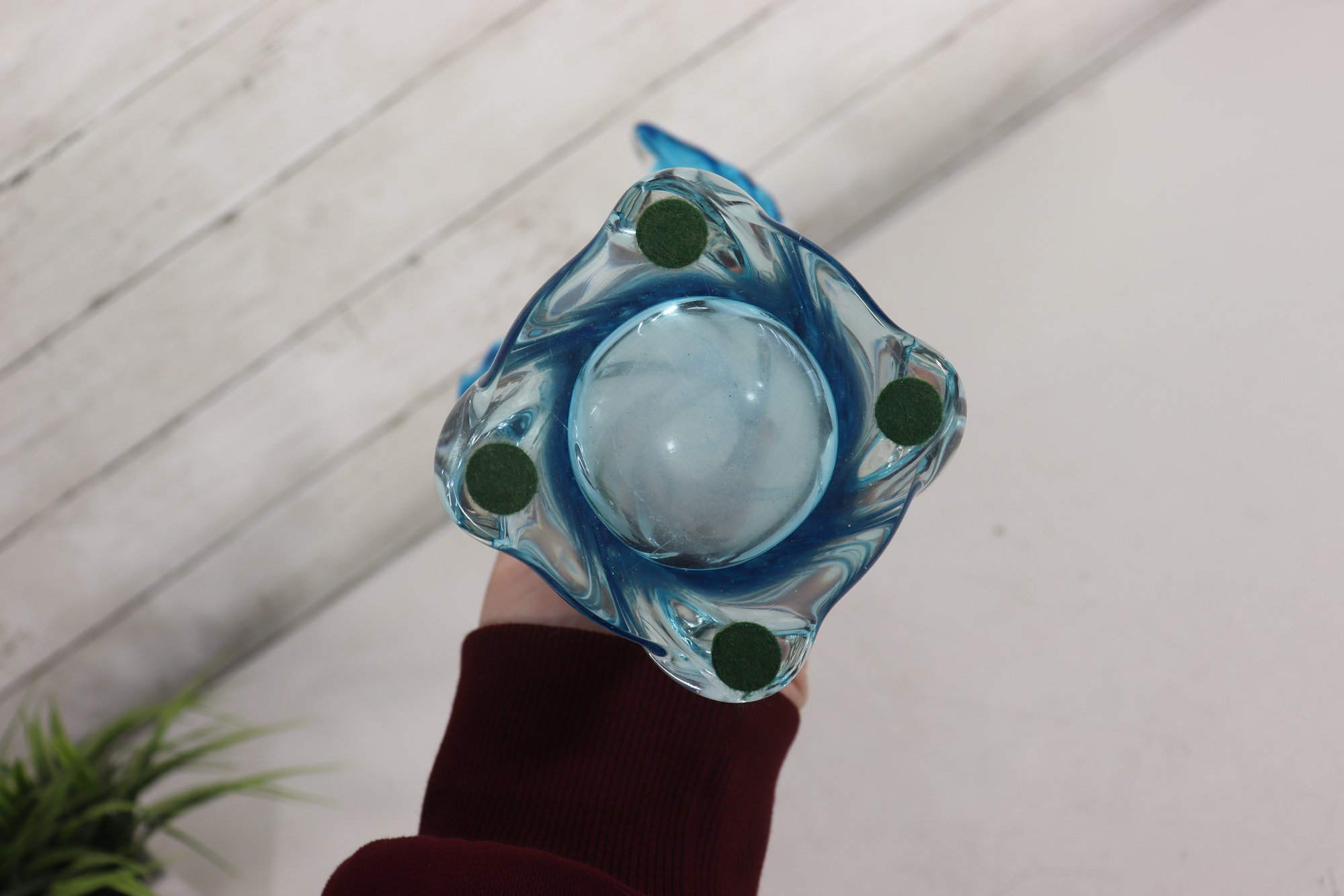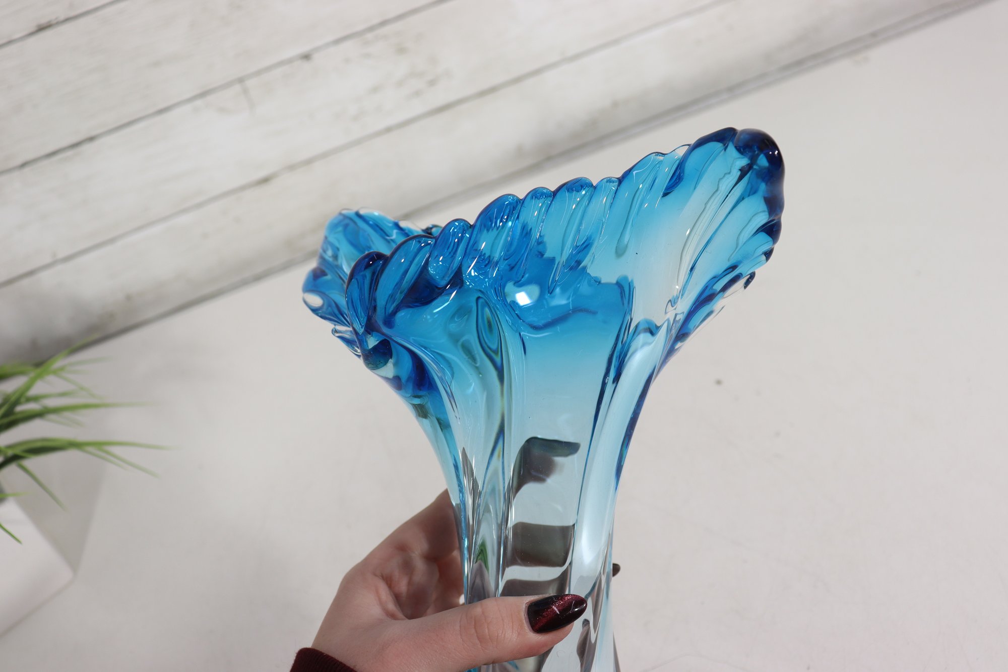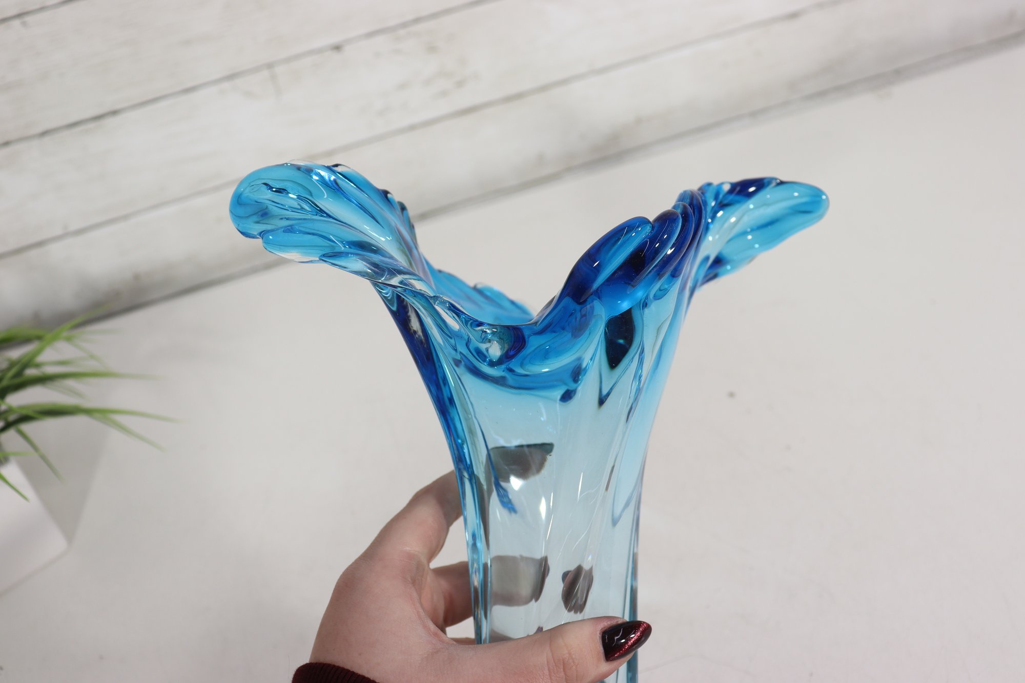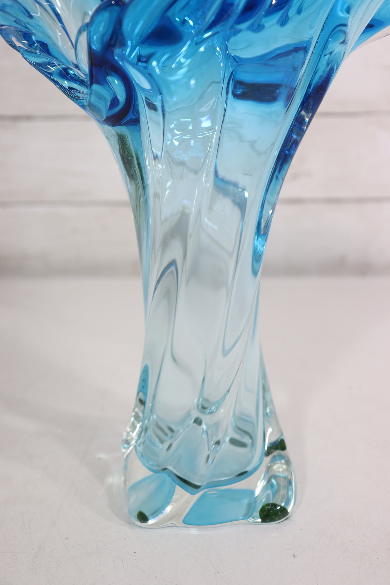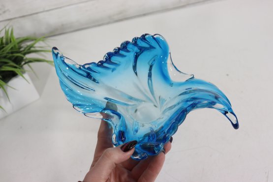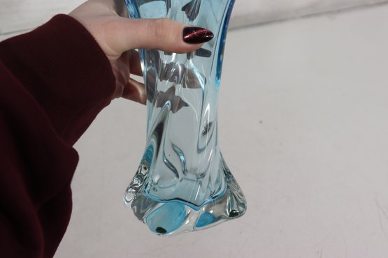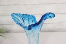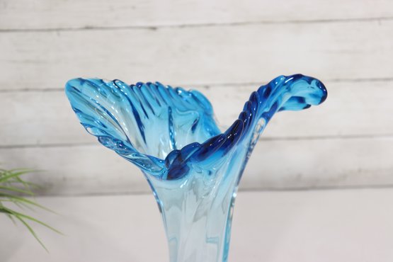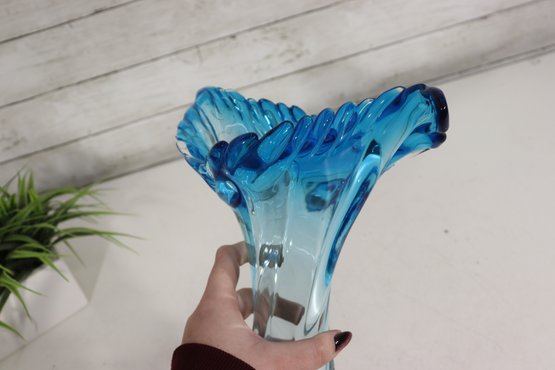 a striking art glass vase featuring a fluid sculptural form and dramatic ruffled rim. Rendered in a beautiful aqua blue tone, the glass flows organically from the base upward, creating elegant movement and visual depth.