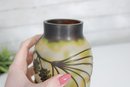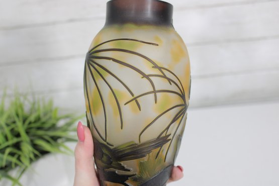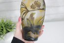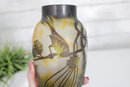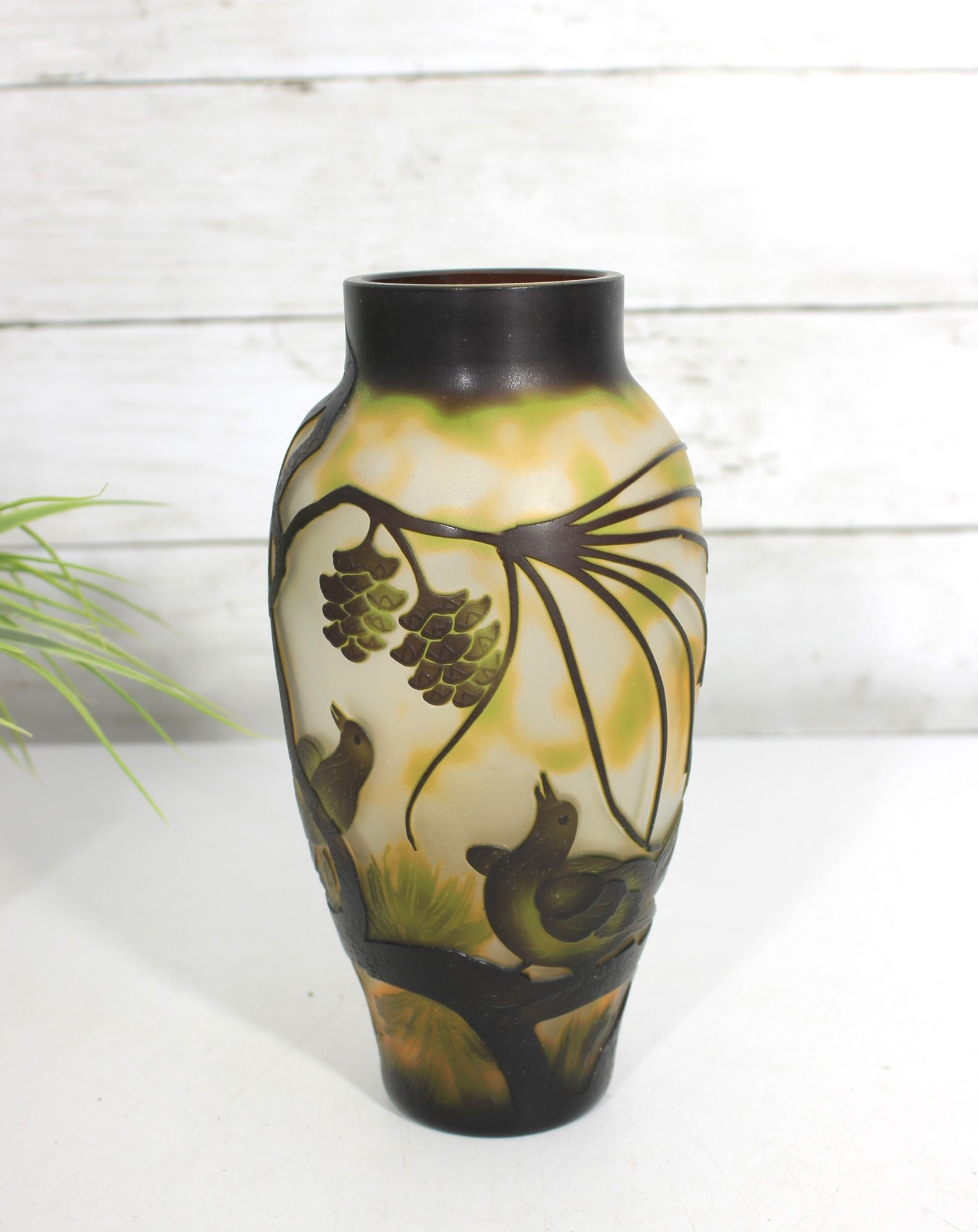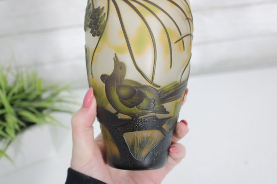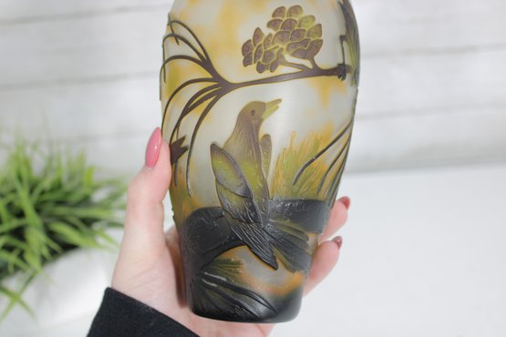 Beautiful Art Nouveau style cameo glass vase featuring an elegant nature-inspired design with birds perched among pine branches and cones. The vase showcases a softly mottled yellow and cream background with finely detailed dark etched overlay, creating a striking contrast and depth.